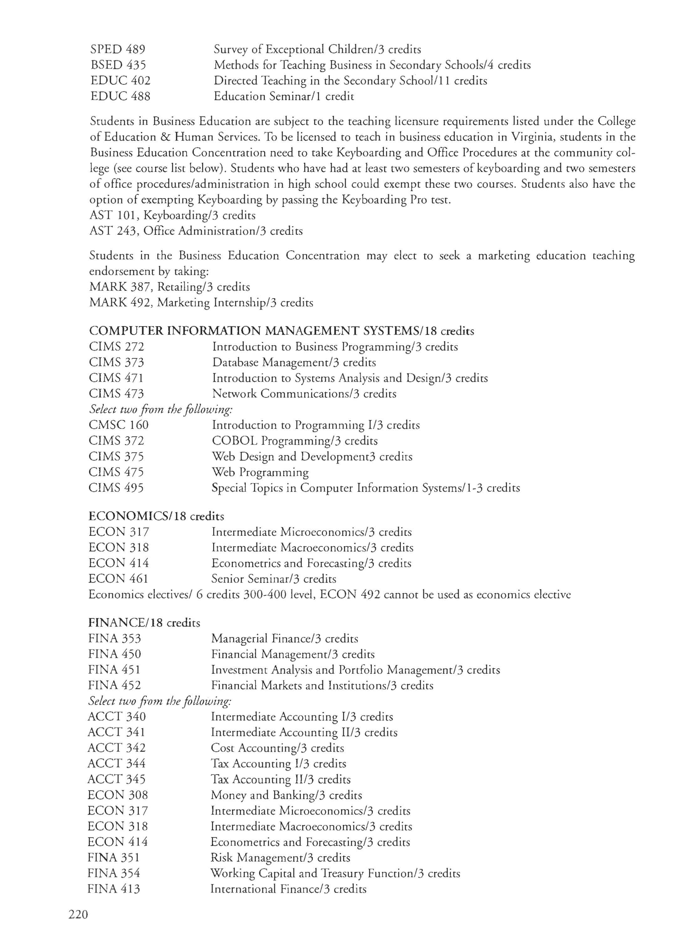 Accounting, Economics, Finance, and Real Estate Management, Marketing, Retailing, Computer Management Systems, and Business Education Military Science
