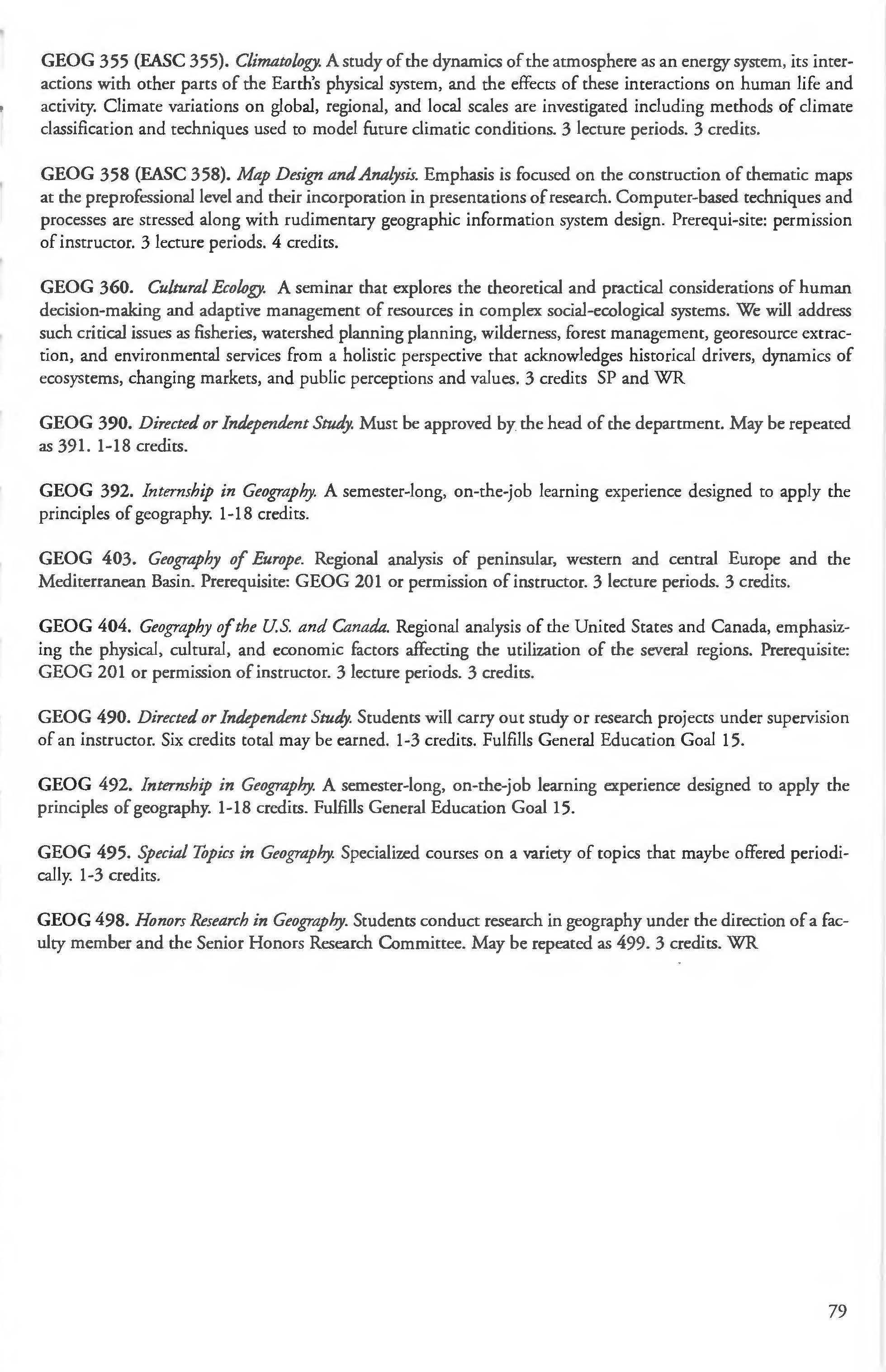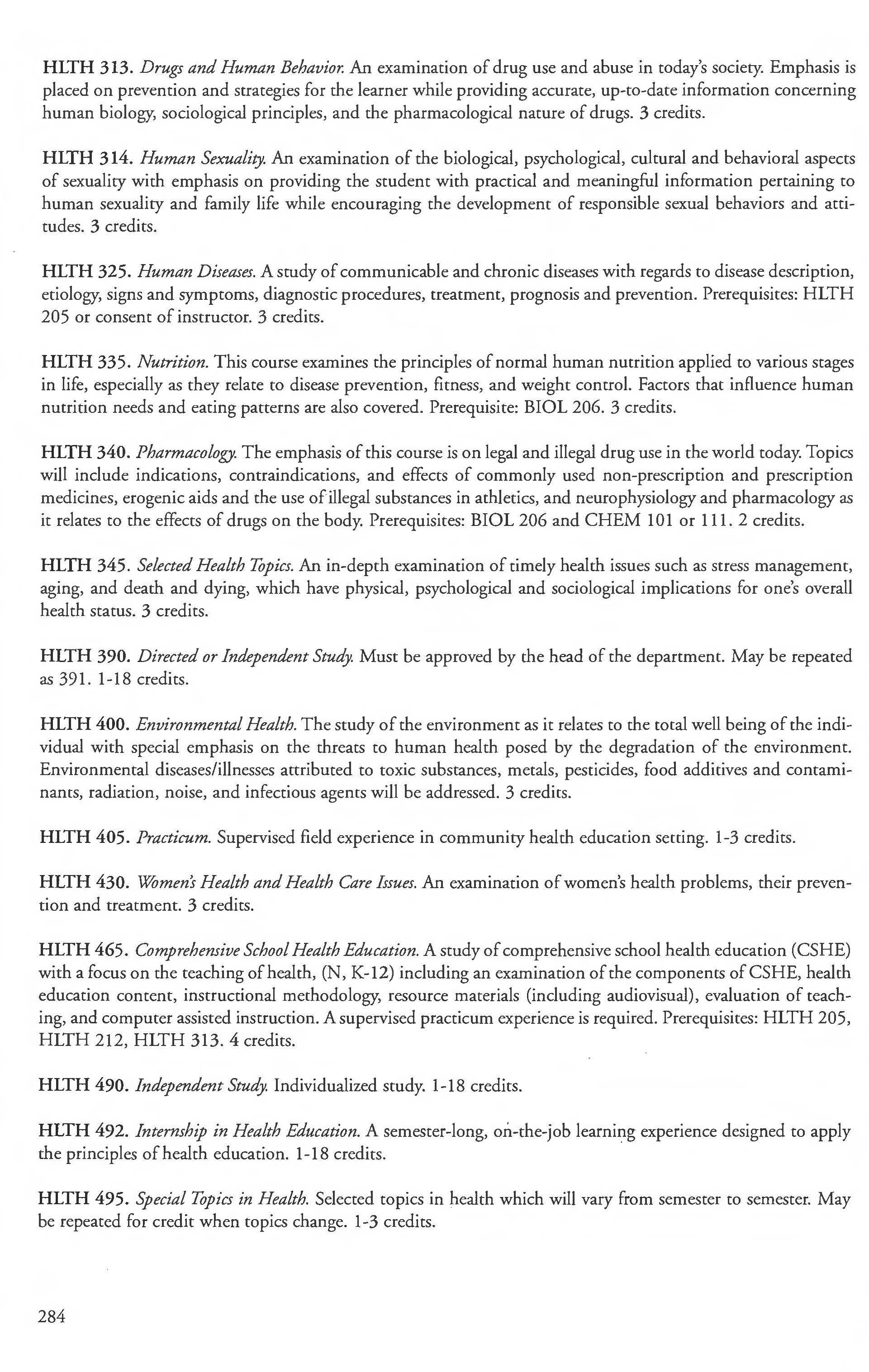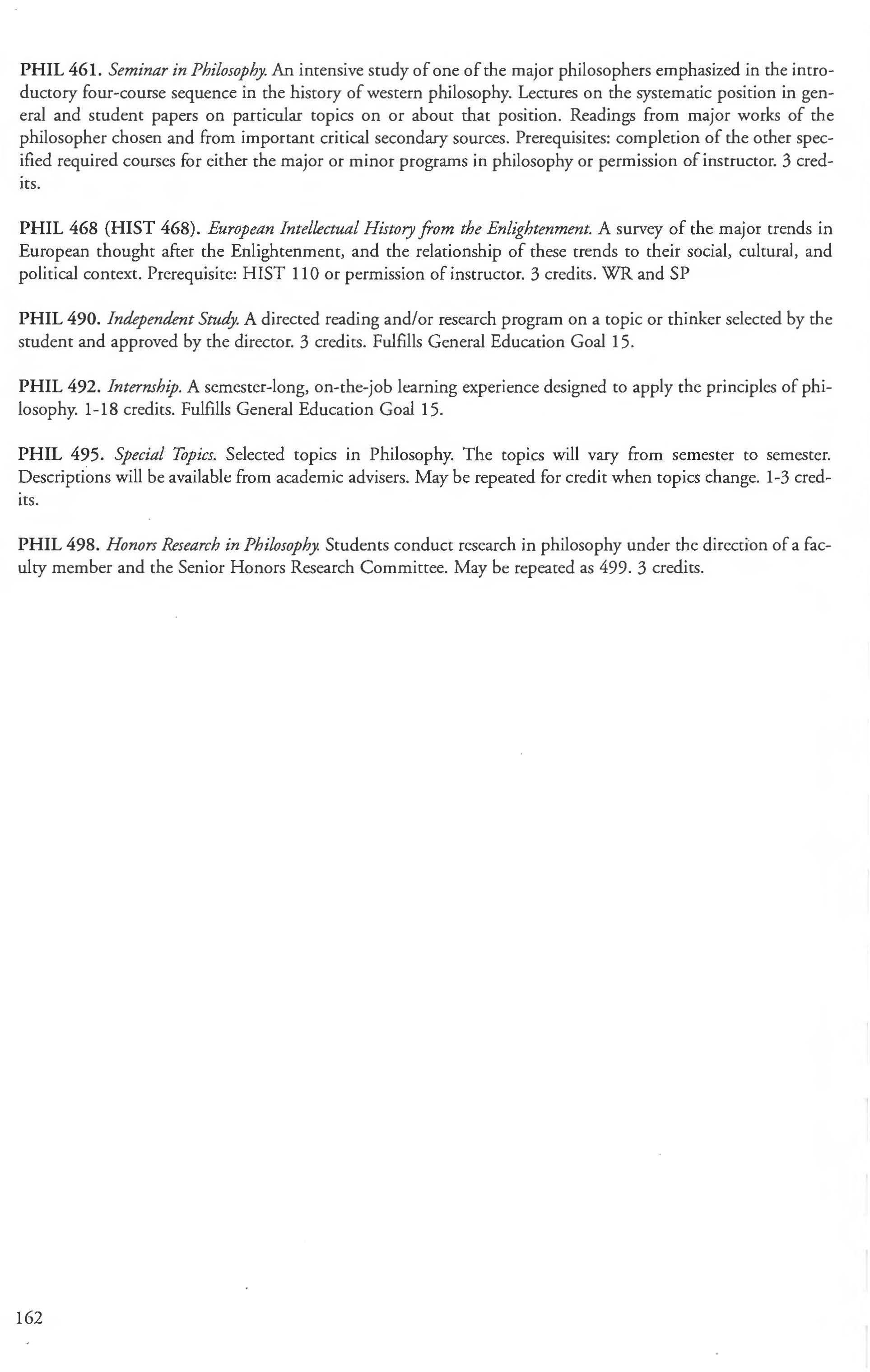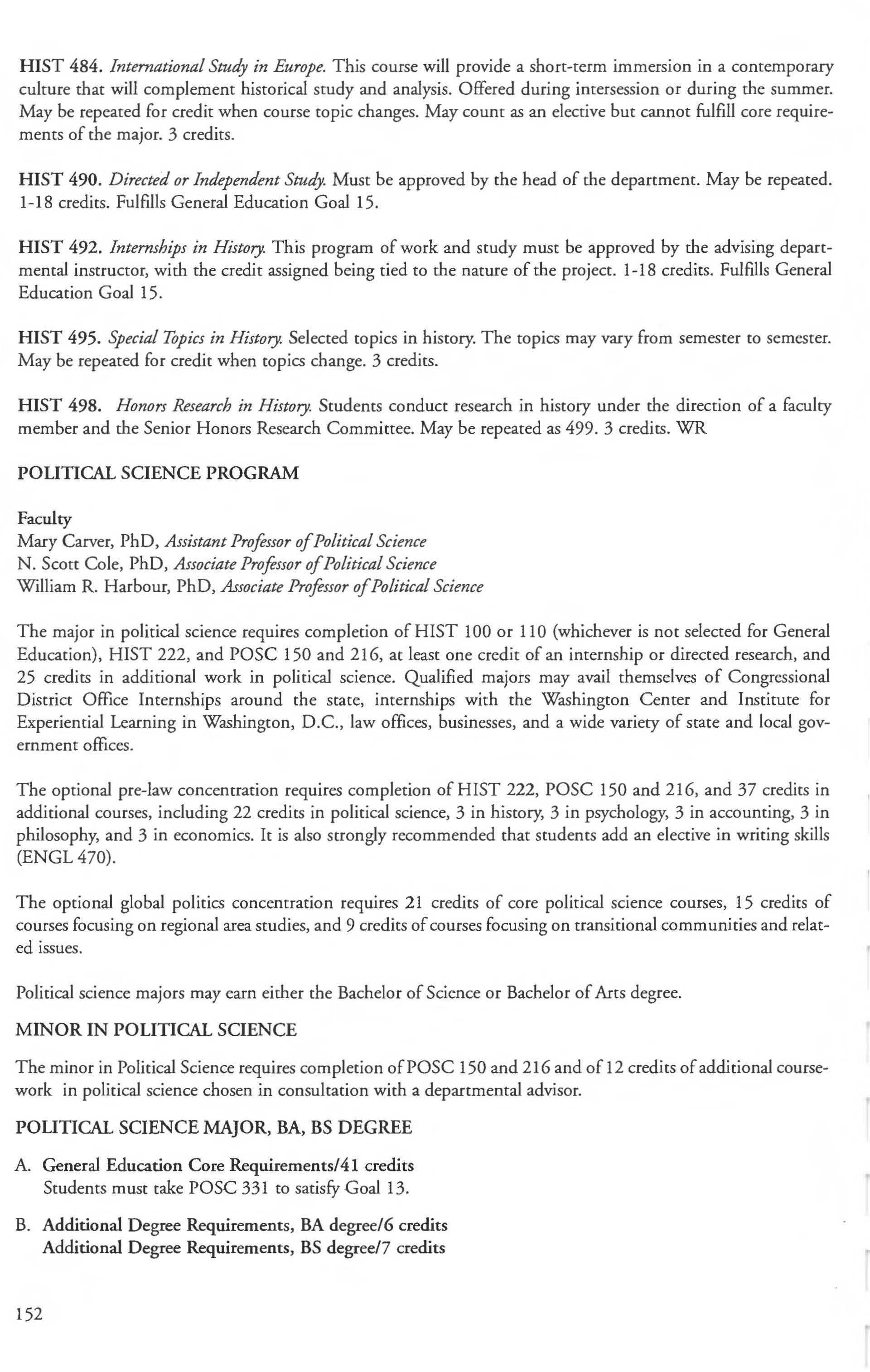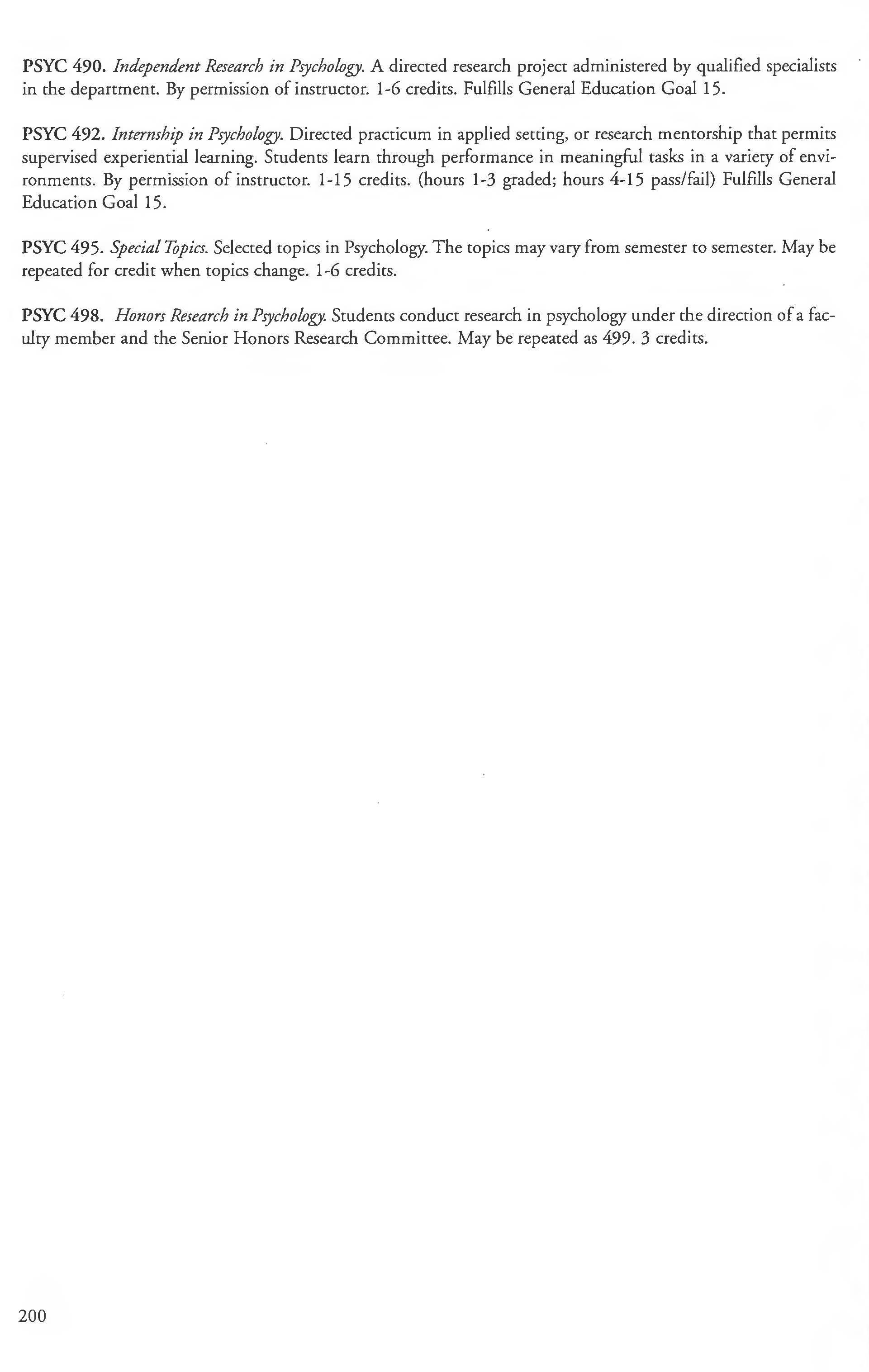 Other courses offered: Internships (1-18 credits) 292, 392, 492; Directed or Independent Study (1-18 credits) 390, 391, 490; Seminar 461; Honors Research- 498, 499; Special Topics (1-6 credits) 295, 495, 595; Study Abroad (1-18) 311, 312.