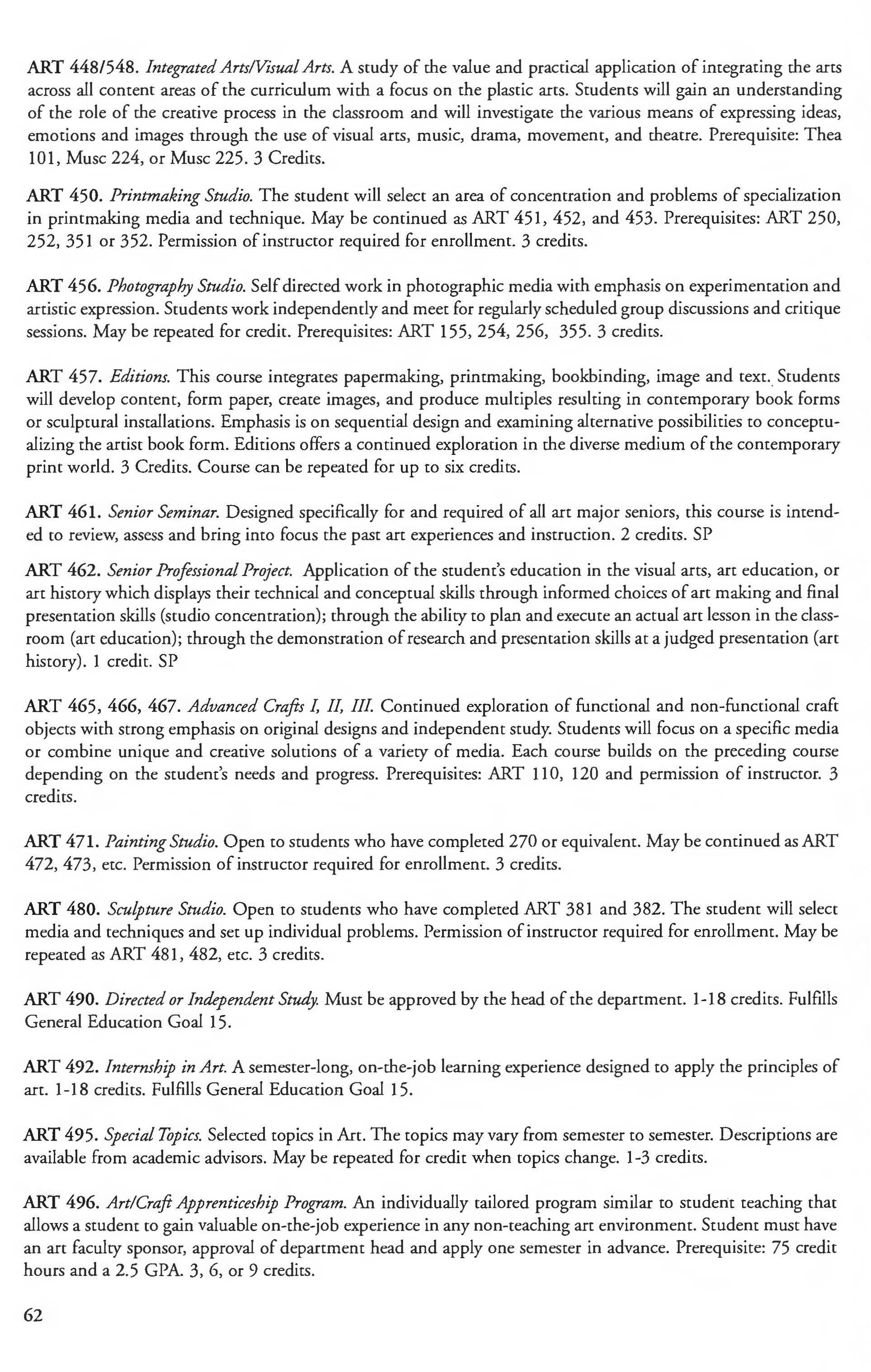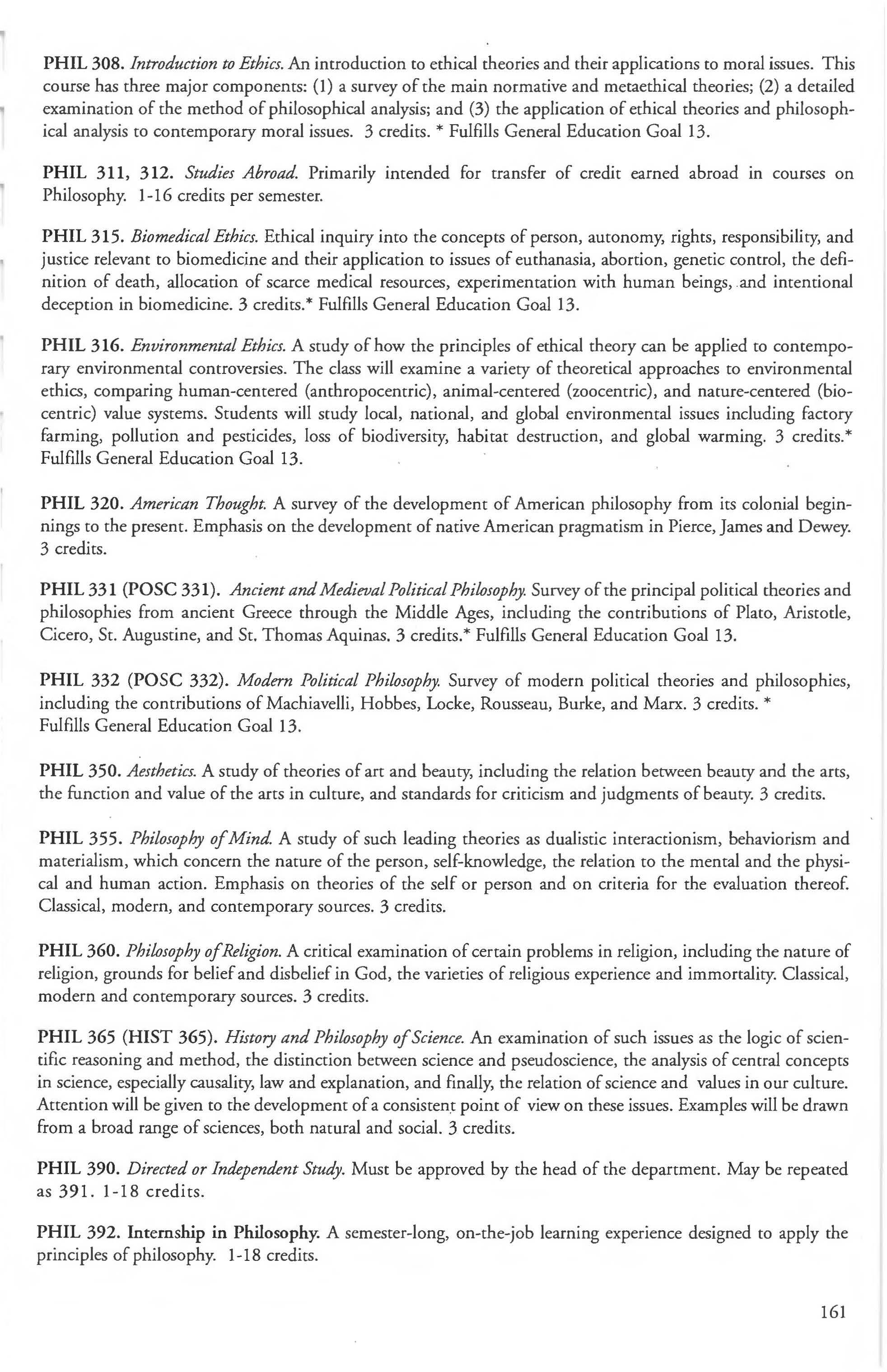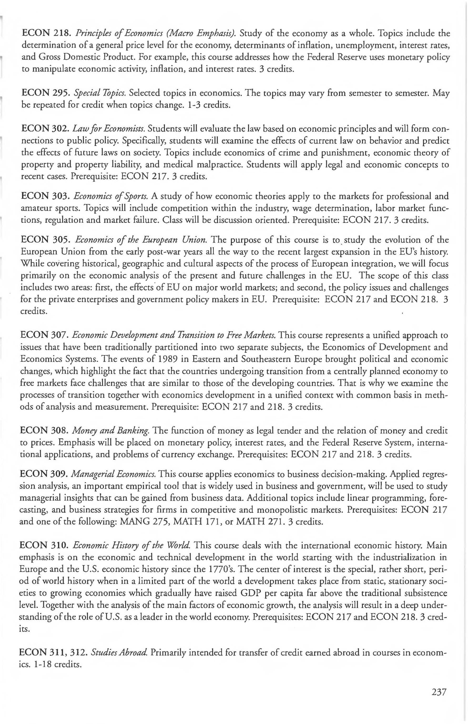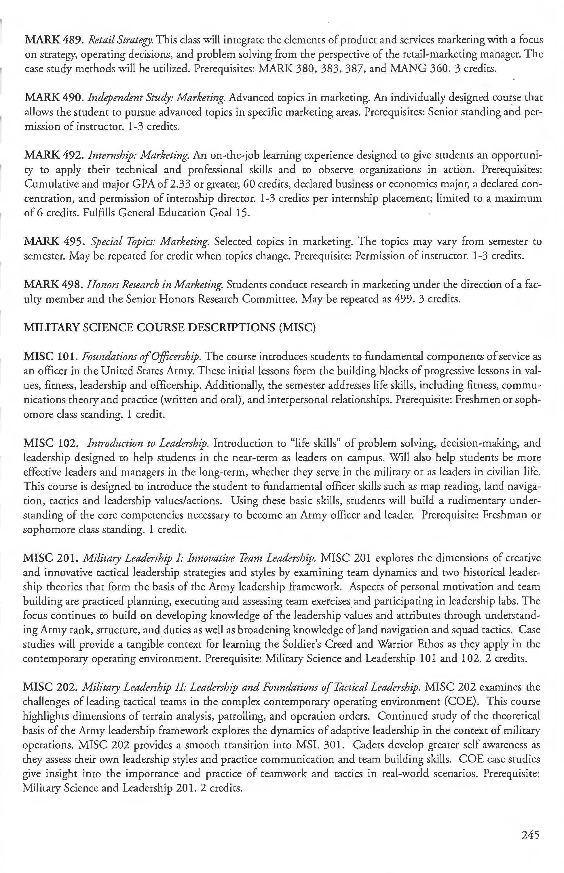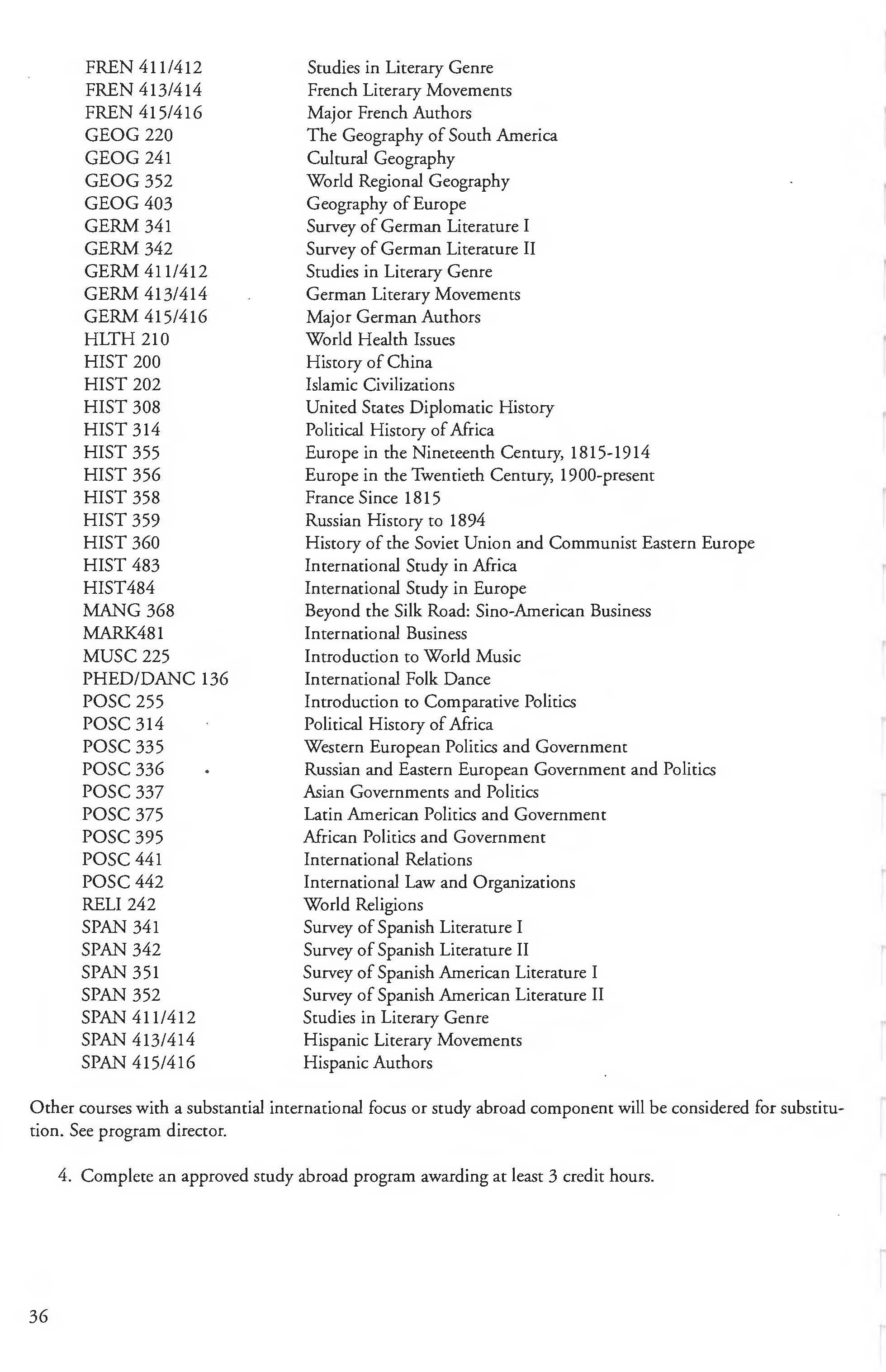 Other courses offered: Internships (1-18 credits) 292, 392, 492; Directed or Independent Study (1-18 credits) 390, 391, 490; Seminar 461; Honors Research- 498, 499; Special Topics (1-6 credits) 295, 495, 595; Study Abroad (1-18) 311, 312.