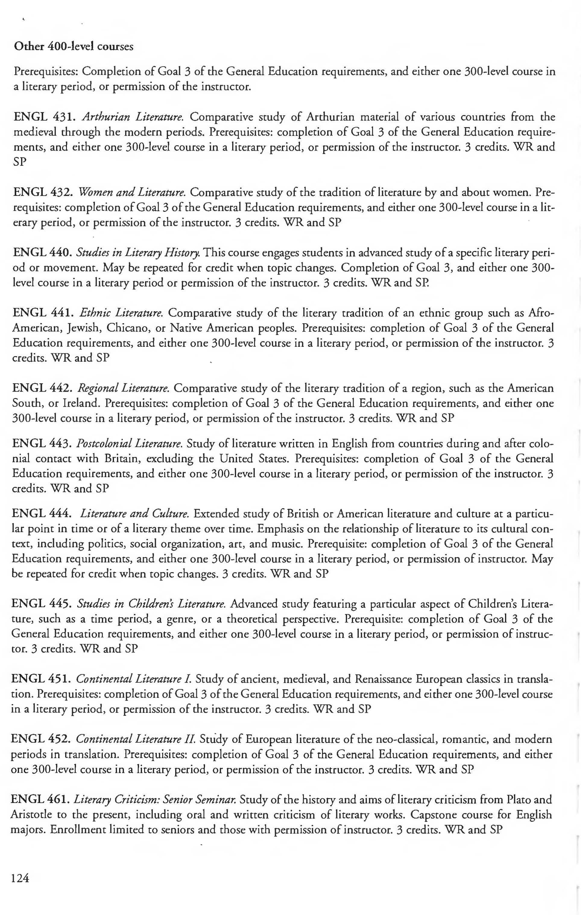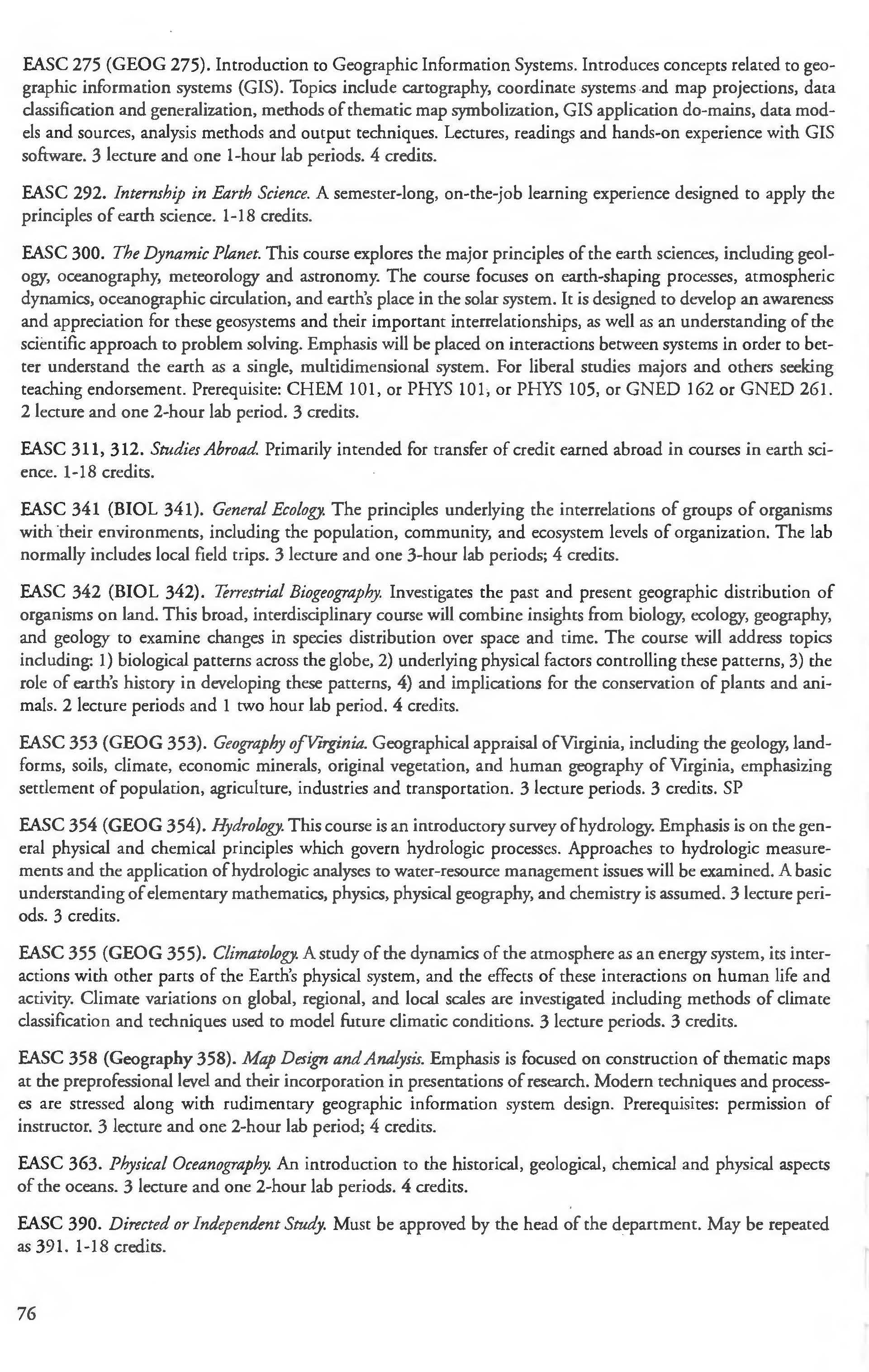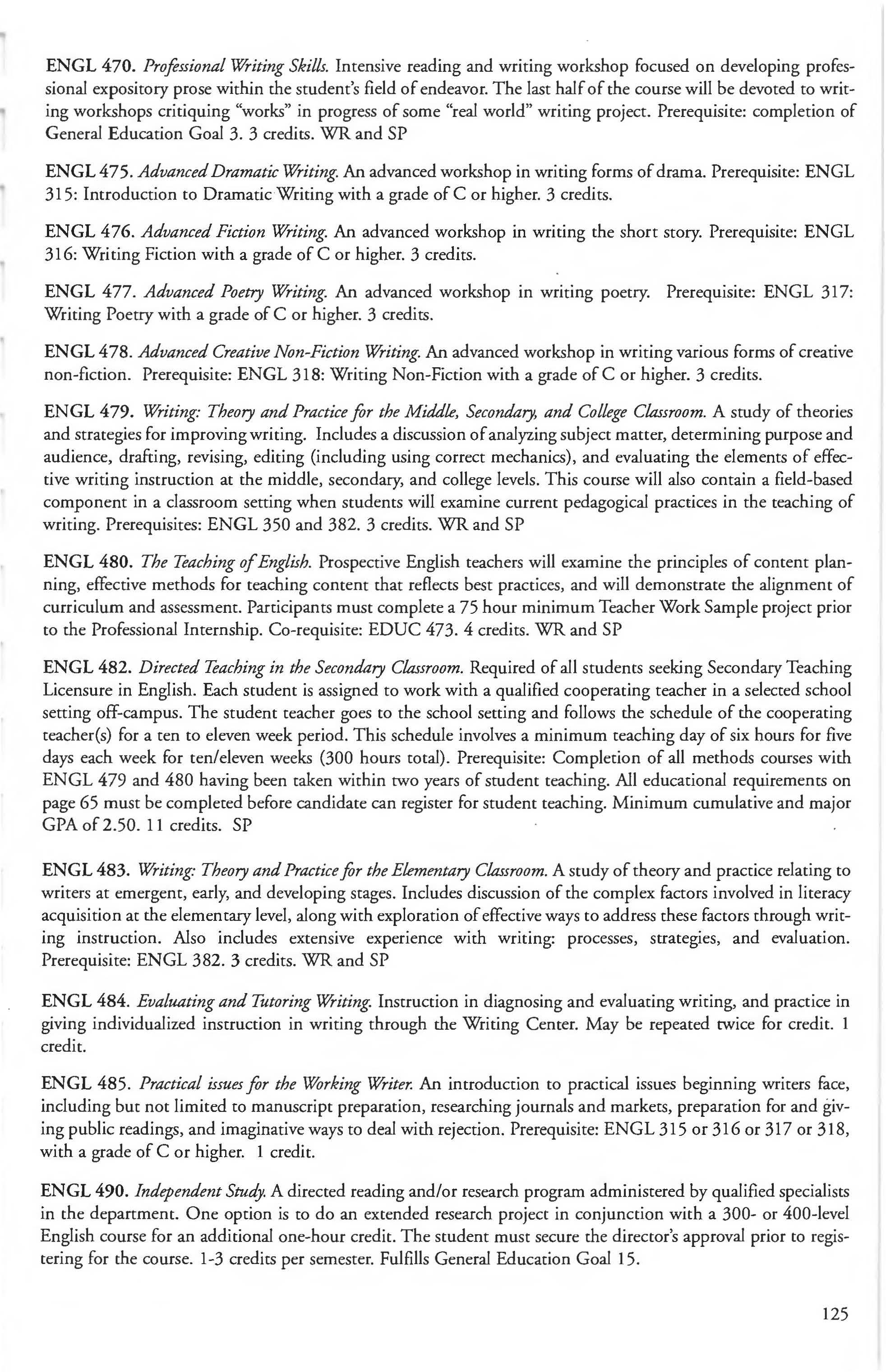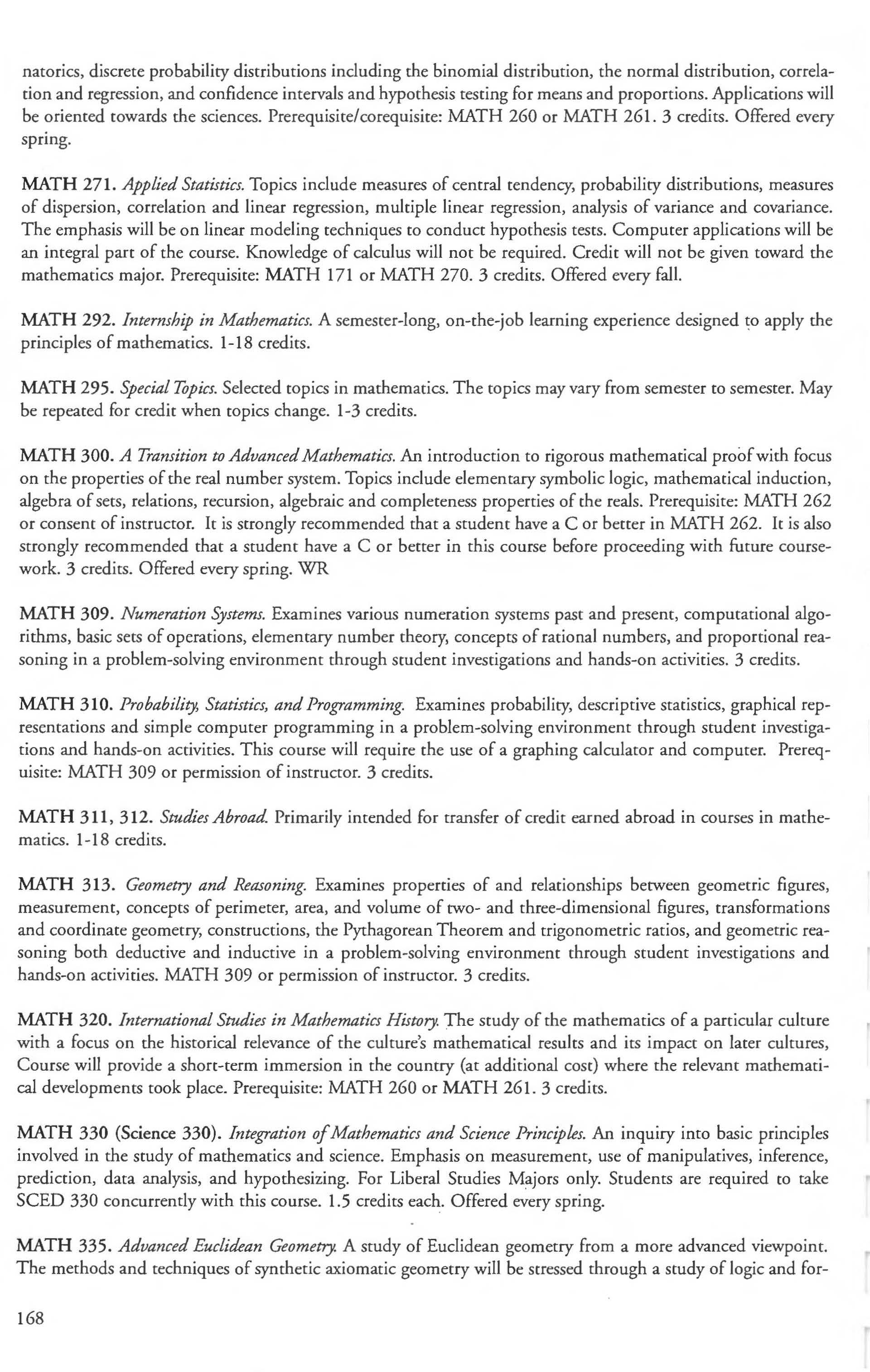 Other courses offered: Internships (1-18 credits) 292, 392, 492; Directed or Independent Study (1-18 credits) 390, 391, 490; Seminar 461; Honors Research- 498, 499; Special Topics (1-6 credits) 295, 495, 595; Study Abroad (1-18) 311, 312.