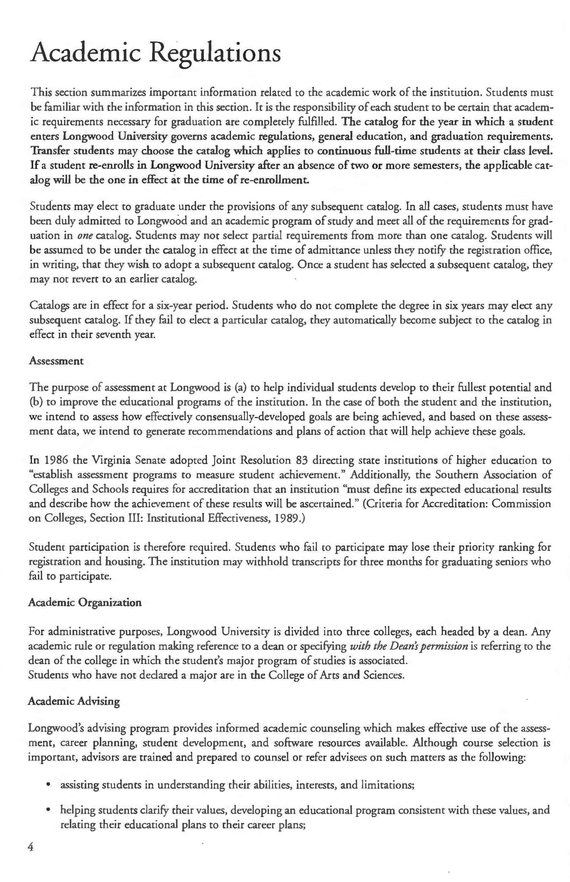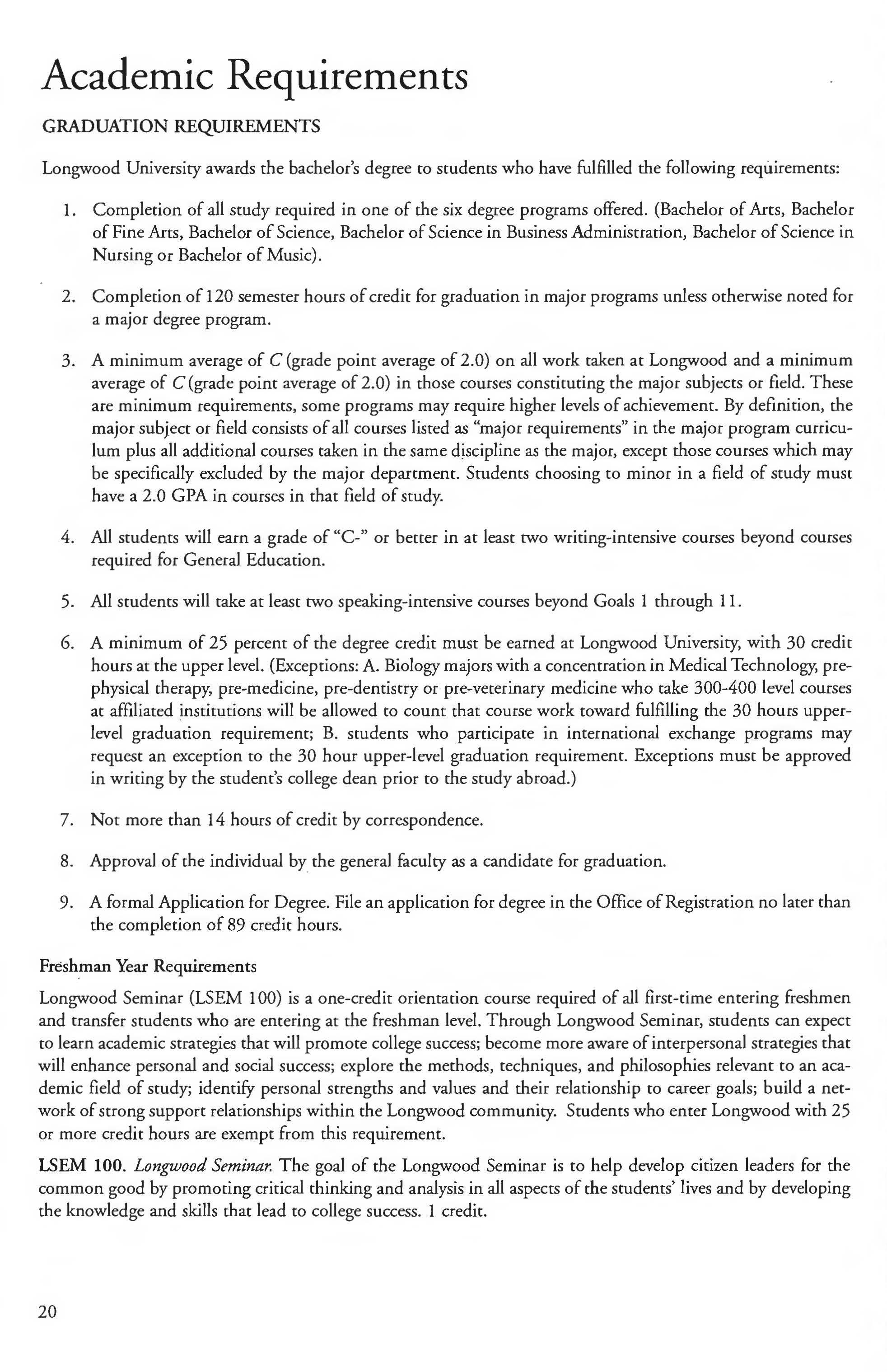 This section summarizes important information related to the academic work of the institution. Students must be familiar with the information in this section. It is the responsibility of each student to be certain that academic requirements necessary for graduation are completely fulfilled. The catalog for the year in which a student enters Longwood University governs academic regulations, general education, and graduation requirements. Transfer students may choose the catalog which applies to continuous full-time students at their class level. If a student re-enrolls in Longwood University after an absence of two or more semesters, the applicable catalog will be the one in effect at the time of re-enrollment.
