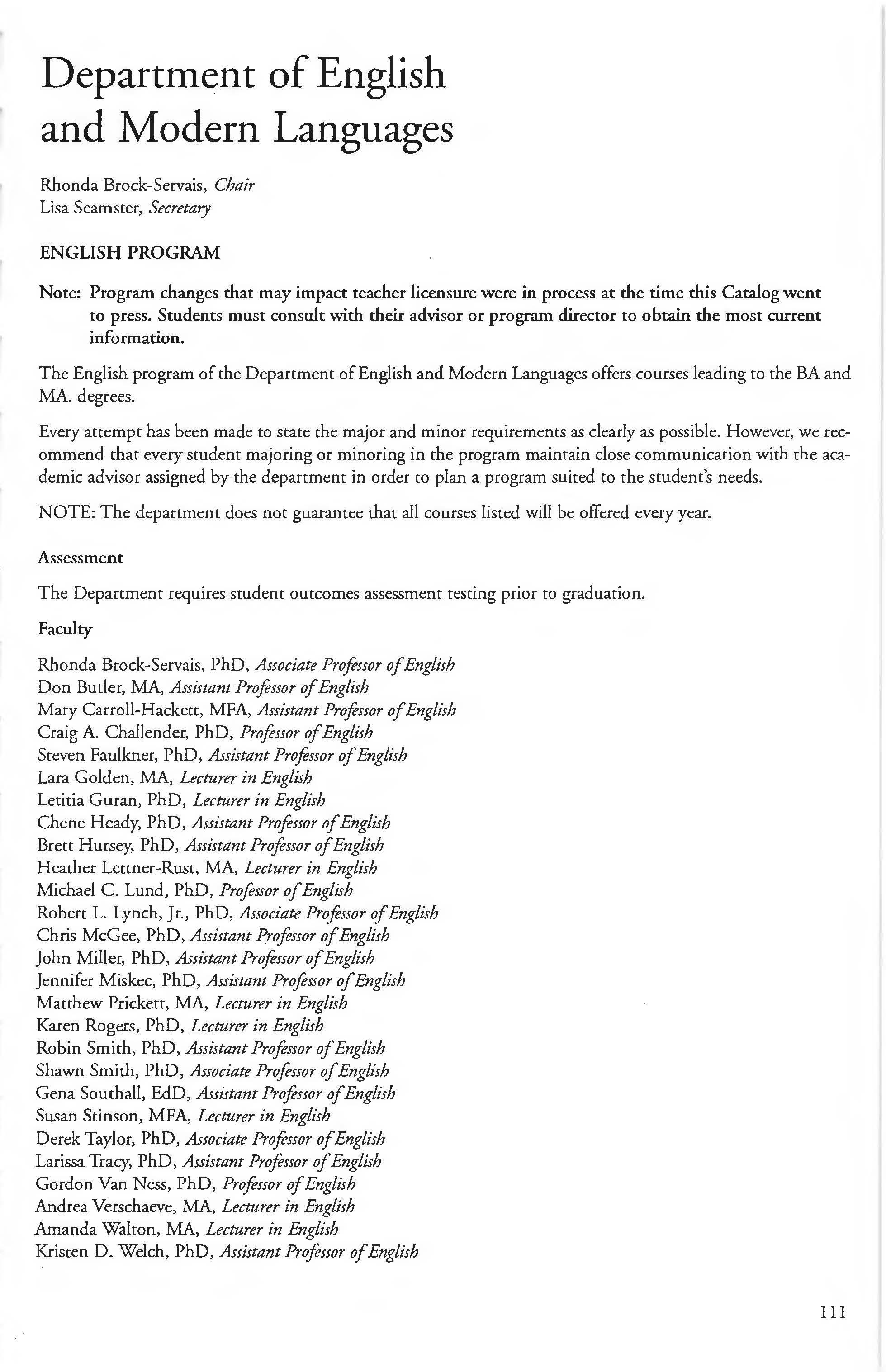 English Major, BA Degree .......... . .. 112-116 Coaching Minor 281 English Minors 117-119 College of Business & Economics . .. . . . ... . .217 English & Modern Languages, Dept. of . . 111-112 College of Education & Human Services ... . . 245 Environmental Studies Minor . .. . ... . .. . . . .. 67 College of Arts & Sciences 33 Examinations 7