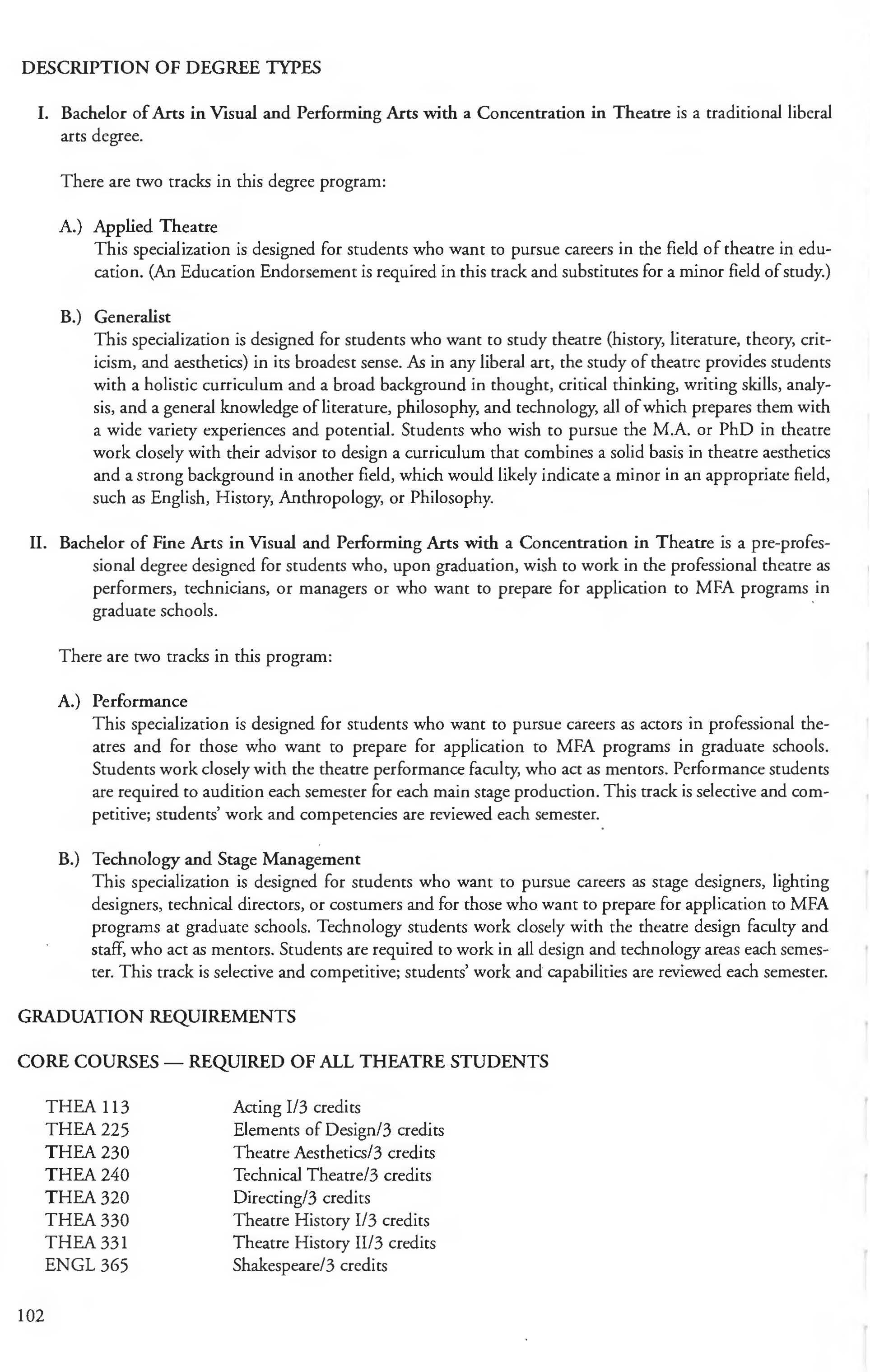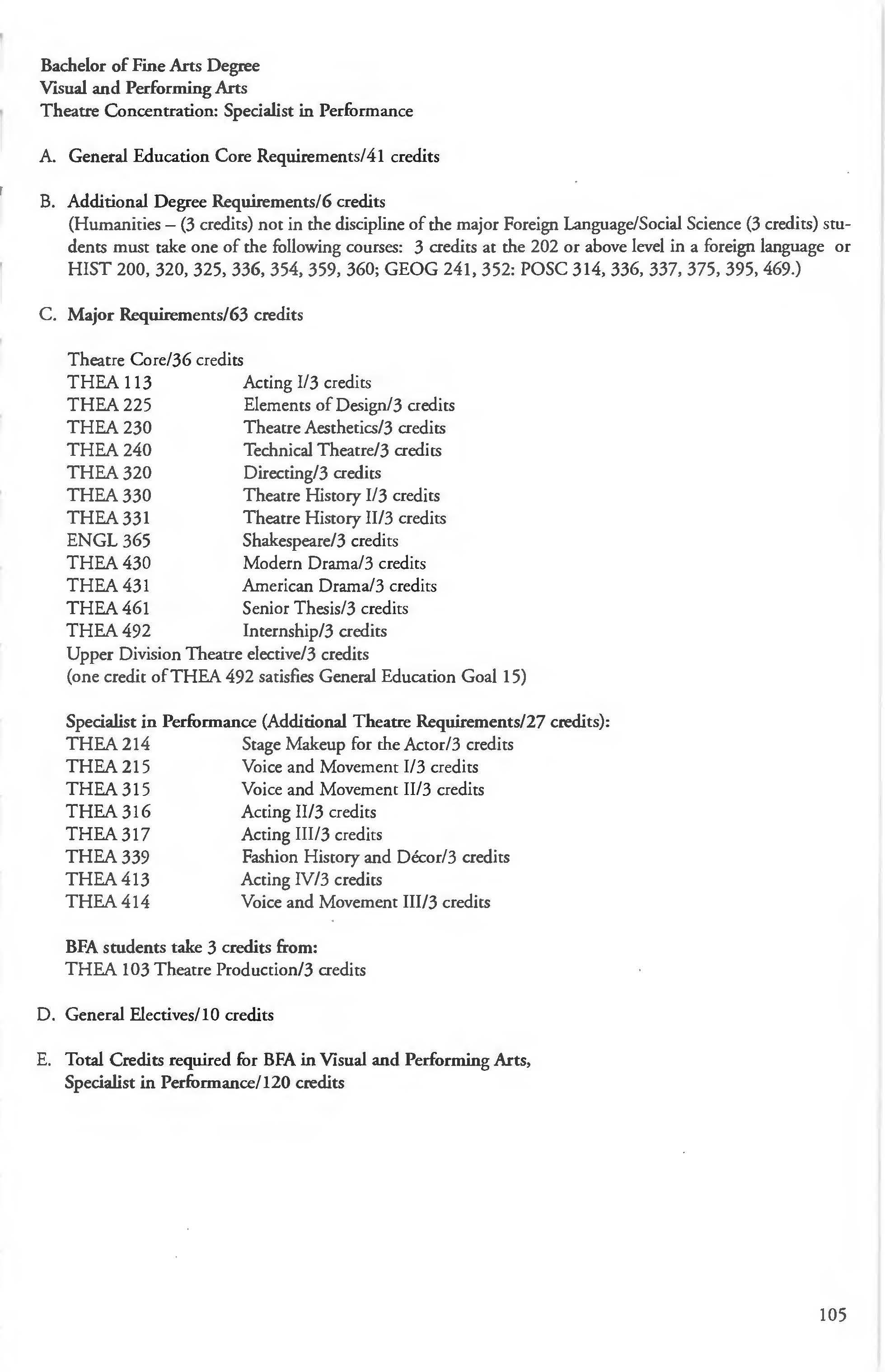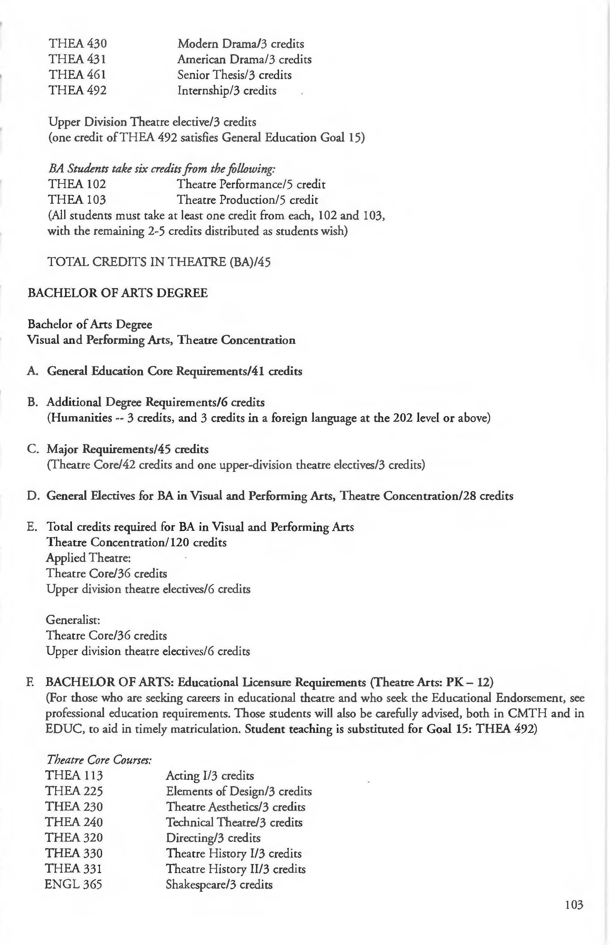 Visual and Performing Arts, BA degree, Theatre Concentration ............... .. 103
