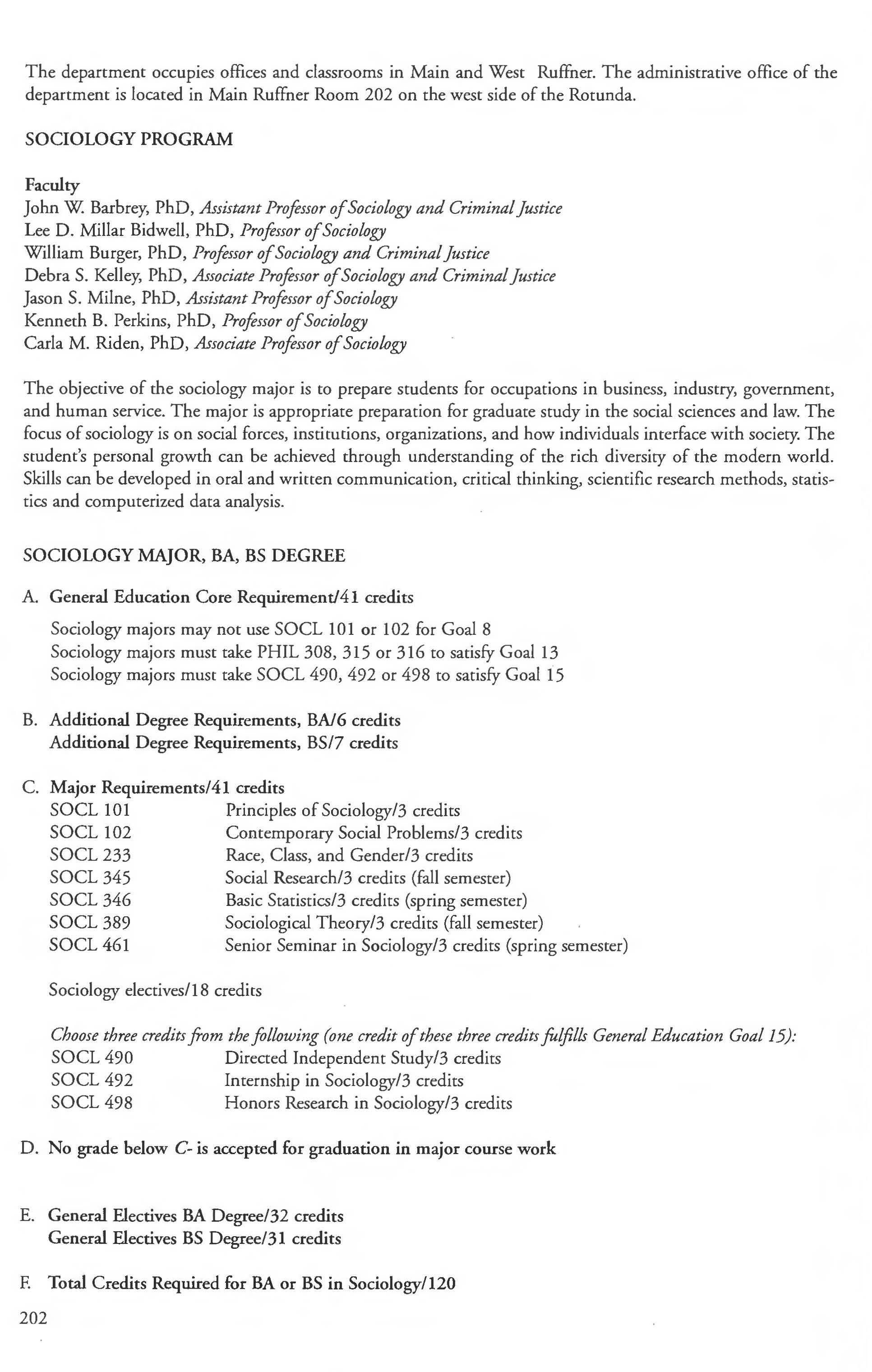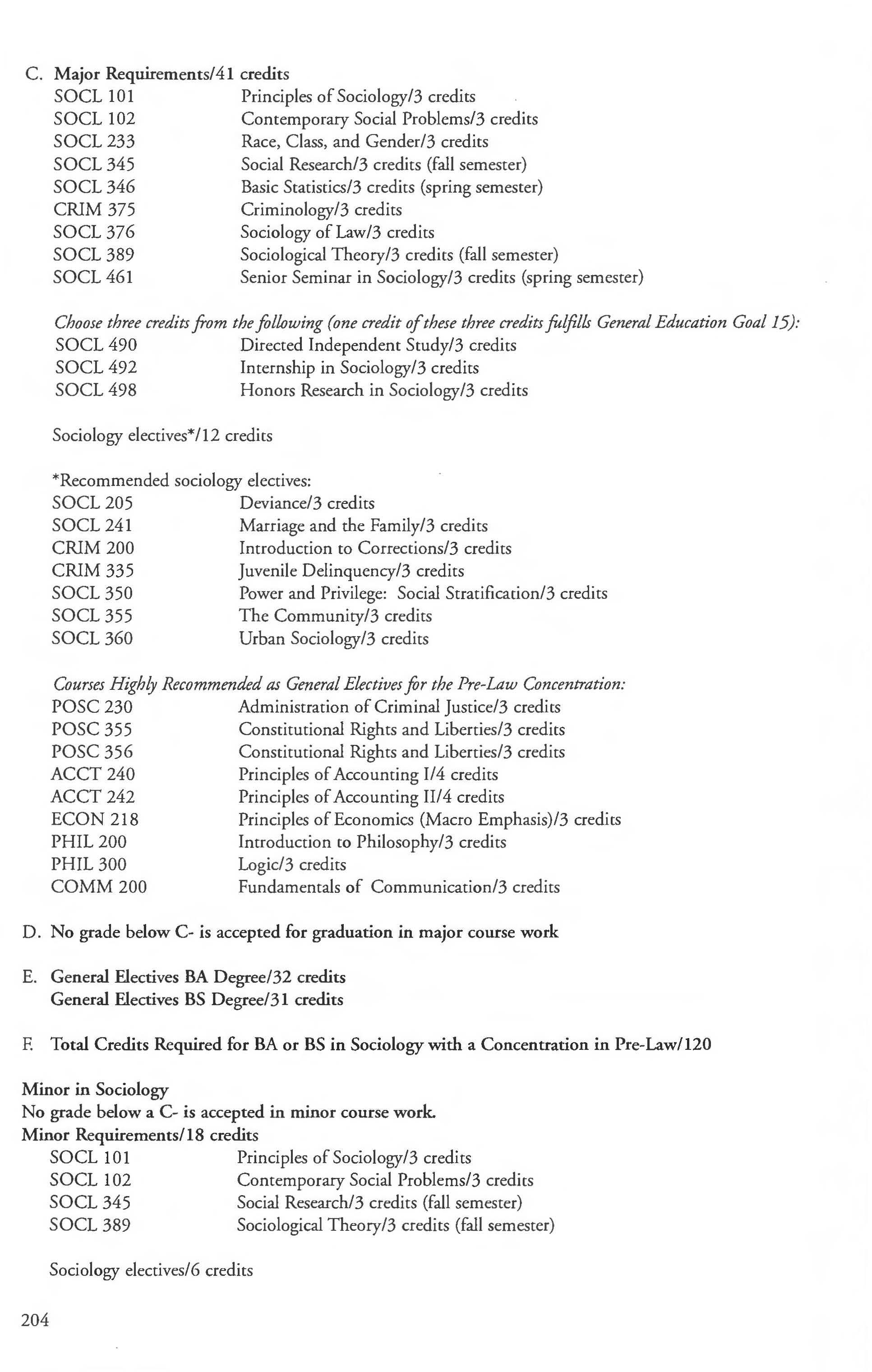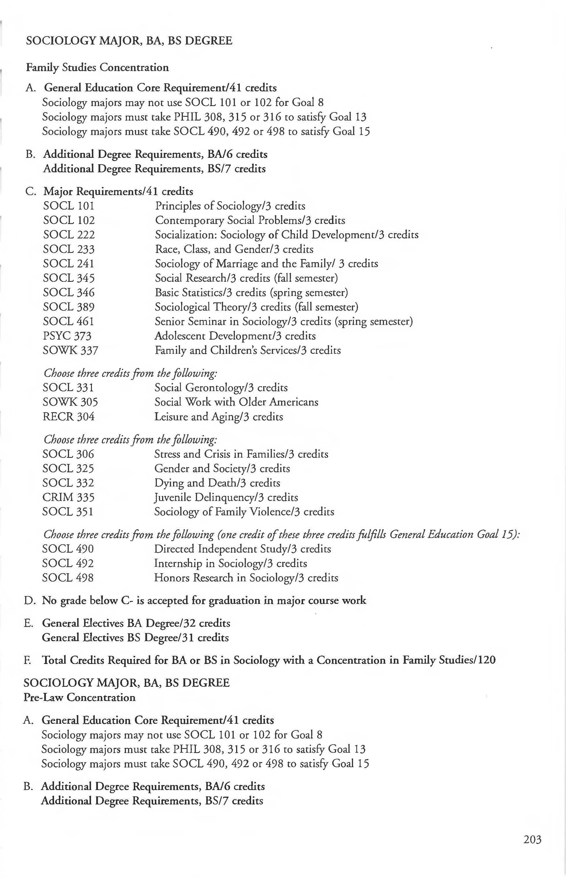 Sociology Major, BA, BS Degree .... ... . .. .. 202 Pre-Law Concentration 203-204 Family Studies Concentration ........... 203