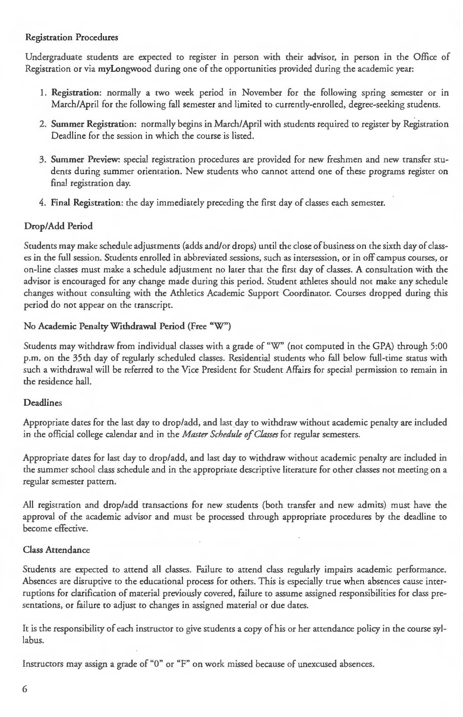 Undergraduate students are expected to register in person with their advisor, in person in the Office of Registration or via myLongwood during one of the opportunities provided during the academic year: