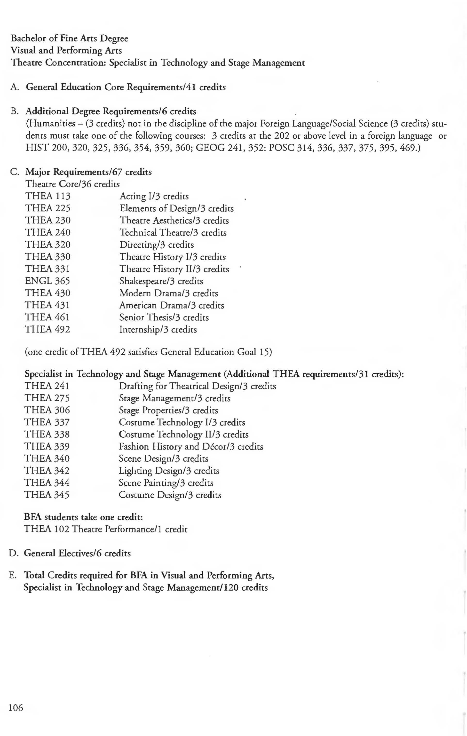 Visual and Performing Arts, BFA degree, Theatre Concentration, Specialist in Technology and Stage Management 106