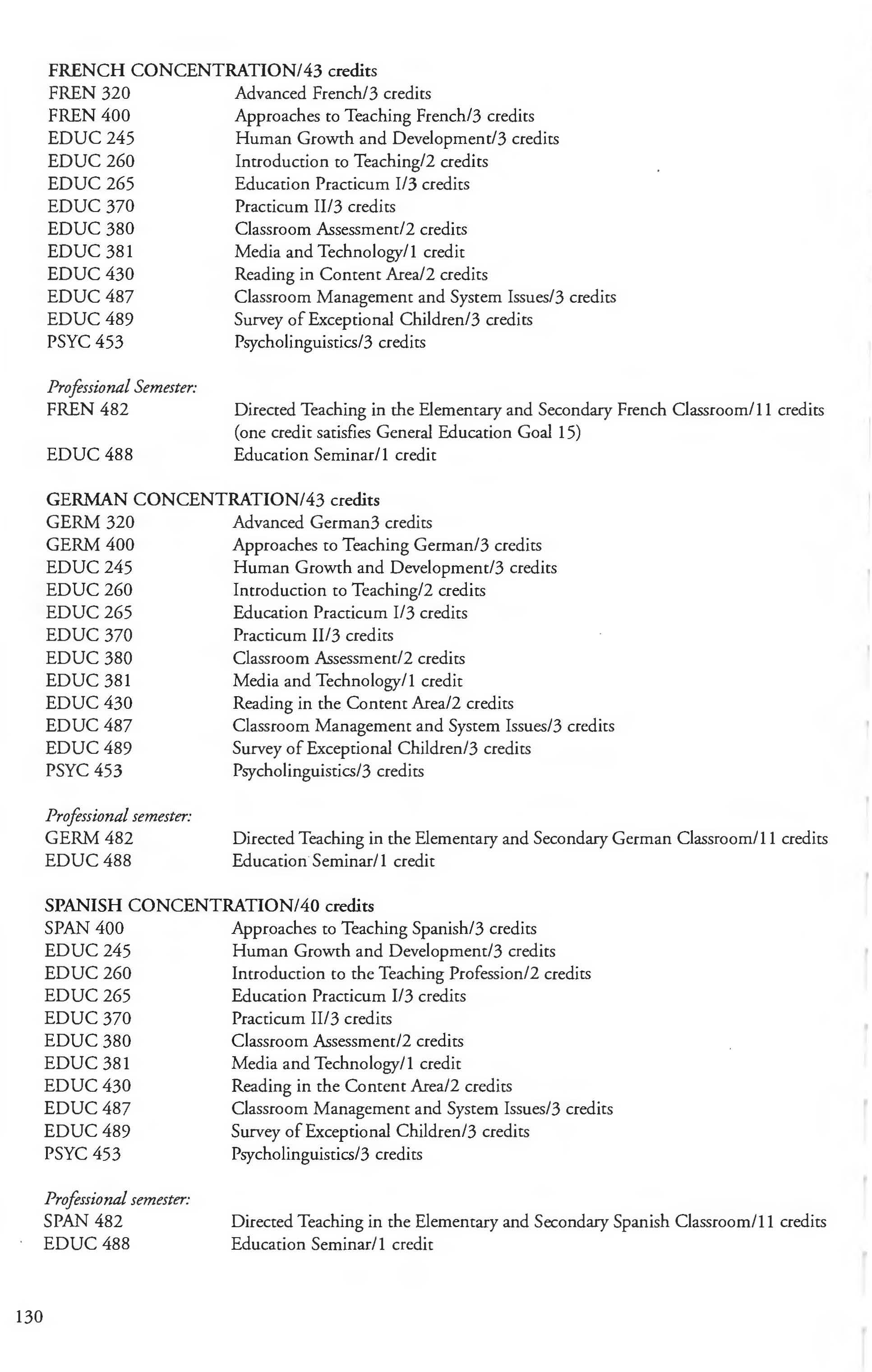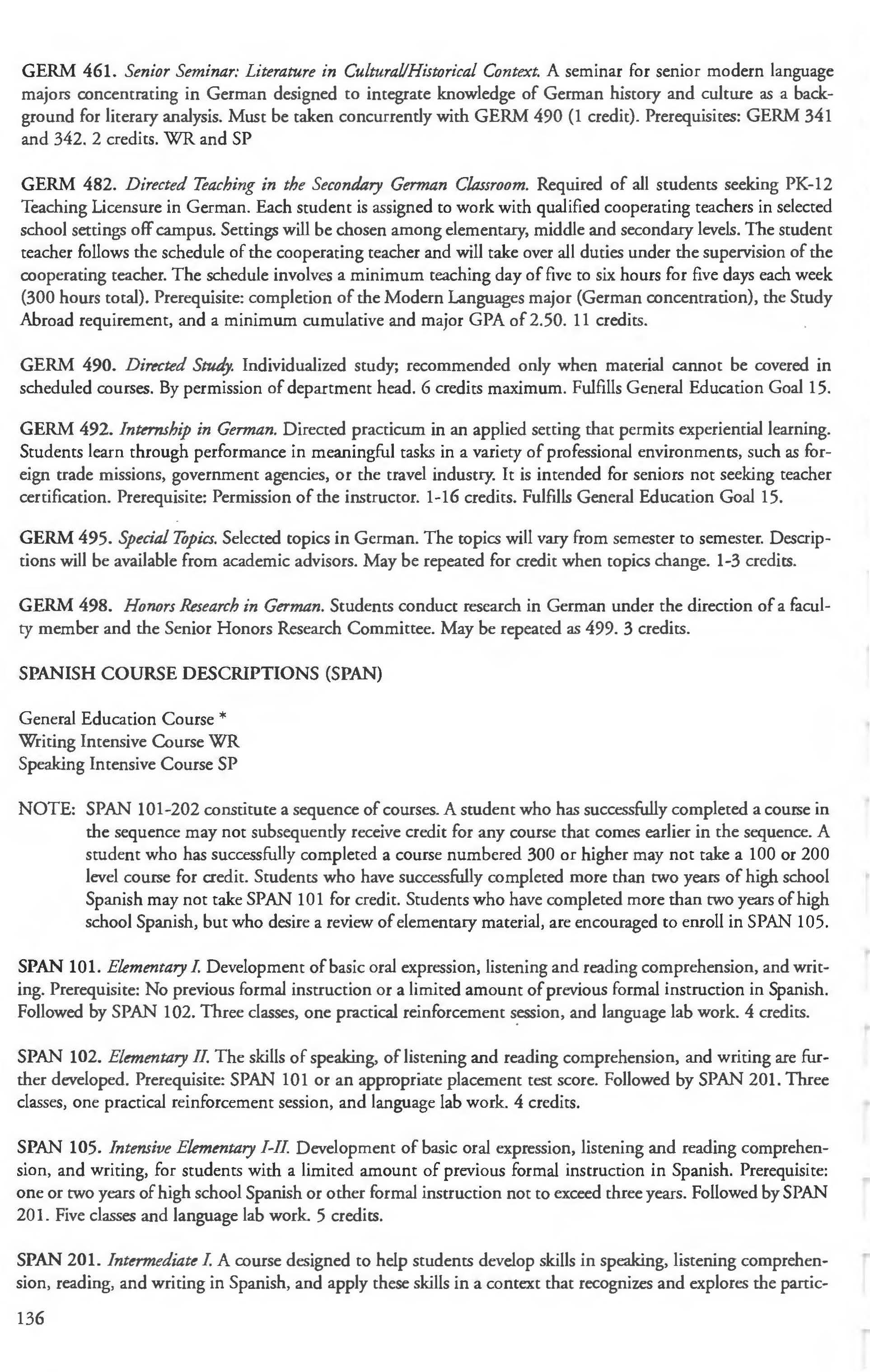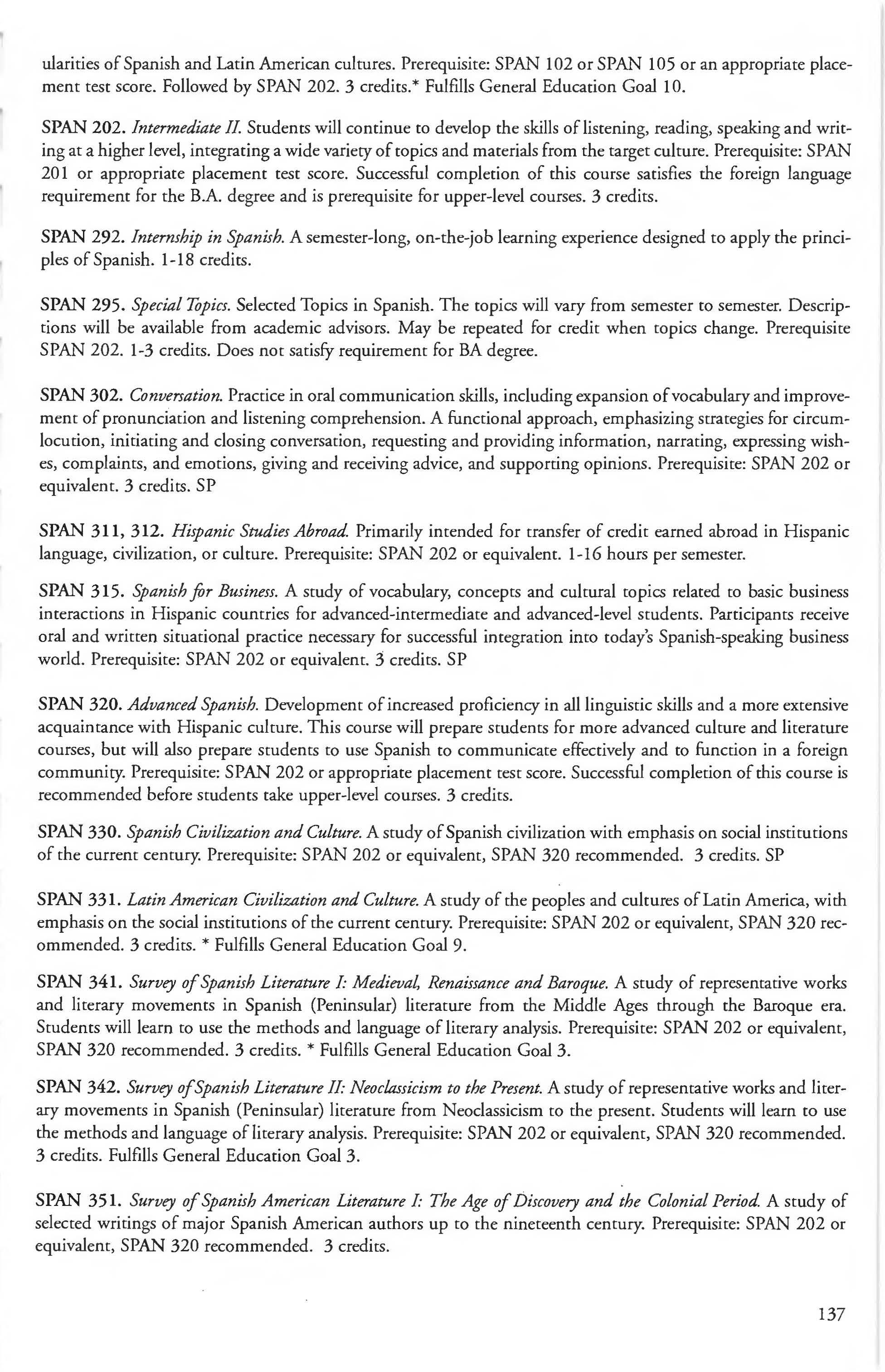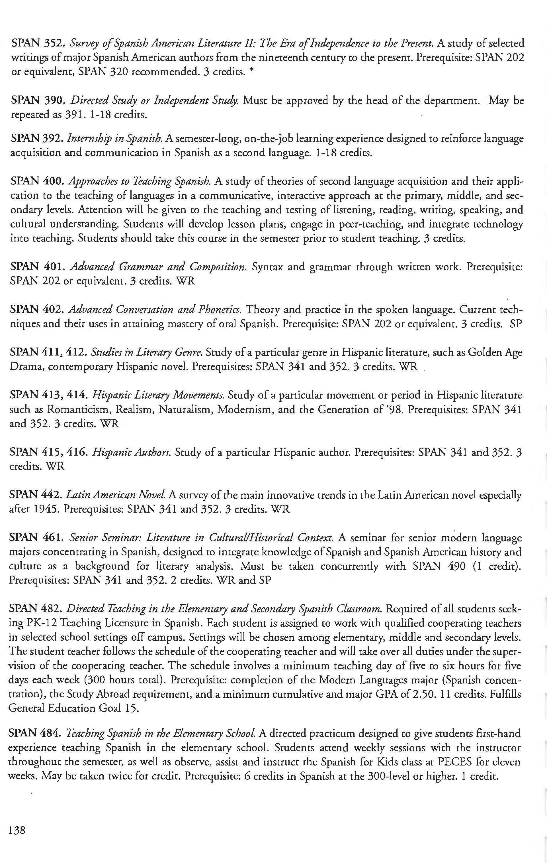Sociology Minor 204 Spanish 127 Spanish Courses 136-139 Spanish Minor 131 Special Education Courses 259-261