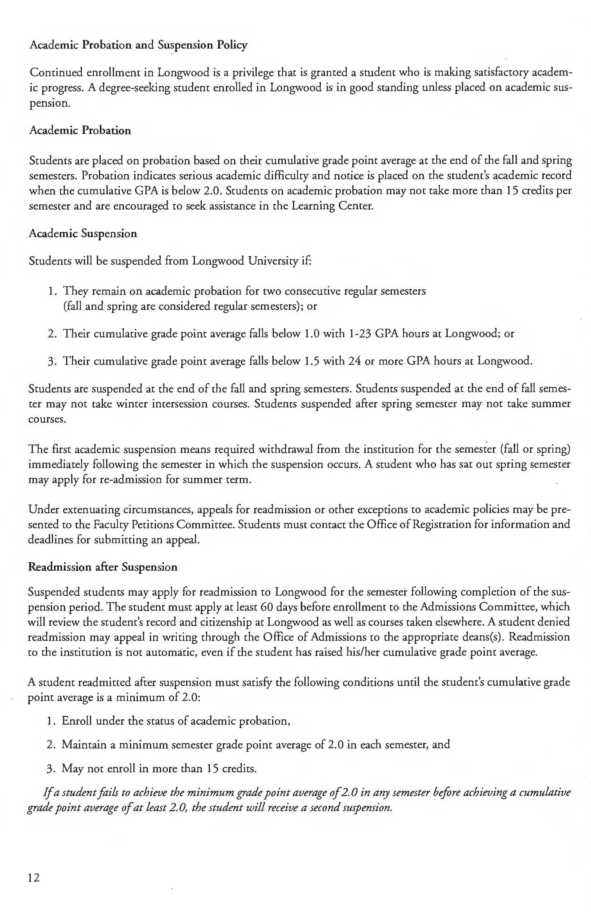 Longwood University is organized on the semester plan whereby the credit hour, abbreviated as credit, is the semester hour. Freshmen normally carry 15 to 17 credits, but may carry 18 credits if they earned at least 2.0 on their previous semester's work. Upper class students normally carry 15 to 18 credits, but may carry up co 21 if they earned at least 2.0 on their previous semester's work. Students on probation or readmitted after suspension may not enroll in more than 15 credits per semester. A schedule beyond these limits requires special permission from the student's dean or department chair. Students must take at least 12 credits to maintain full-time status.
