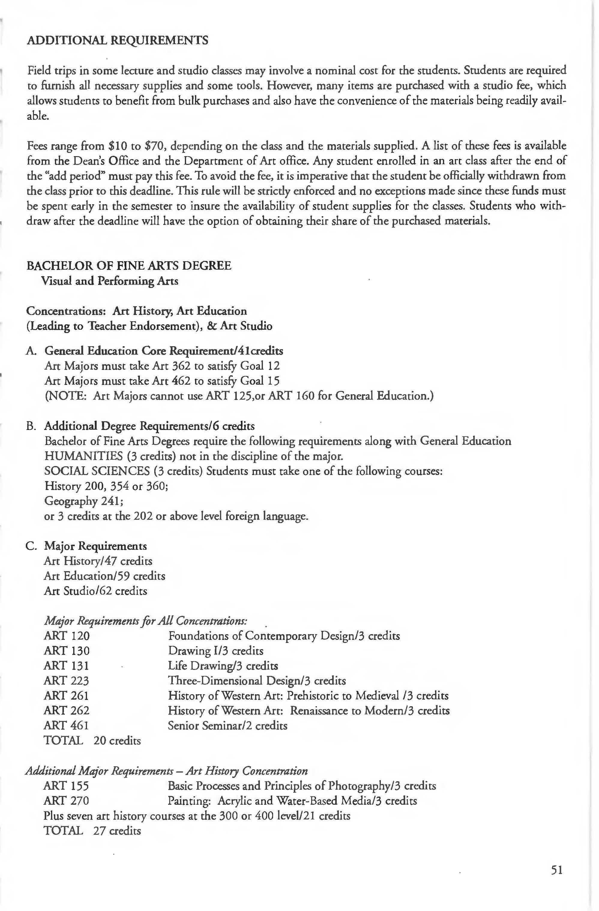Anthropology Major, Minor in Computer Science . . ... .... . ..... 173 BA, BS Degree 209 Cooperative Programs 19, 80, 93 Anthropology Minor .. . . . . . .. ..... . ..... .210 Correspondence Courses . . ... . . . . .......... 16 Art, BFA Degree .51-56 Course Numbers .5 Art Course Repeats .. .. . ........... ... .. ..... 10 Education Concentration .51 Creative Writing Minor 117-118 Art History Concentration 51 Criminology/Criminal Justice Studio Concentration ........... ... ..... 52 Major BS ........................ 213-214 Art Courses 56-63 Criminology/Criminal Justice Art, Department of ................ ... .49-50 Minor 214 Art Minors. ·............. , .. . ... . . . .. .55-56 Criminology Courses . . ............... 214-216 Assessment Statement 1, 4 Dance Courses 285-286 Athletic Training Program .. . . .... .. . . . 277 -278 Dean's List .. . . ... . . . .... . . . . .... . .. .... 11 Athletic Training Courses 286-287 Declaration of Major 5 Auditing Classes .. . . .. ..... . . . ... . .. .. . . .. 9 Disclaimer Statement .' ·1