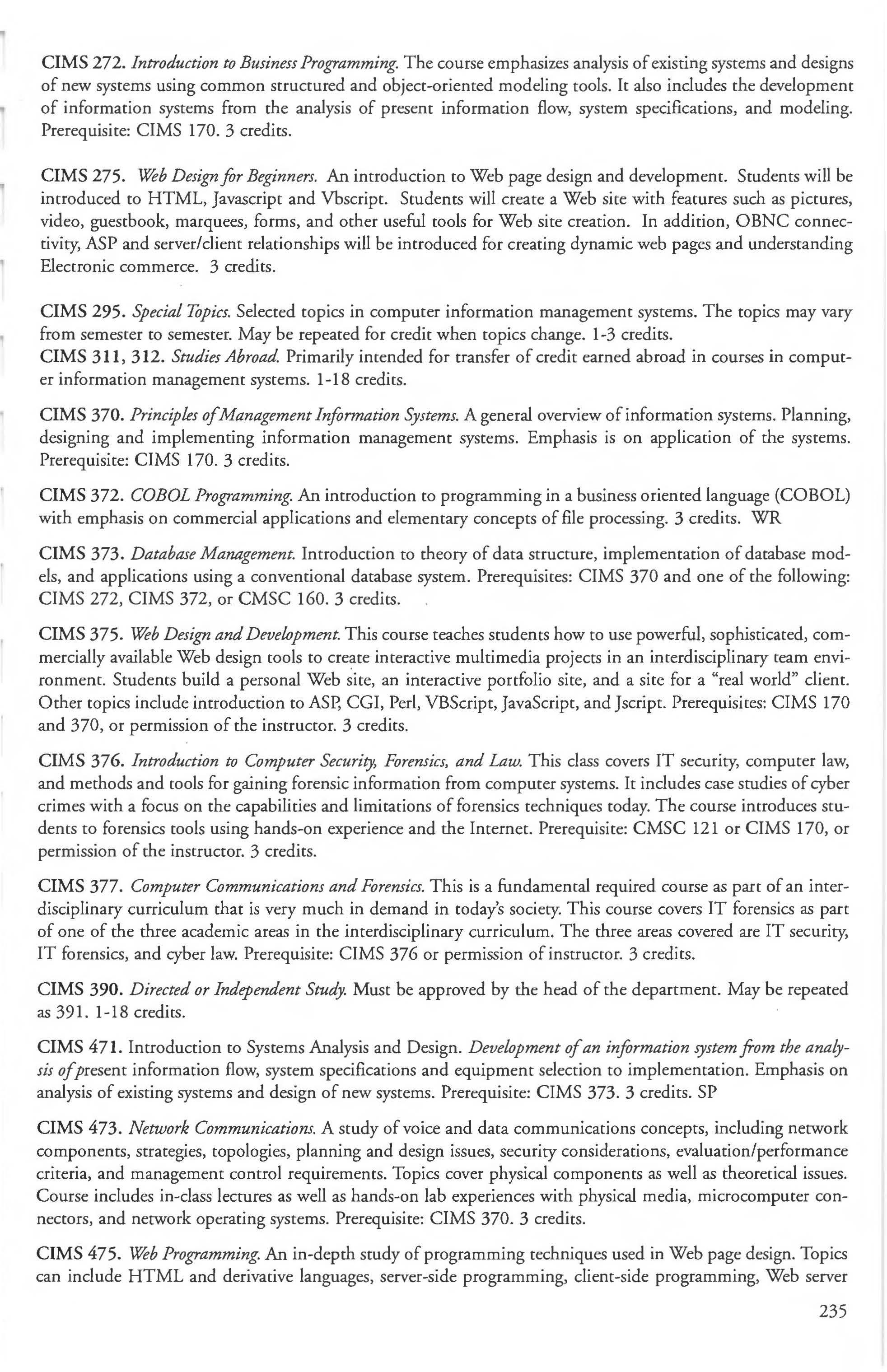 Add Period . ... . ............. . ... . ....... 6 Computer Information Management Additional Degree Requirements .... . . . . . .21-22 Systems (CIMS) Program ....... .. . .... 223