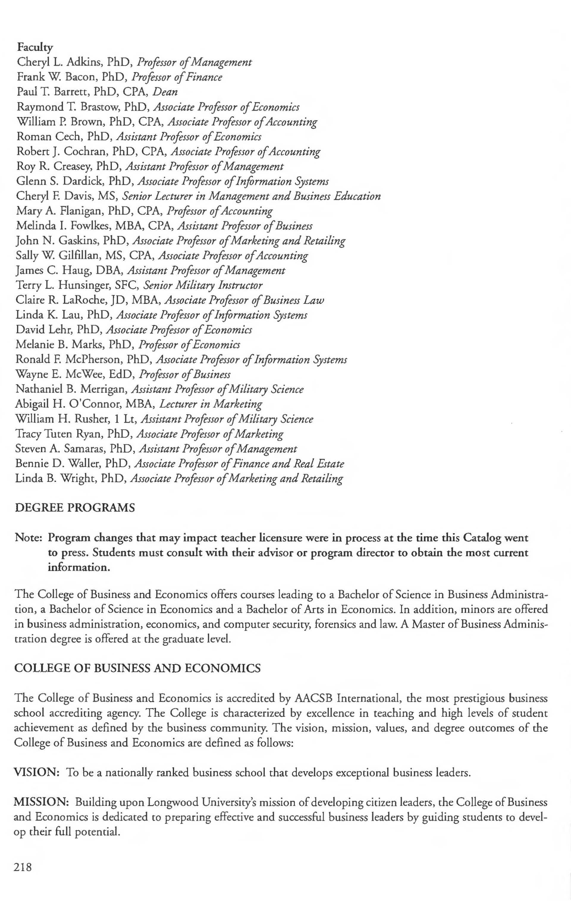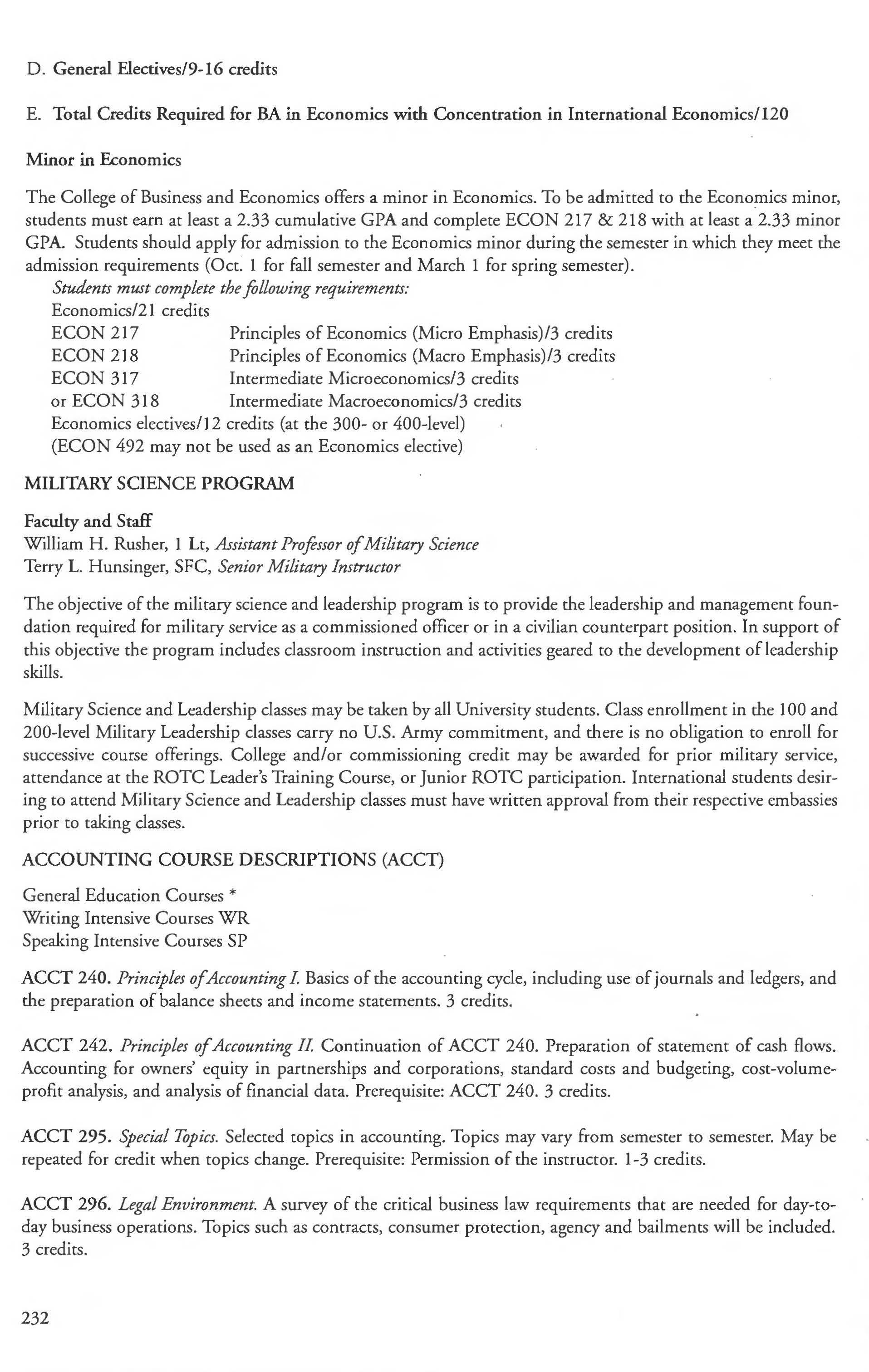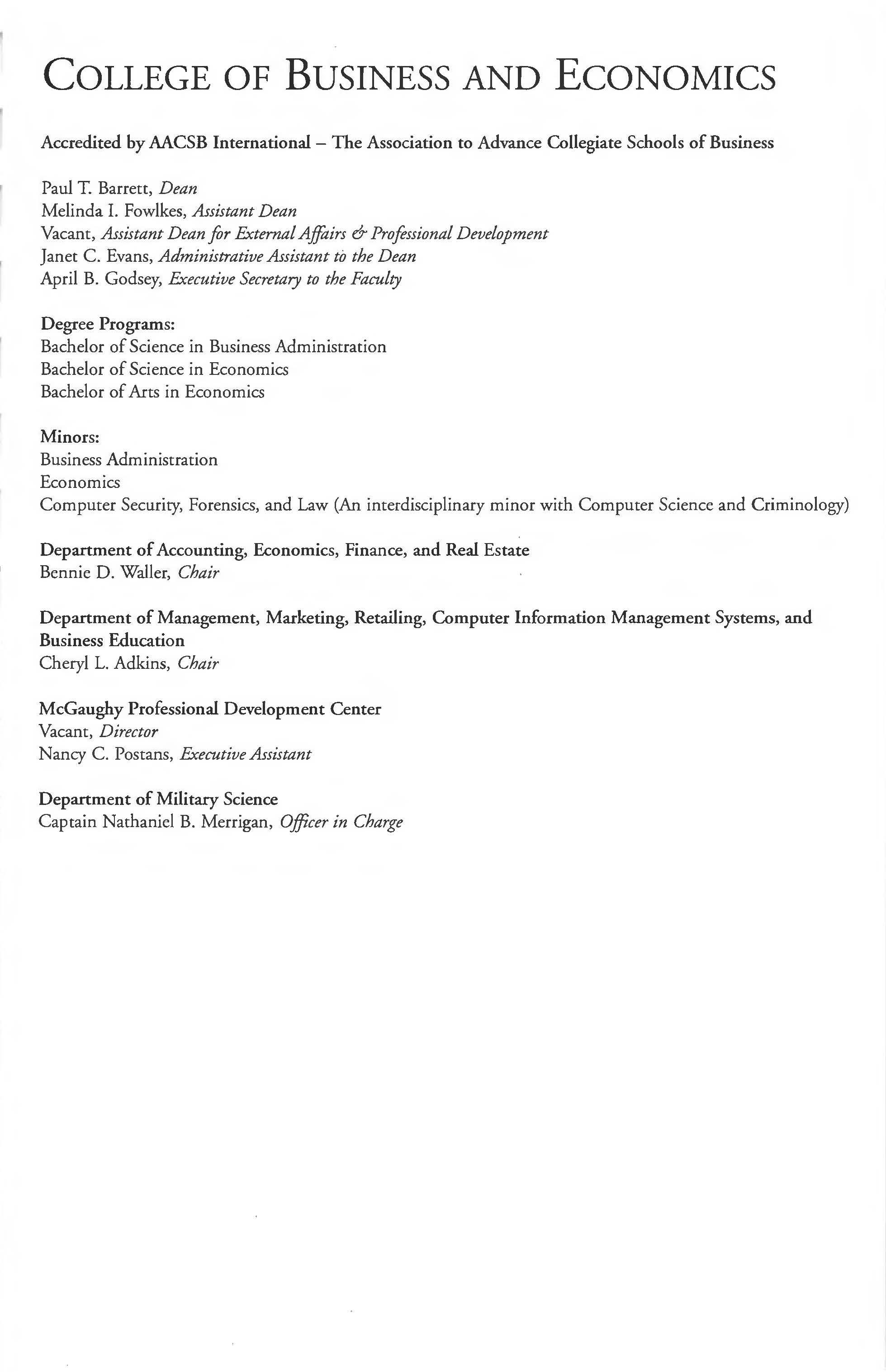 Accounting, Economics, Finance, and Real Estate Management, Marketing, Retailing, Computer Management Systems , and Business Education Military Science