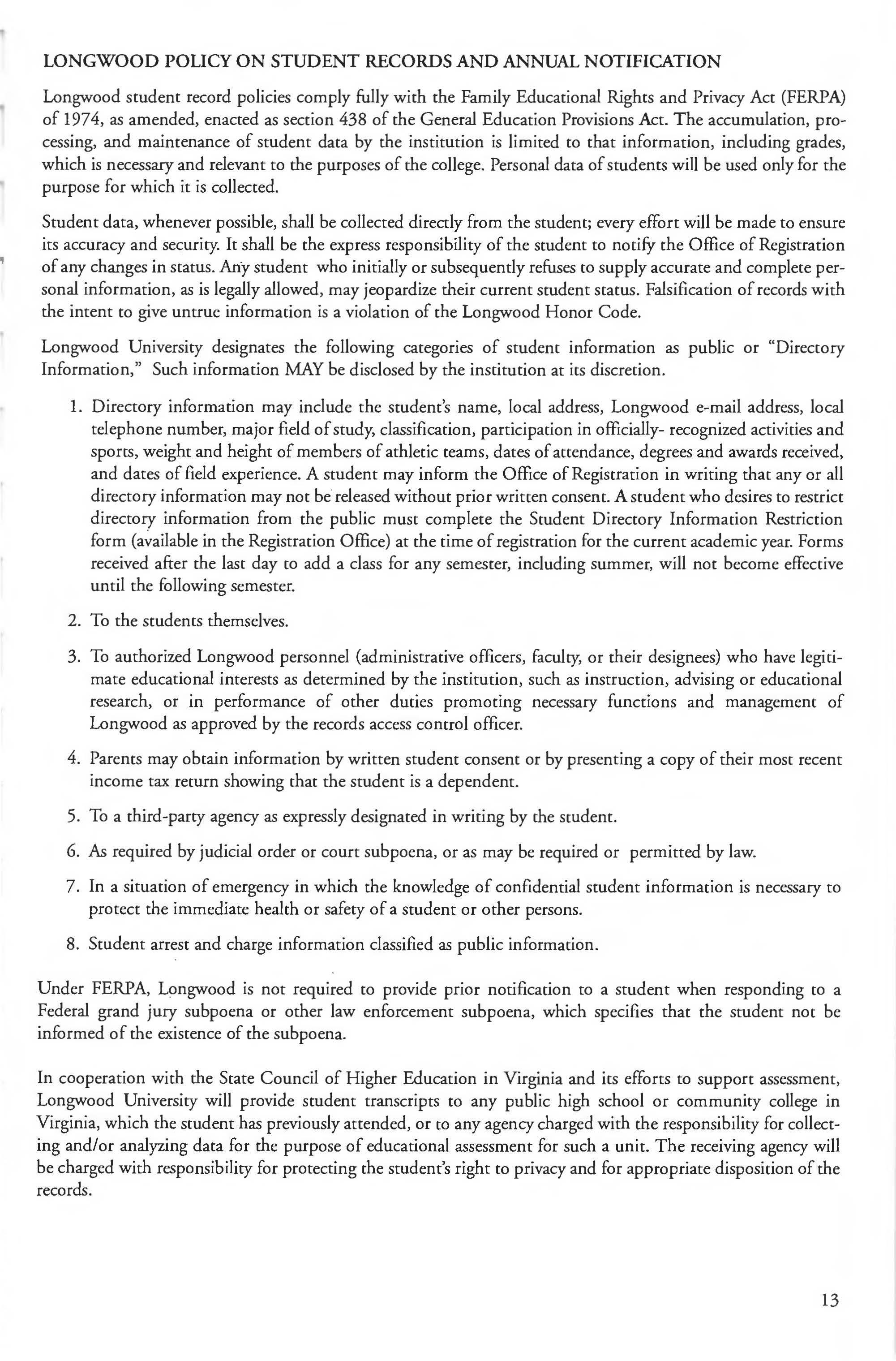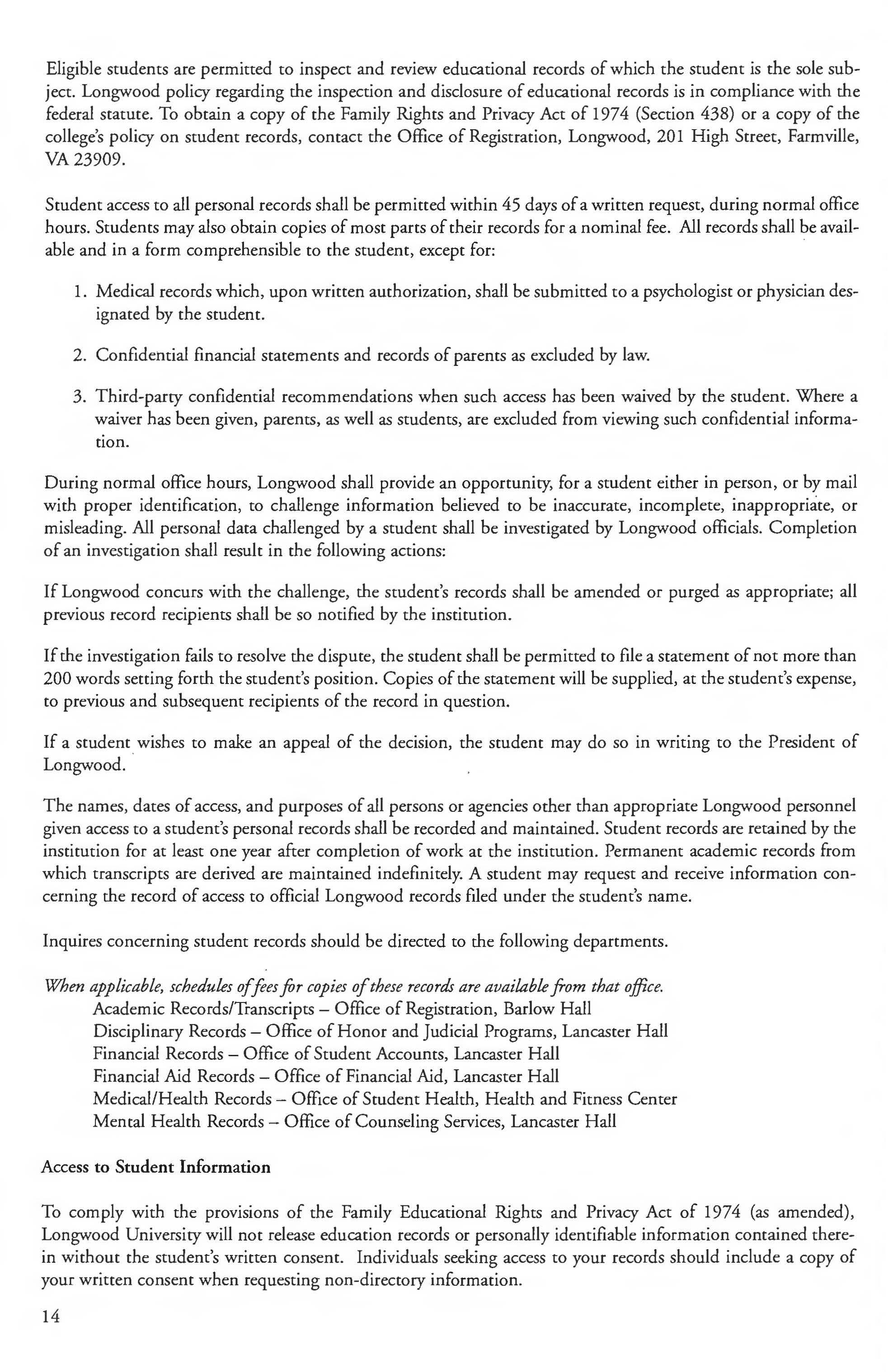 Student Records, Longwood University _ Policy on 13-16