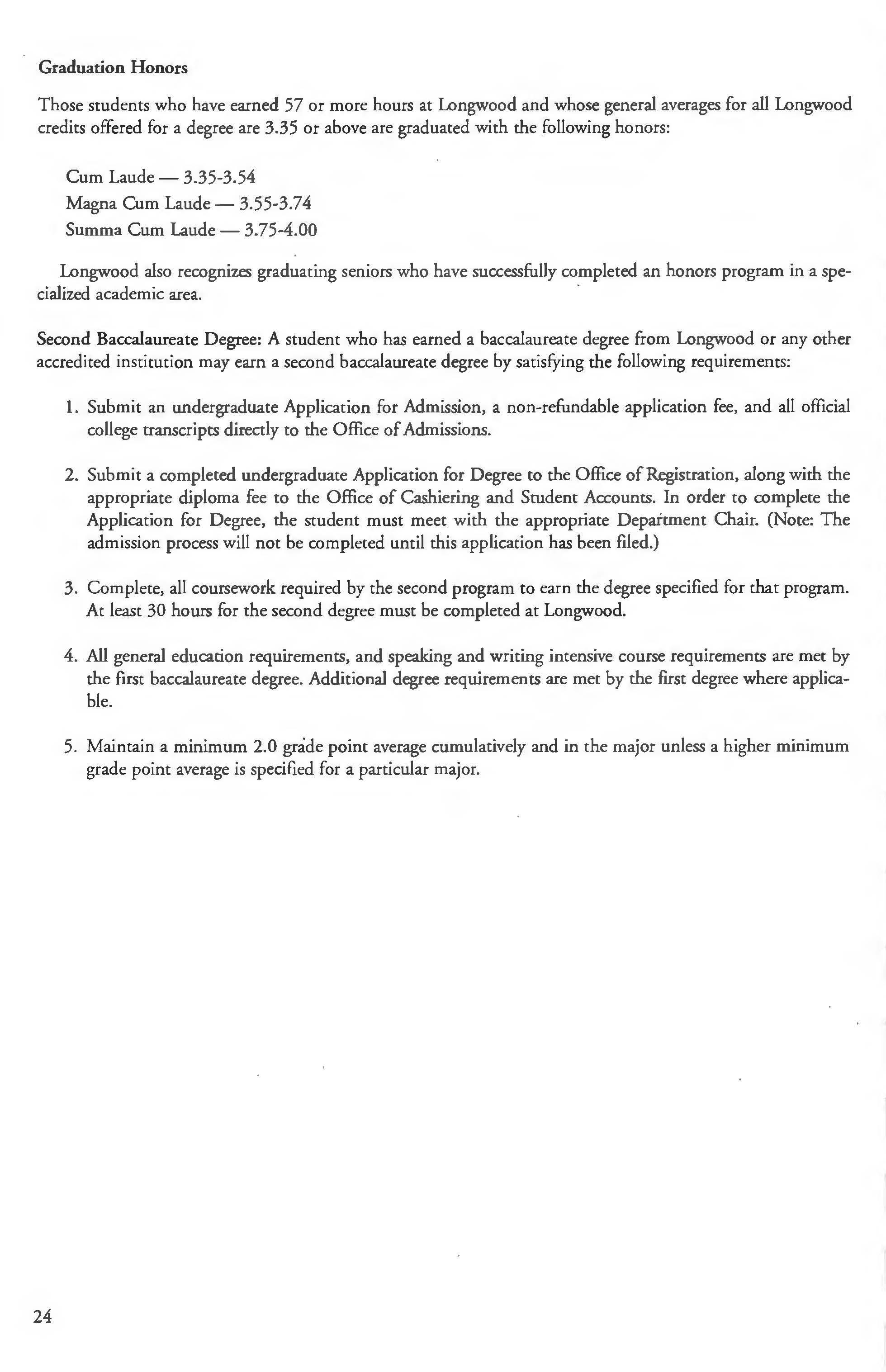 Stud ems may elect to graduate under the provisions of any subsequent catalog. In all cases, students must have been duly admitted to Longwood and an academic program of study and meet all of the requirements for graduation in one catalog. Students may not select partial requirements from more than one catalog. Students will be assumed to be under the catalog in effect at the time of admittance unless they notify the registration office, in writing, that they wish to adopt a subsequent catalog. Once a student has selected a subsequent catalog, they may not revert to an earlier catalog.