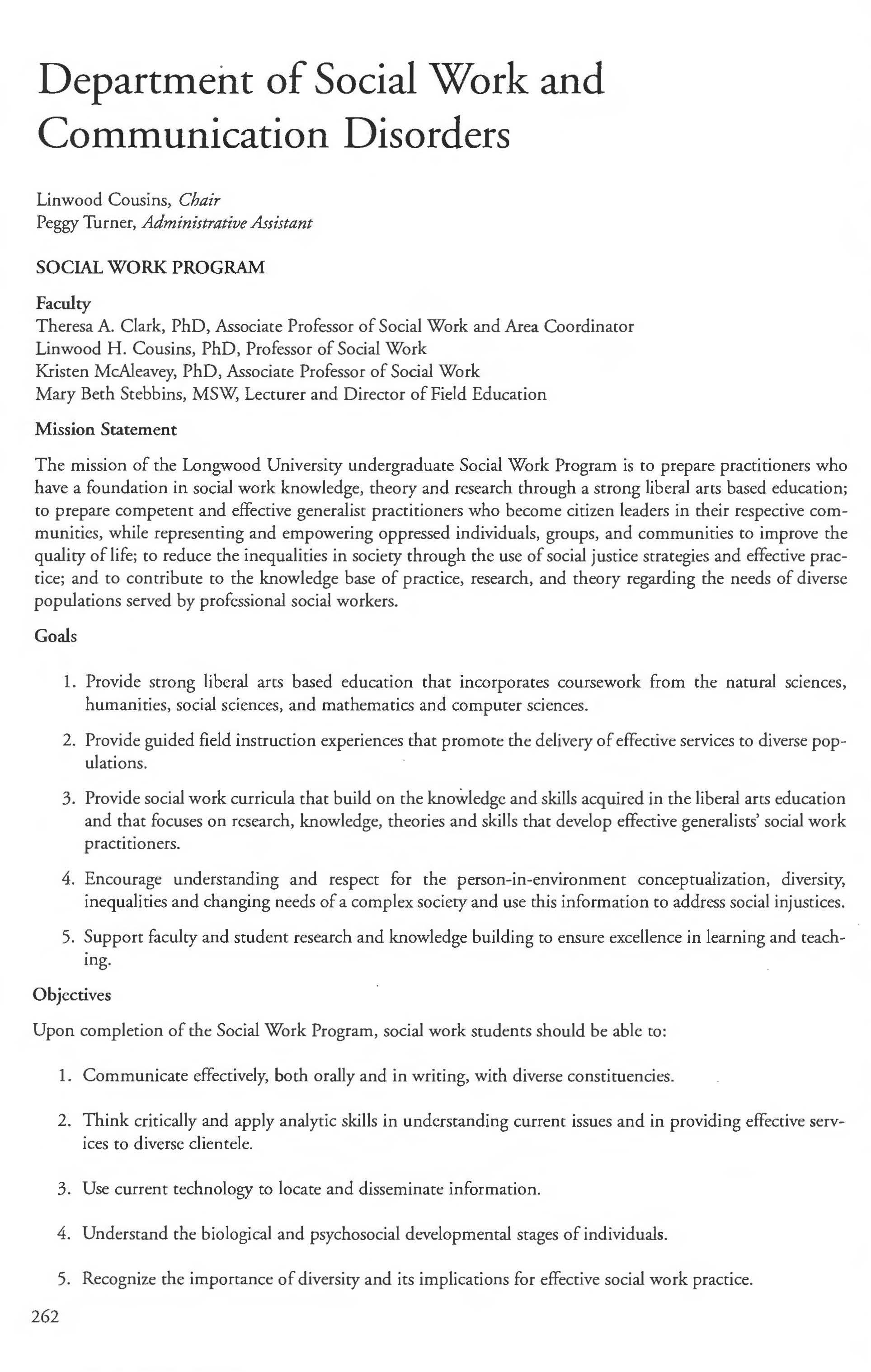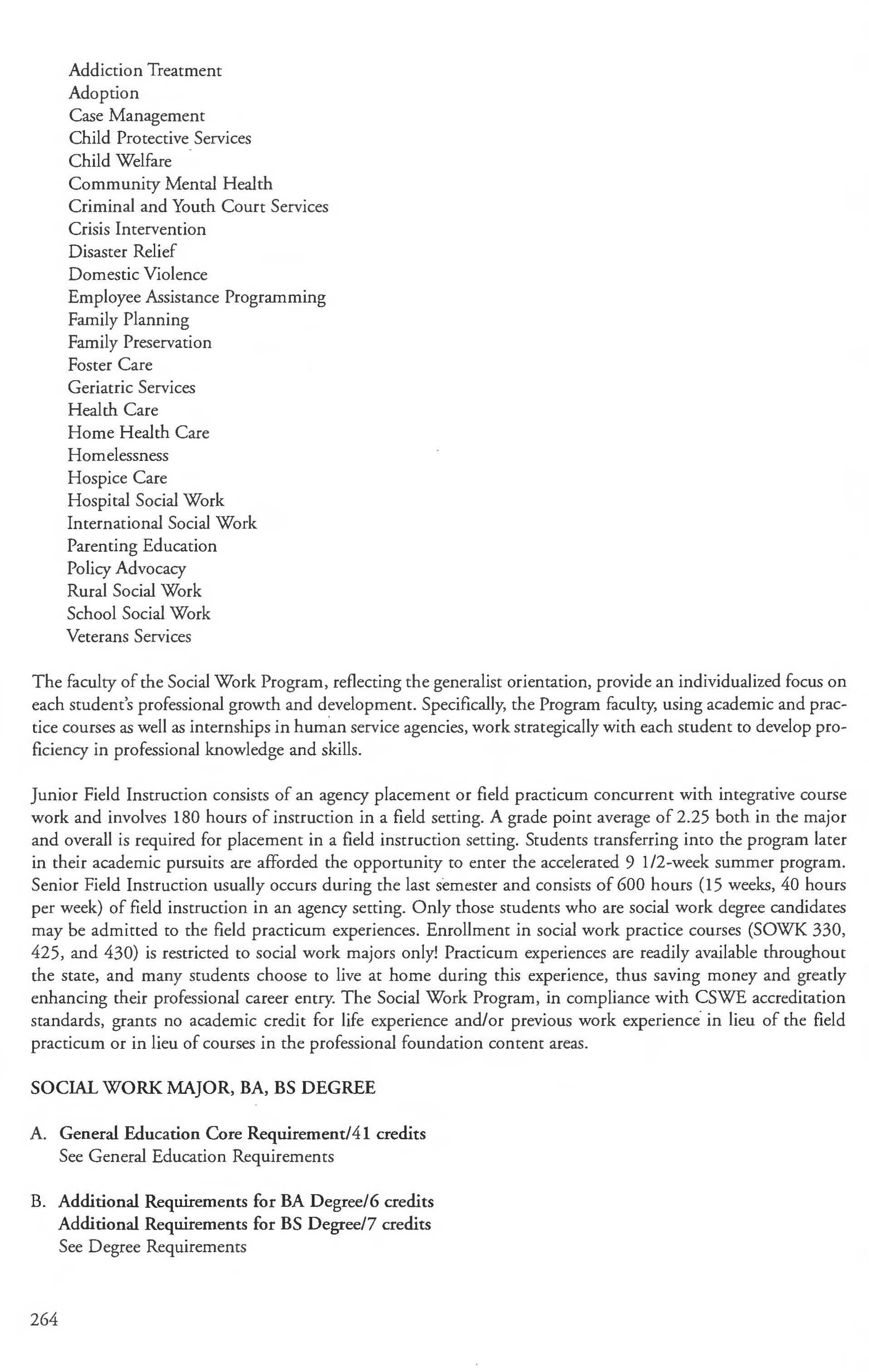 Social Work Major ................. .. 264-265 Social Work Program 262-264