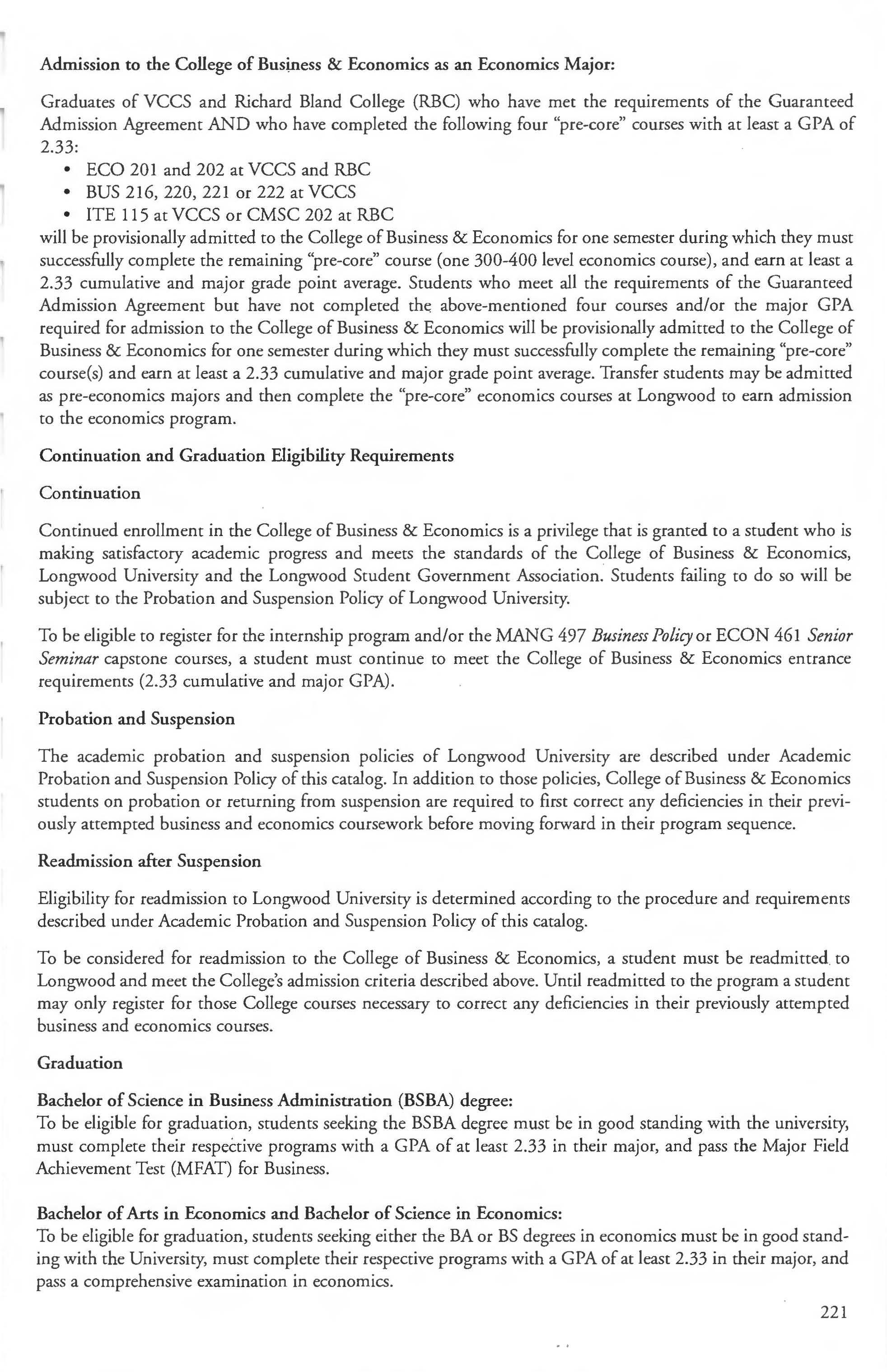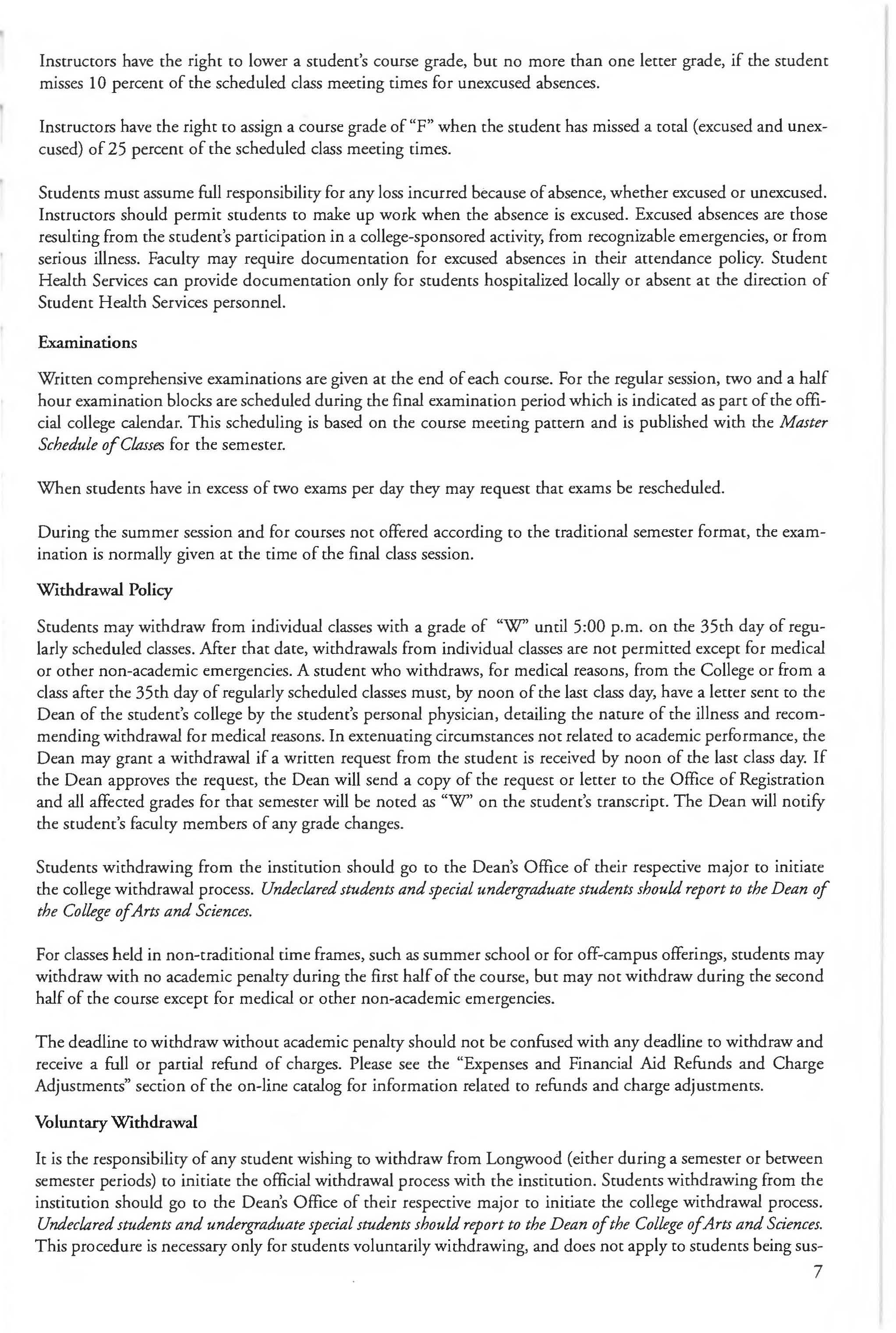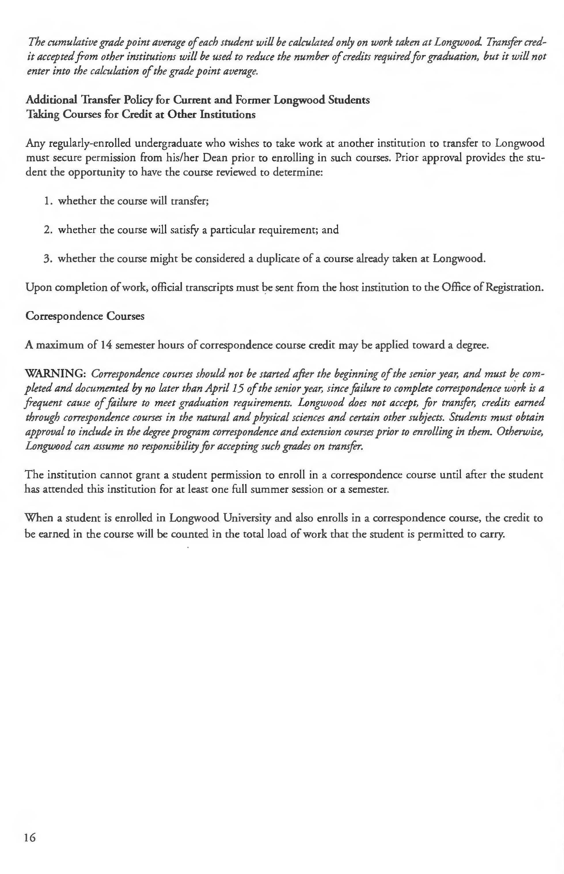This Web catalog is the official catalog of Longwood University. It describes Longwood's academic programs, including course numbers, descriptions, and standards for student progress and retention at the time of publication. However, the provisions of chis publication are not to be regarded as an irrevocable contract between the student and Longwood. There are established procedures for making changes which protect the institution's right co make changes deemed appropriate. A change of curriculum or graduation requirement is not made retroactive unless the alteration is to the student's advantage and can be accommodated within the span of years normally required for graduation.
