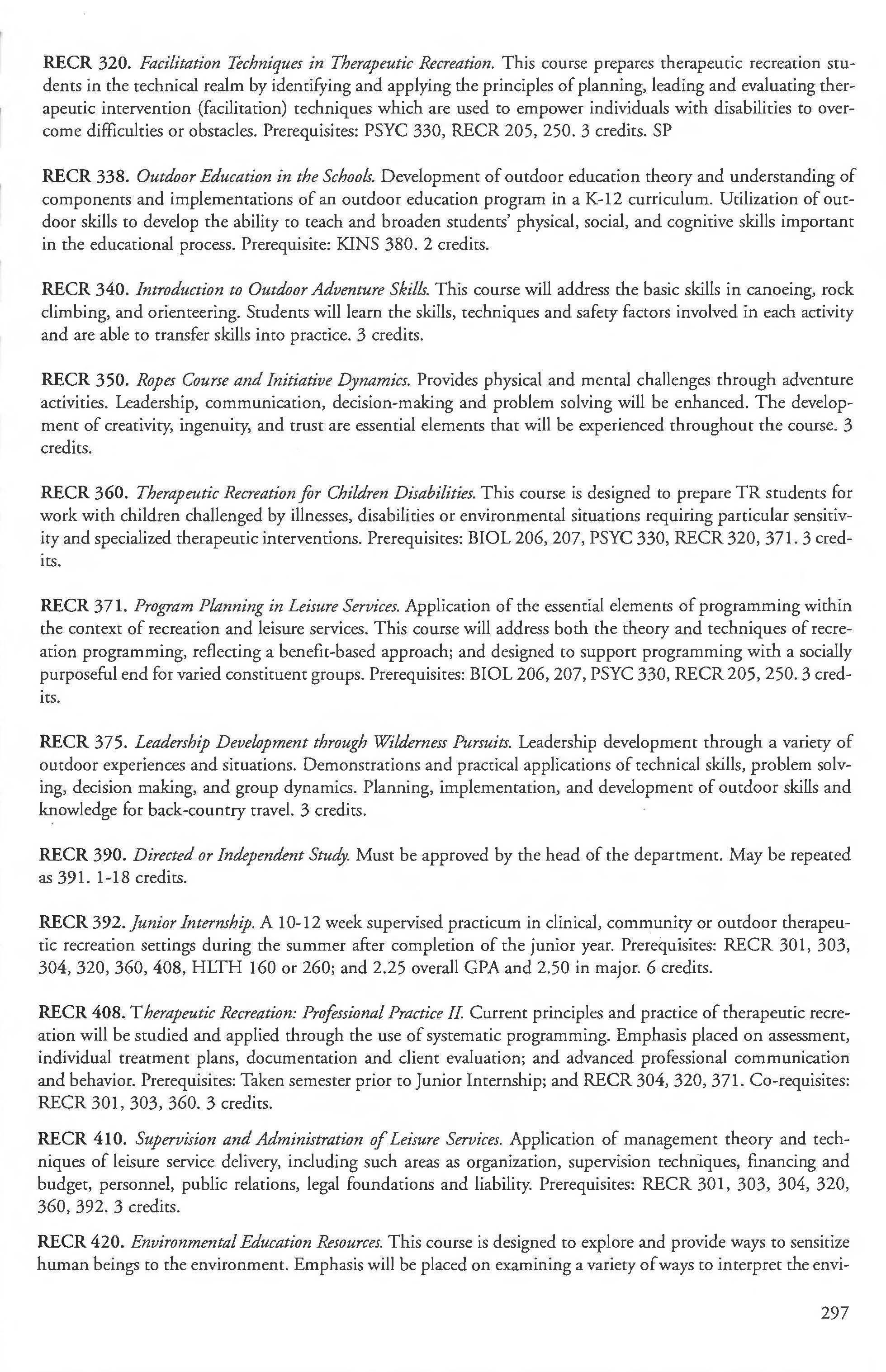 RECR 360. Therapeutic Recreation for Children Disabilities. This course is designed to prepare TR students for work with children challenged by illnesses, disabilities or environmental situations requiring particular sensitivity and specialized therapeutic interventions. Prerequisites: BIOL 206, 207, PSYC 330, RECR 320, 371. 3 credits.