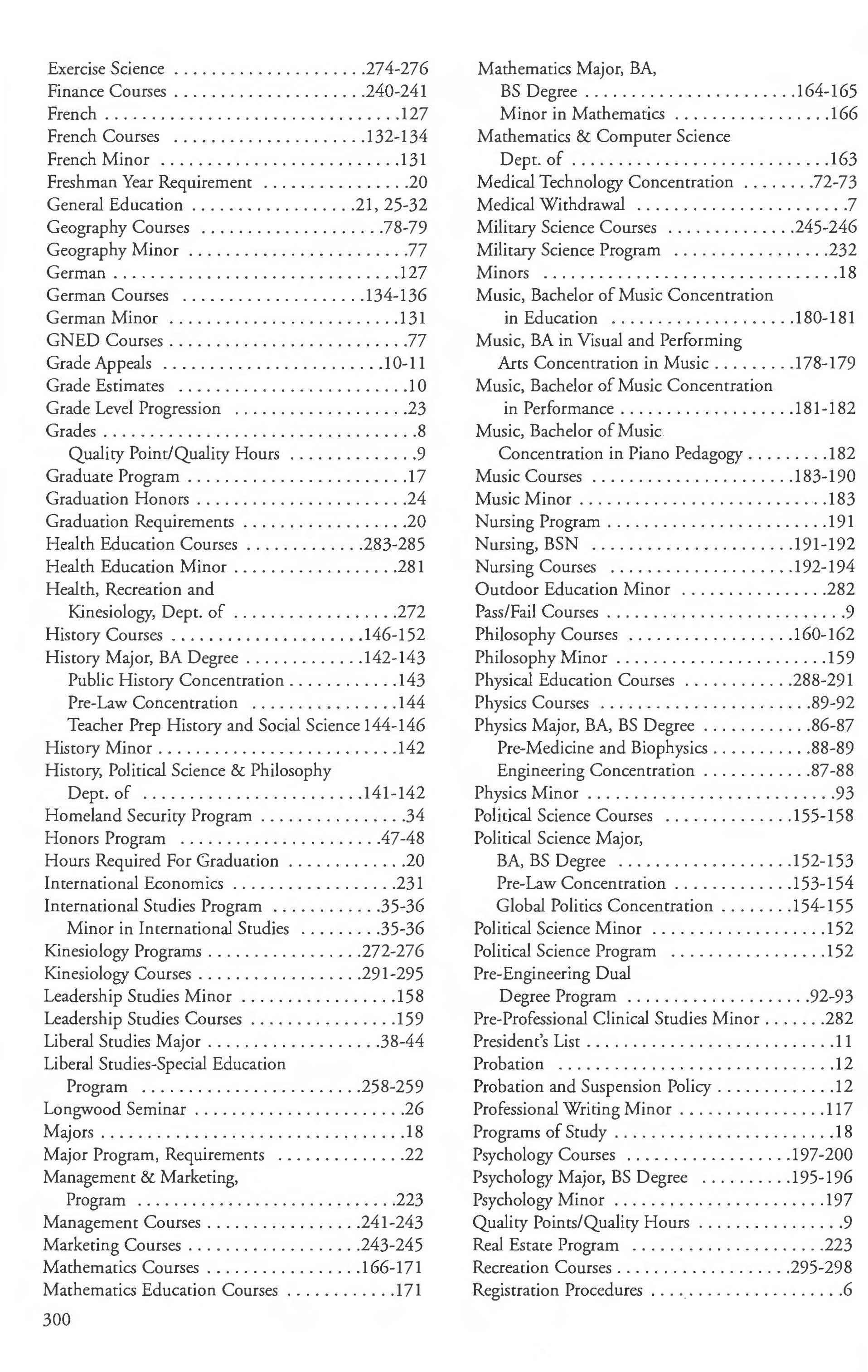 Music, Bachelor of Music Concentration Grade Level Progression 23 in Performance 181-182 Grades . .... .......... . .... . ....... . .. . . .8 Music, Bachelor of Music Quality Point/Quality Hours 9 Concentration in Piano Pedagogy 182 Graduate Program .. ..... . . . ... .. ..... .. .. 17 Music Courses ... .. . ..... ... ..... . .. 183-190 Graduation Honors 24 Music Minor 183 Graduation Requirements ... .. ...... .. ..... 20 Nursing Program ............. . ....... ... 191 Health Education Courses 283-285 Nursing, BSN ... . .... . ........ .. ... 191-192 Health Education Minor 281 Nursing Courses 192-194 Health, Recreation and Outdoor Education Minor 282 Kinesiology, Dept. of 272 Pass/Fail Courses 9 History Courses 146-152 Philosophy Courses 160- 162 History Major, BA Degree ... .. .. . .. . .. 142-143 Philosophy Minor ... .. ................ . . 15 9 Public History Concentration 143 Physical Education Courses 288-291 Pre-Law Concentration ..... . .... . ... . . 144 Physics Courses . .. .... . . .. . . . .. ...... .89-92 Teacher Prep History and Social Science 144- 146 Physics Major, BA, BS Degree 86-87 History Minor .. .. ..... ... ... ... ..... . .. 142 Pre-Medicine and Biophysics .. . .. . ..... 88-89 History, Political Science & Philosophy Engineering Concentration . ........... 87-88 Dept. of 141-142 Physics Minor 93 Homeland Security Program .34 Political Science Courses 155-158 Honors Program .47-48 Political Science Major, Hours Required For Graduation 20 BA, BS Degree 152-153 International Economics 231 Pre-Law Concentration 153-154 International Studies Program .... . . .. ... .35-36 Global Politics Concentration ........ 154-155 Minor in International Studies 35-36 Political Science Minor 152 Kinesiology Programs . . .... ... ........ 272-276 Political Science Program 152 Kinesiology Courses 291-295 Pre-Engineering Dual Leadership Studies Minor ........ . ... .. ... 158 Degree Program ... . . . ..... .. . ..... .92-93 Leadership Studies Courses 159 Pre-Professional Clinical Studies Minor 282 Liberal Studies Major . . . ............ . ... 38-44 President's List 11 Liberal Studies-Special Education Probation .... . .. . . .. .... . .. . . . . . ....... 12 Program 258-259 Probation and Suspension Policy 12 Longwood Seminar 26 Professional Writing Minor 117 Majors 18 Programs of Study 18 Major Program, Requirements 22 Psychology Courses 197-200 Management & Marketing, Psychology Major, BS Degree ..... . .... 195-196 Program 223 Psychology Minor 197 Management Courses 241-243 Quality Points/Quality Hours . ....... . ....... 9 Marketing Courses . . . ....... . ........ 243-245 Real Estate Program . .. .. . .... . ... . . ... .. 223 Mathematics Courses 166-171 Recreation Courses 295-298 Mathematics Education Courses .. .... ... ... 171 Registration Procedures .. .. . .. .......... . ... .6 300