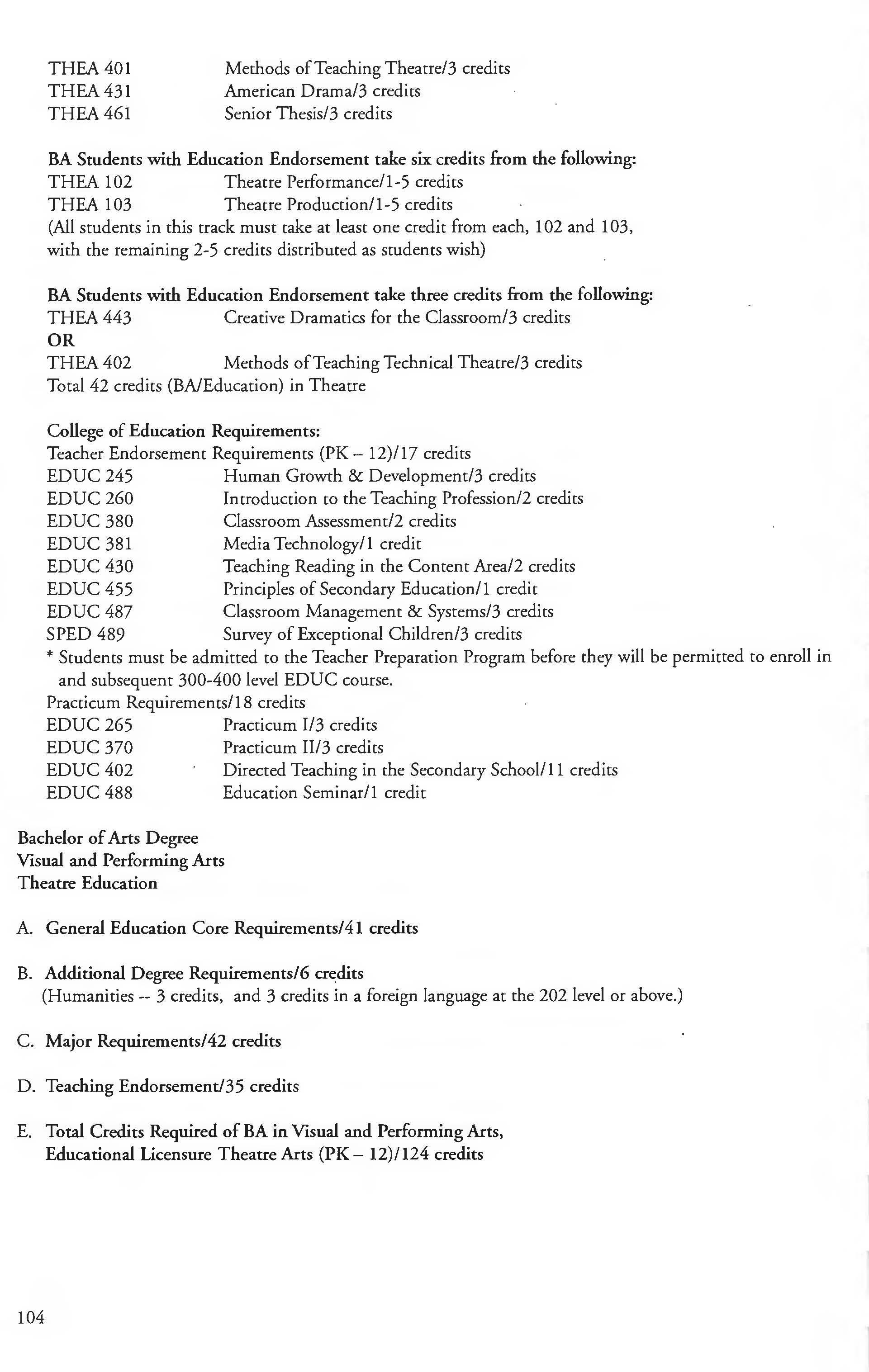 Visual and Performing Arts, BA degree, Theatre Education .................... 104