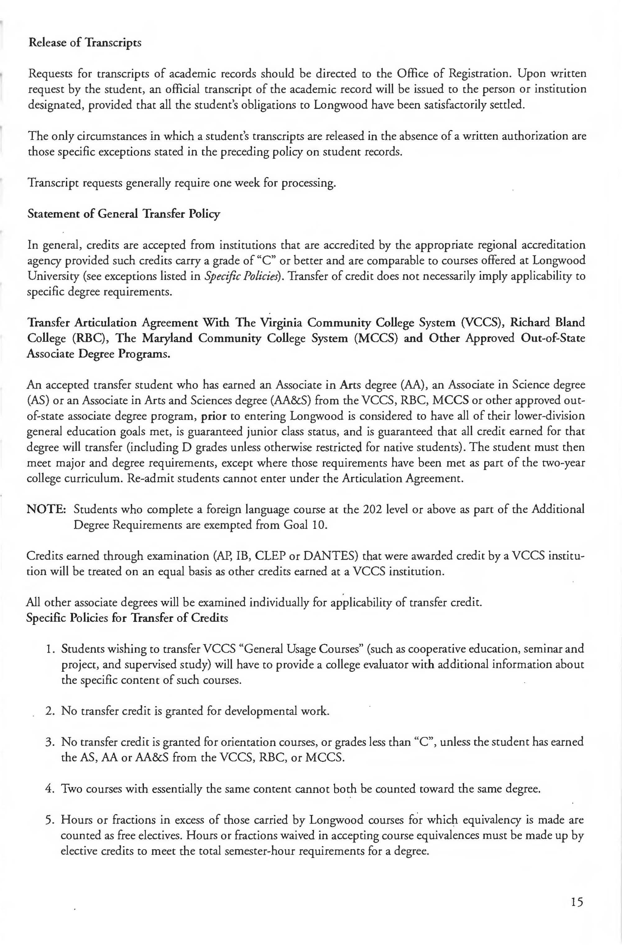 Transcripts, Release of ............... ..... . 15 Transfer Policy with Community Colleges ................ 15-16