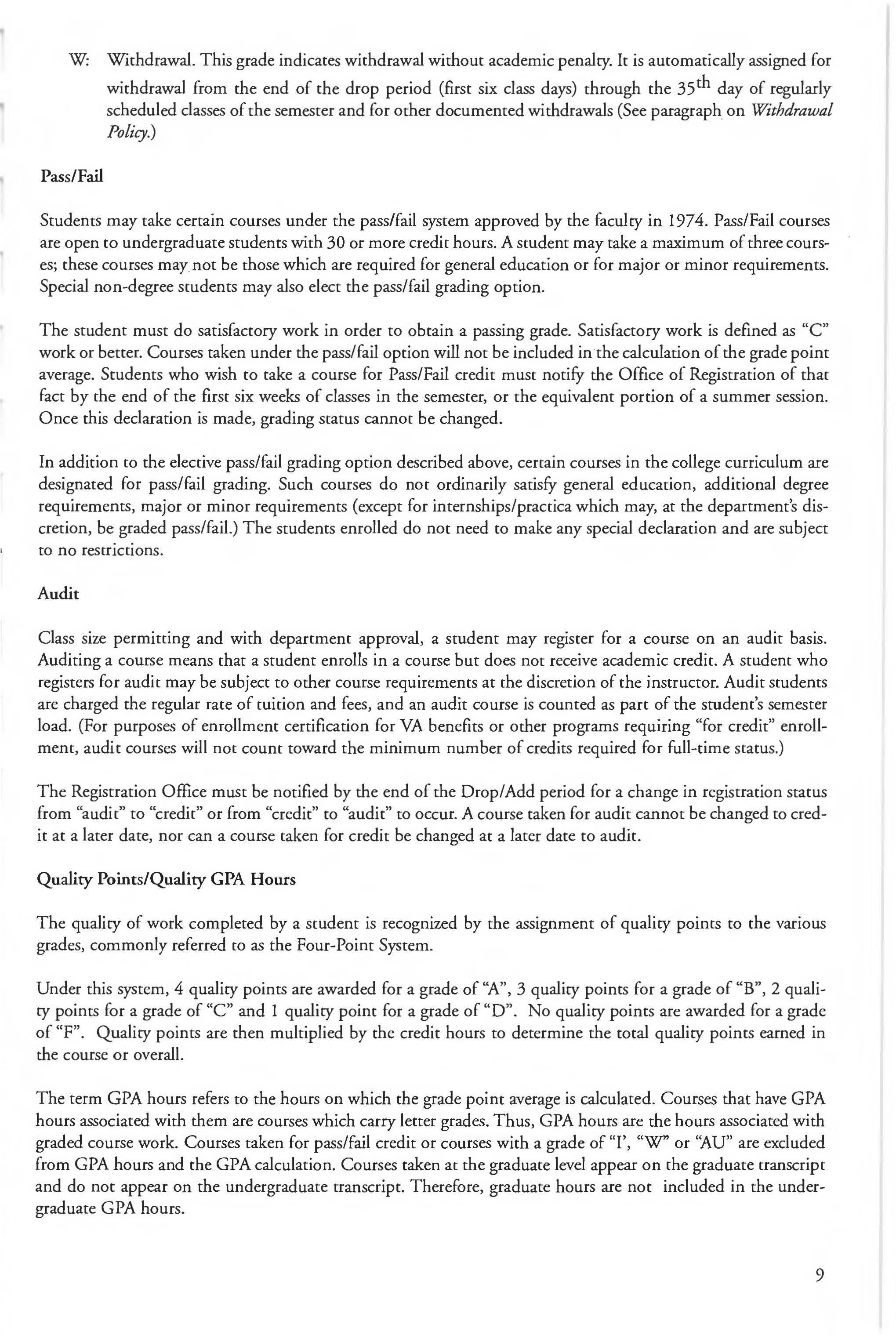 Students may withdraw from individual classes with a grade of "W' (not computed in the GPA) through 5:00 p.m. on the 35th day of regularly scheduled classes. Residential students who fall below full-time status with such a withdrawal will be referred to the Vice President for Student Affairs for special permission to remain in the residence hall.
