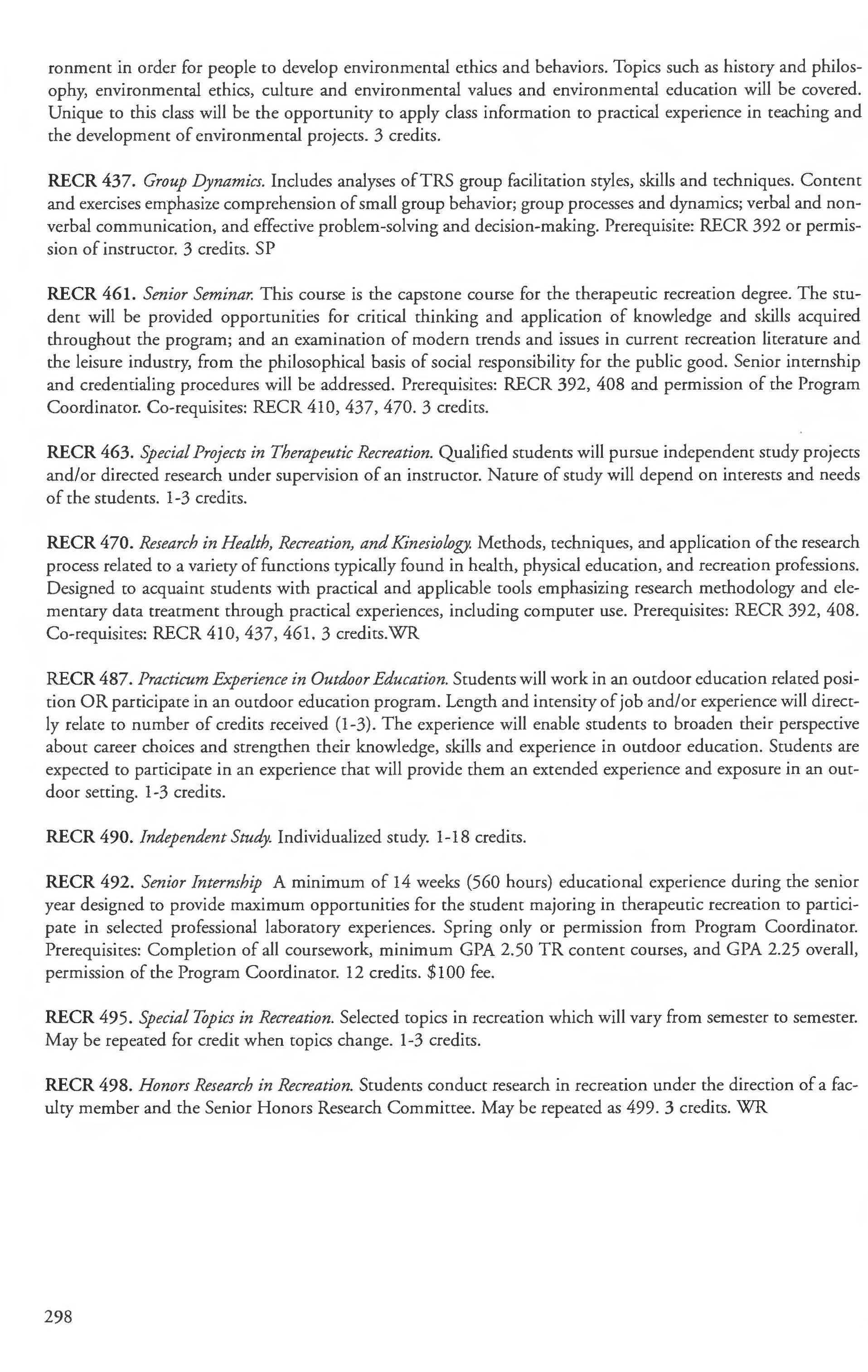 RECR 461. Senior Seminar. This course is the capstone course for the therapeutic recreation degree. The student will be provided opportunities for critical thinking and application of knowledge and skills acquired throughout the program; and an examination of modern trends and issues in current recreation literature and the leisure industry, from the philosophical basis of social responsibility for the public good. Senior internship and credentialing procedures will be addressed. Prerequisites: RECR 392, 408 and permission of the Program Coordinator. Co-requisites: RECR 410, 437, 470. 3 credits.