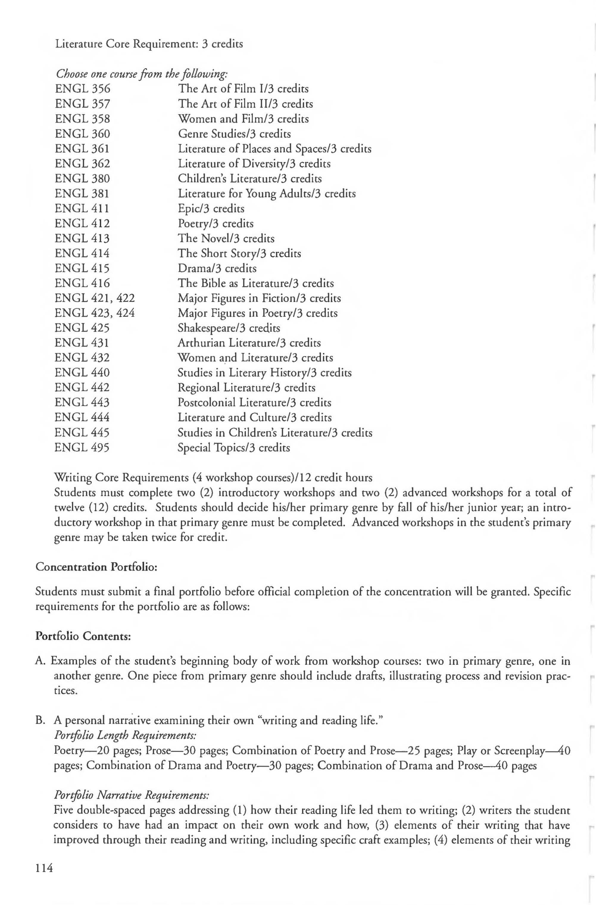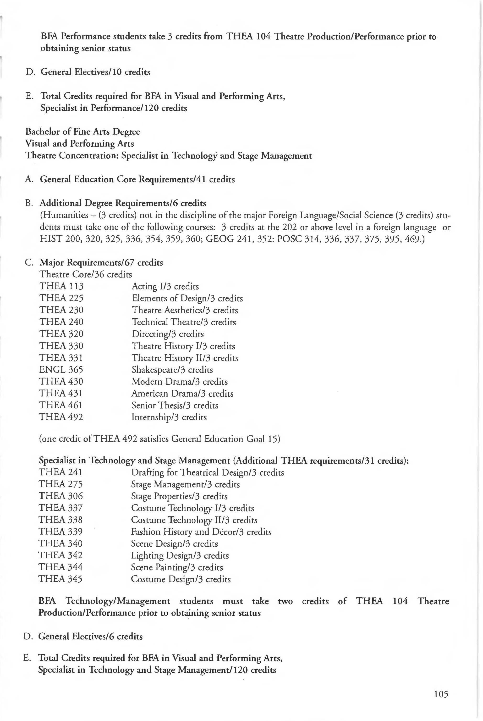 Visual and Performing Arts, BFA degree, Theatre Concentration, Specialist in Performance .... . . .. ..... . . 104