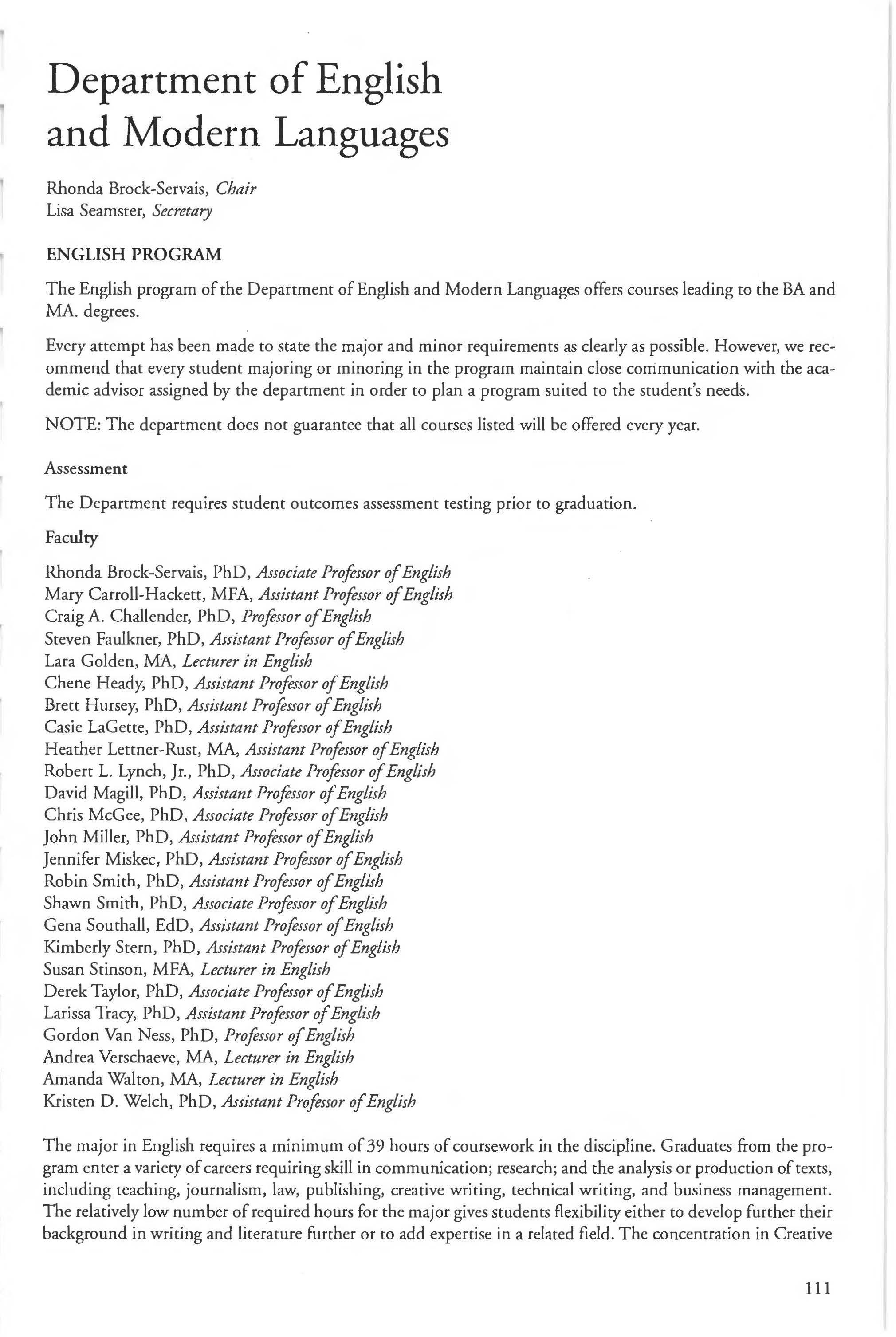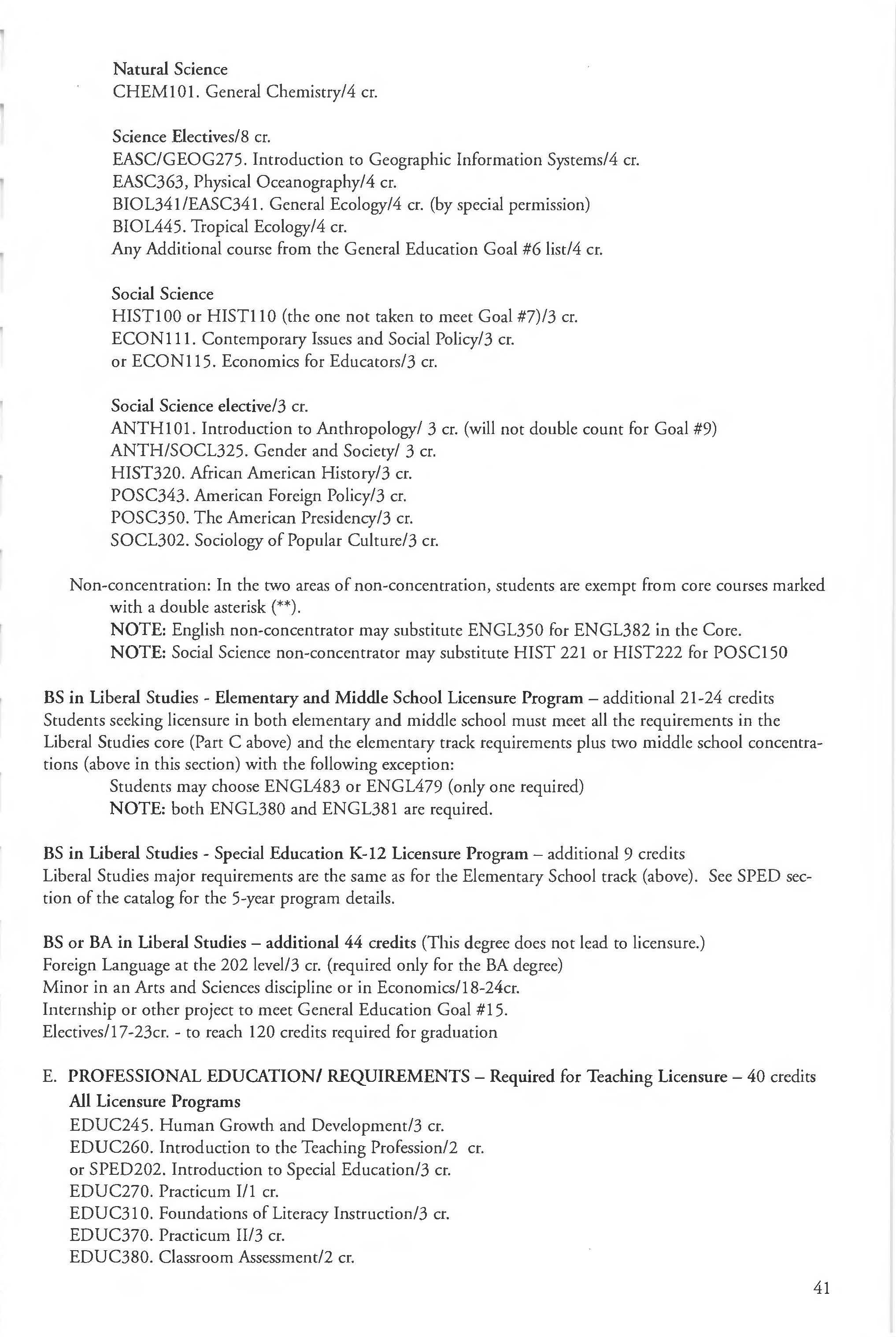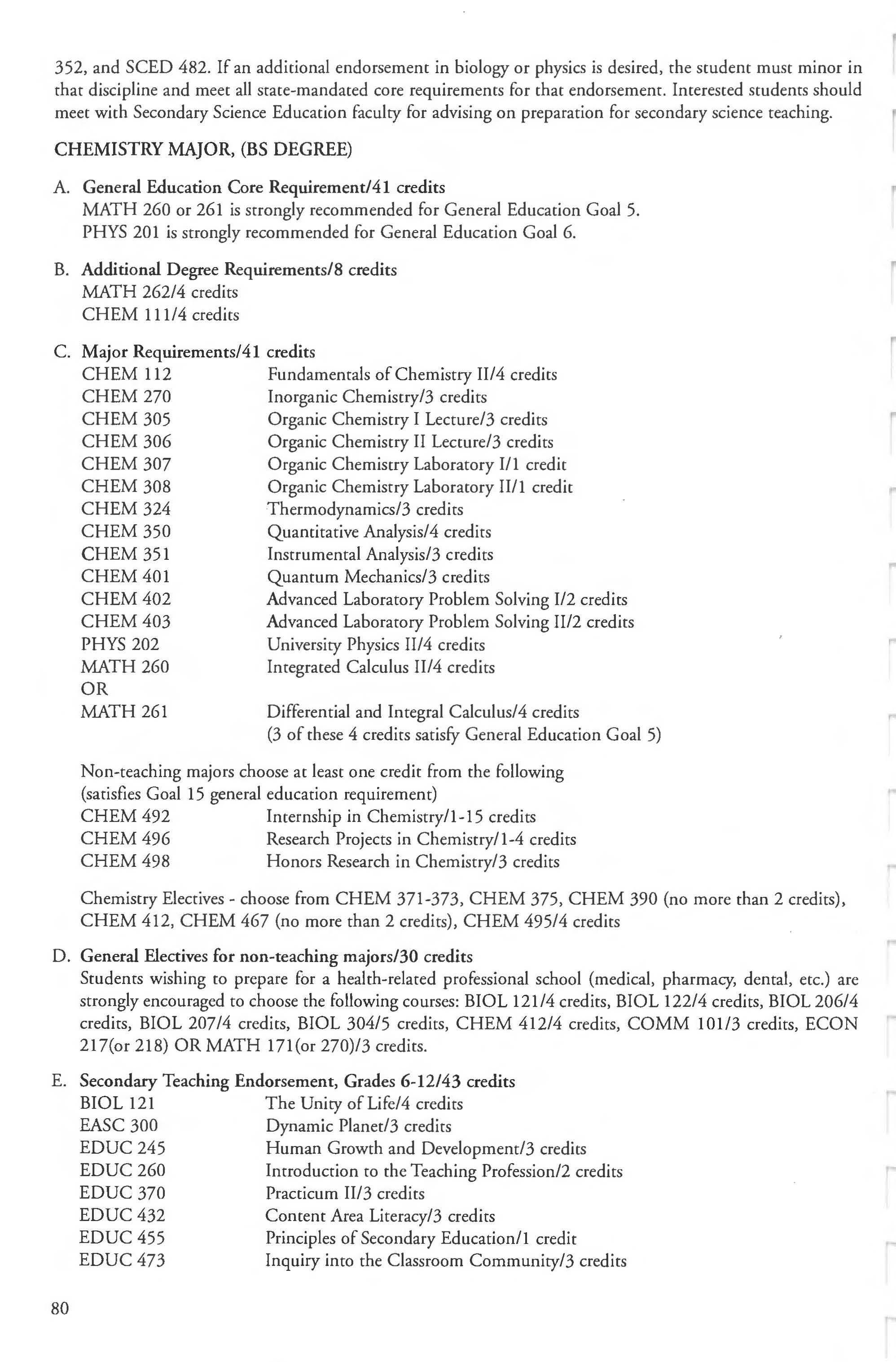 Business Major, BSBA Degree 220 Education Program 244 Business Minor 225 Education, Special Education Chemistry Courses 81 Dept. of ... . ...... .. . . . ... ........ .. 244 Chemistry Major, Elementary and BA, BS Degree 80 Middle School Education Program 248 Chemistry Minor ......... ... ............ 81 English Courses .. . . . .... . . ... .. . .. .. .... 118 Class Attendance 6-7 English Major, BA Degree 112-115 Coaching Minor .. .. ·......... . ... ... .... 278 English Minors 115 College of Business & Economics 214 English & Modern Languages, Dept. of 111-1 12 College of Education & Human Services 245 Environmental Studies Minor 65 College of Arts & Sciences 33 Examinarions ... . ....... .. ..... ... . . . .... .7