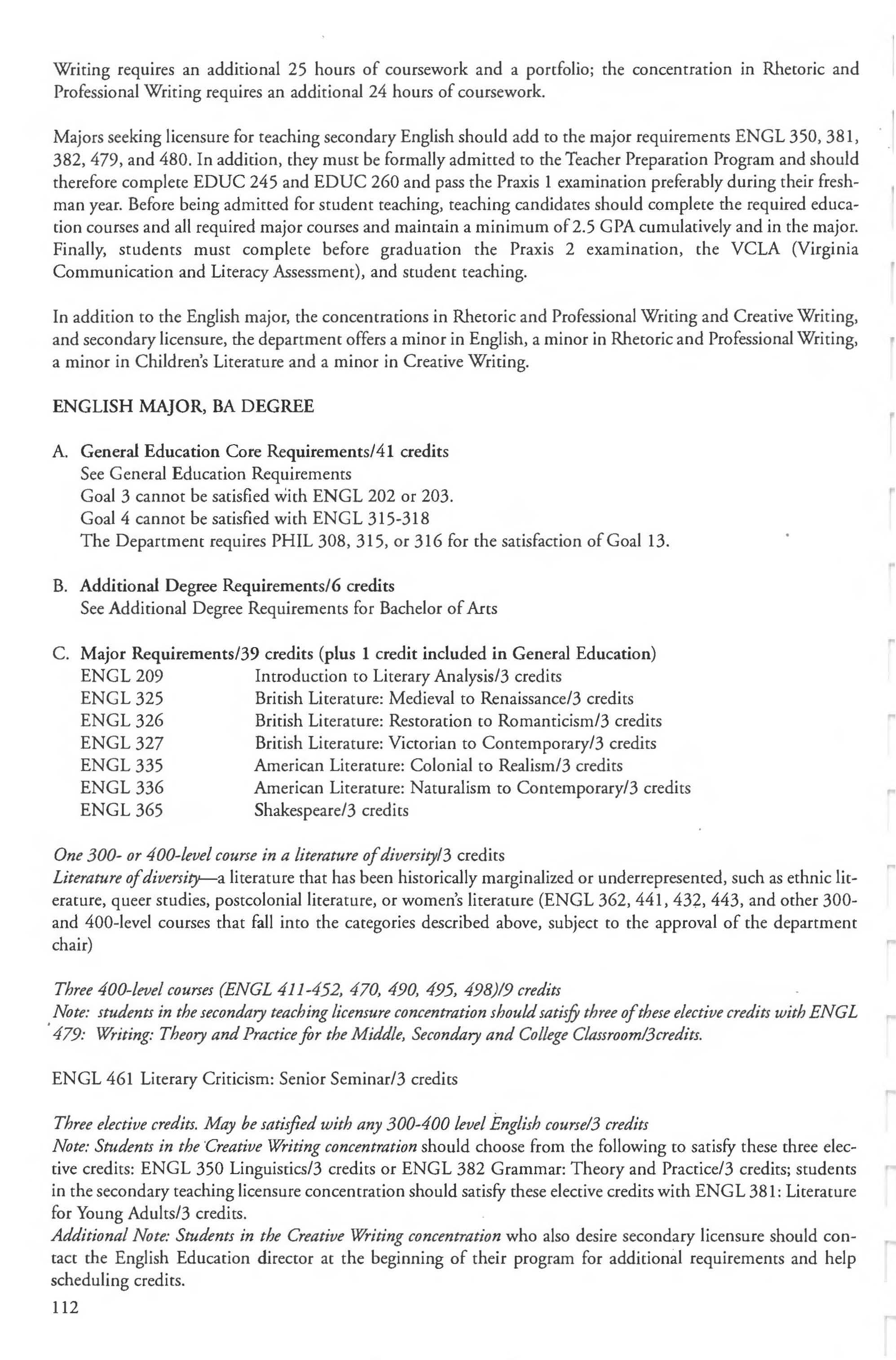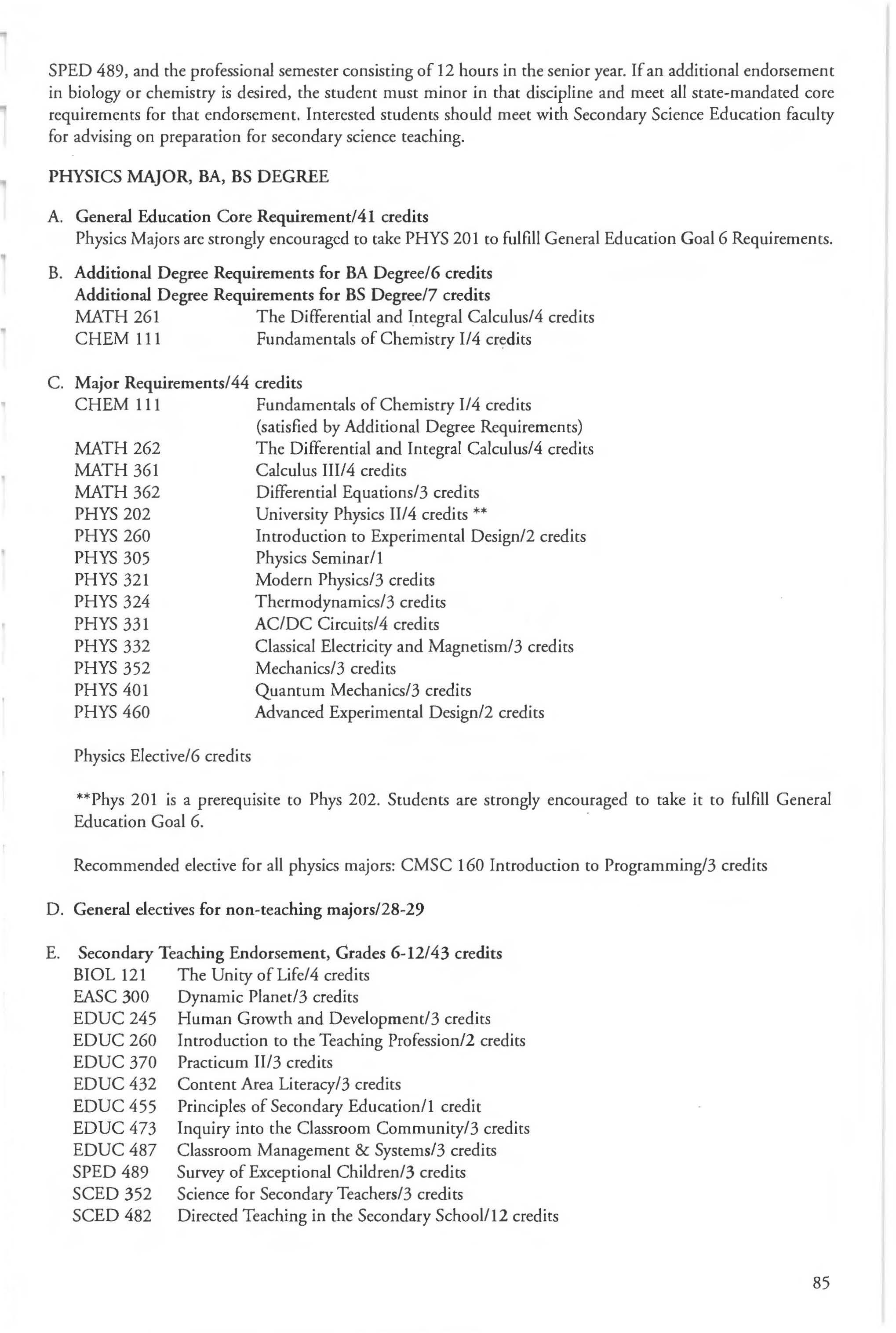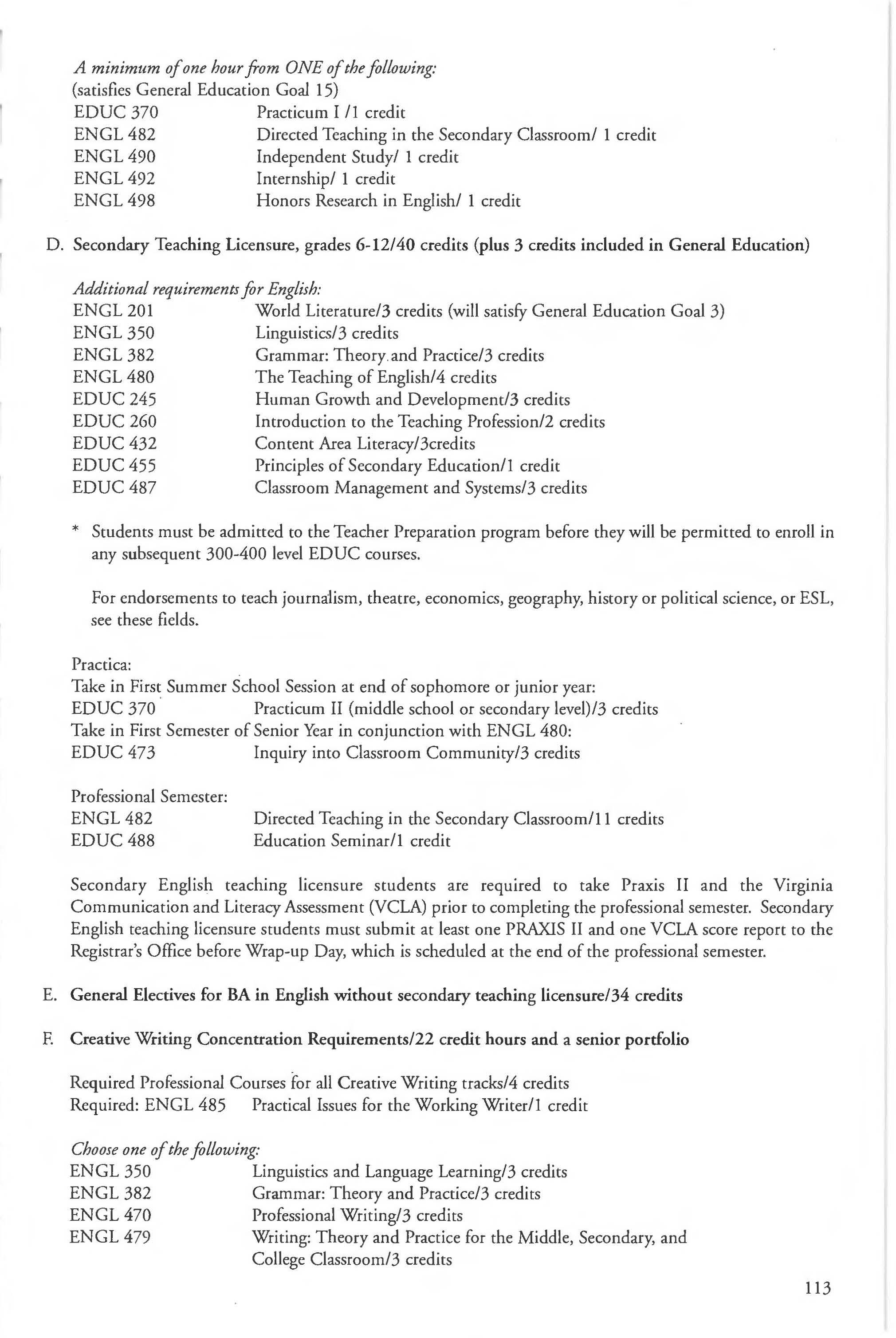 Business Major, BSBA Degree 220 Education Program 244 Business Minor 225 Education, Special Education Chemistry Courses 81 Dept. of ... . ...... .. . . . ... ........ .. 244 Chemistry Major, Elementary and BA, BS Degree 80 Middle School Education Program 248 Chemistry Minor ......... ... ............ 81 English Courses .. . . . .... . . ... .. . .. .. .... 118 Class Attendance 6-7 English Major, BA Degree 112-115 Coaching Minor .. .. ·......... . ... ... .... 278 English Minors 115 College of Business & Economics 214 English & Modern Languages, Dept. of 111-1 12 College of Education & Human Services 245 Environmental Studies Minor 65 College of Arts & Sciences 33 Examinarions ... . ....... .. ..... ... . . . .... .7