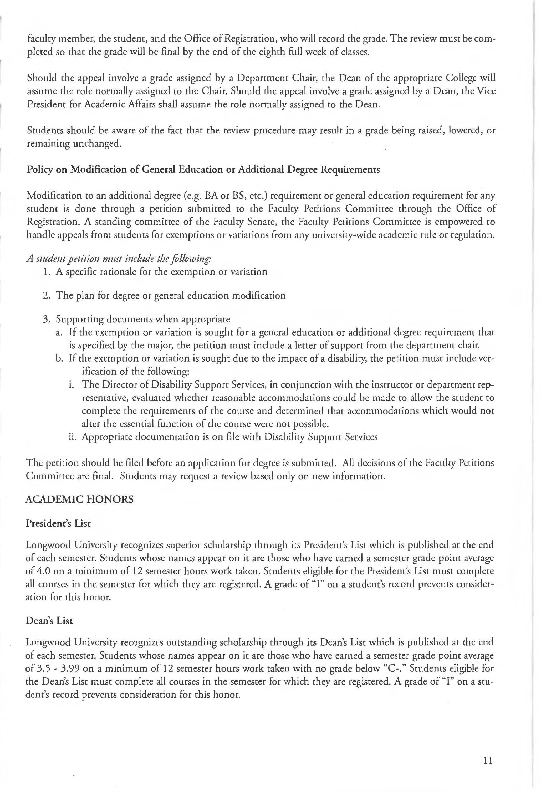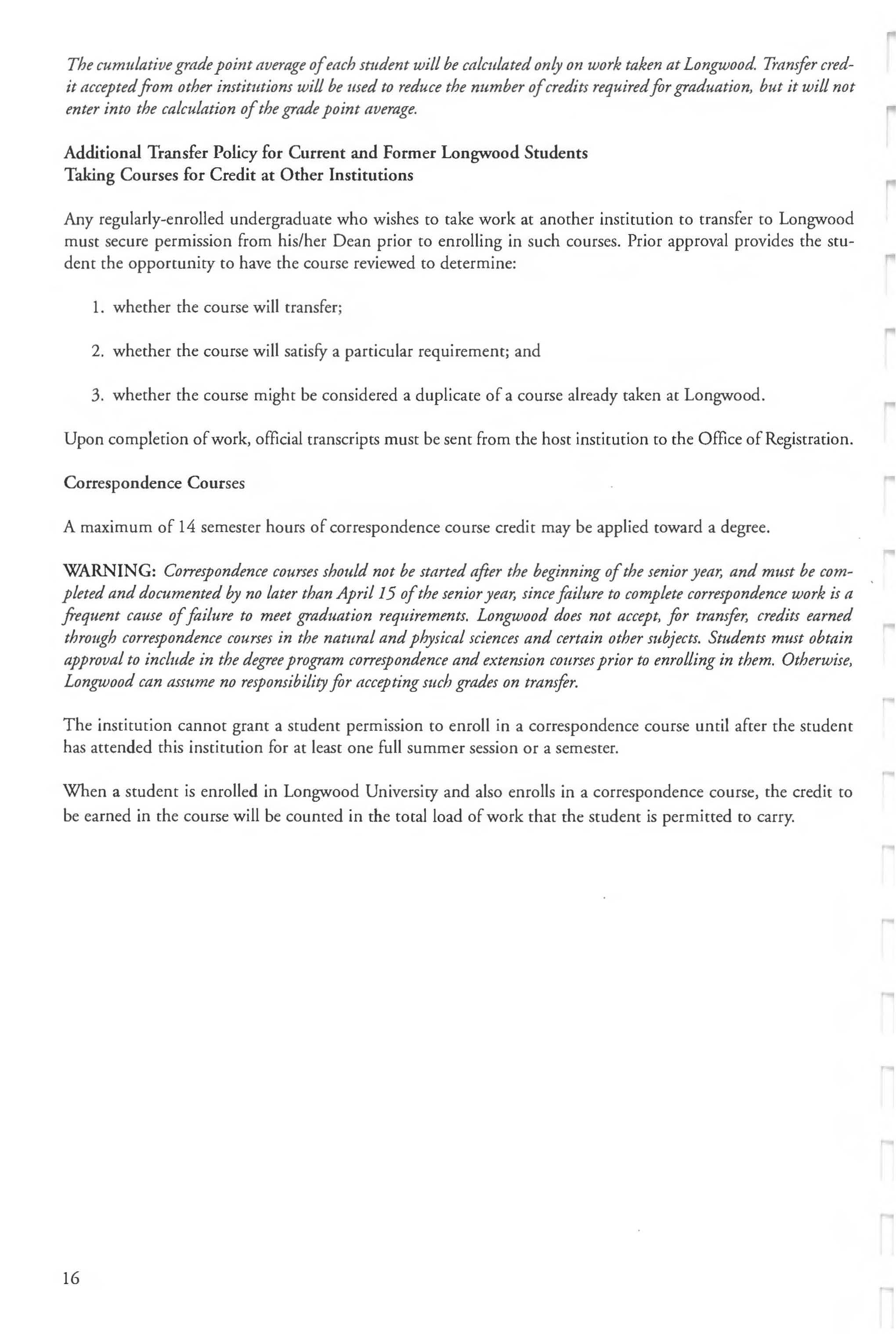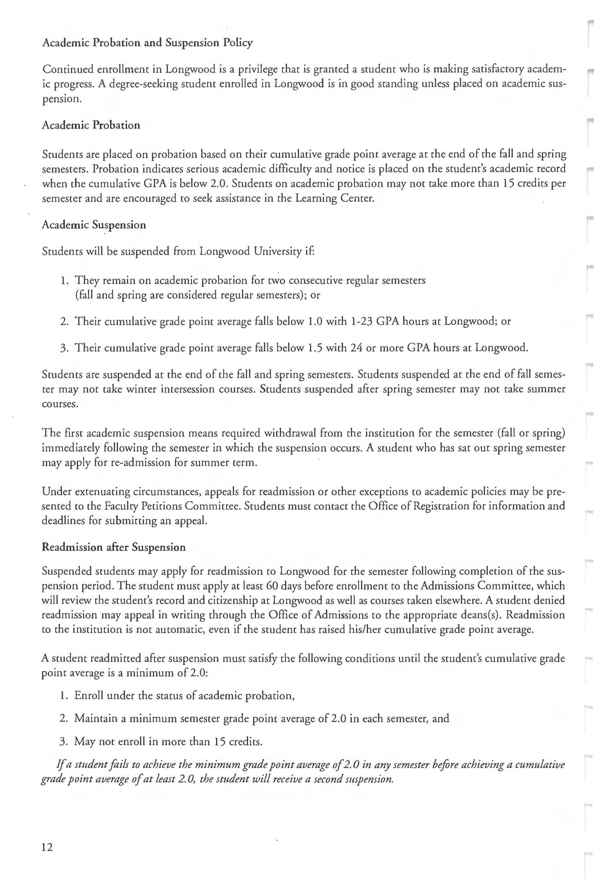 This section summarizes important information related to the academic work of the institution. Students muse be familiar with the information in chis section. le is the responsibility of each student to be certain chat academic requirements necessary for graduation are completely fulfilled. The catalog for the year in which a student enters Longwood University governs academic regulations, general education, and graduation requirements. Transfer students may choose the catalog which applies to continuous full-time students at their class level. If a student re-enrolls in Longwood University after an absence of two or more semesters, the applicable catalog will be the one in effect at the time of re-enrollment.