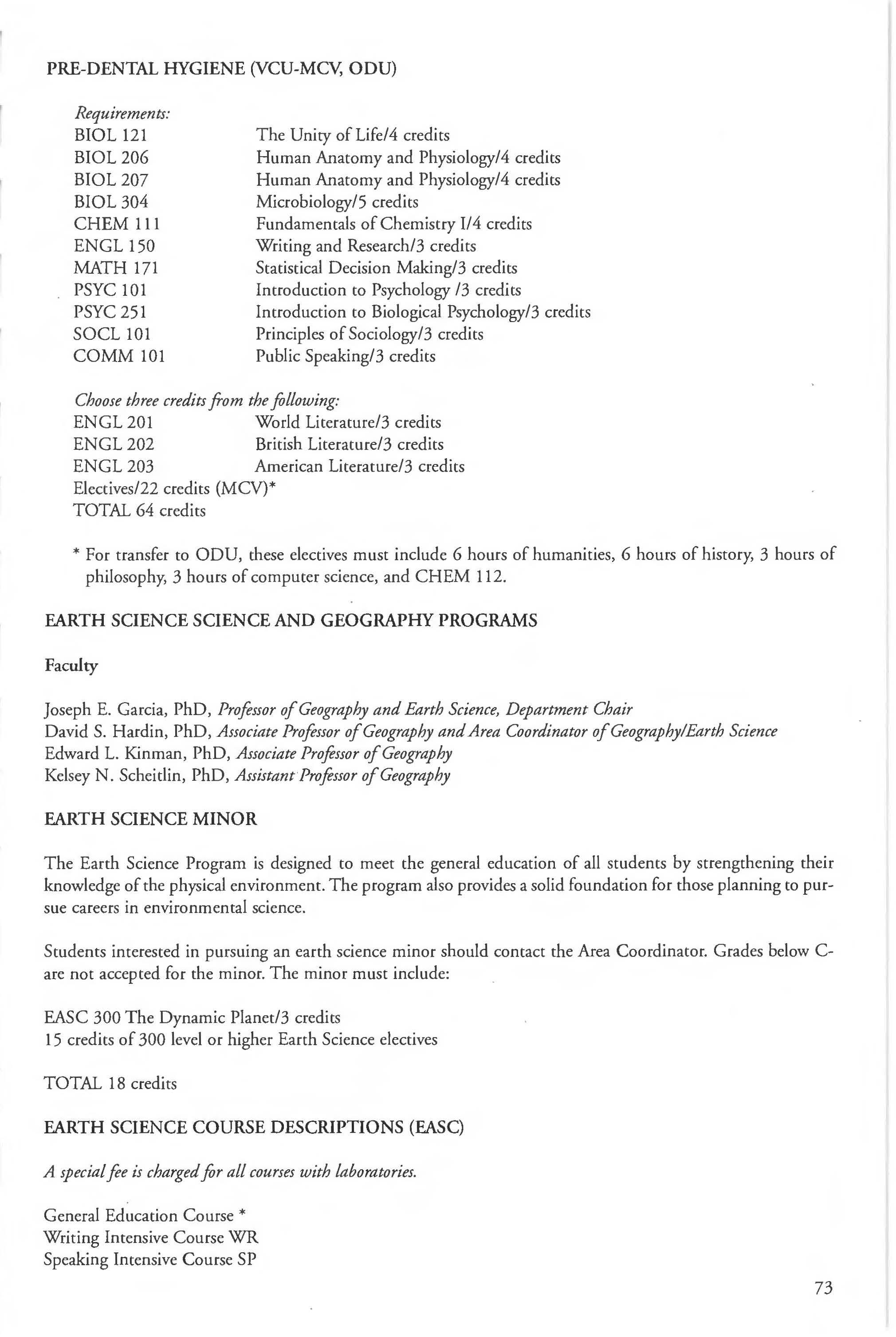 Athletic Training Program 27 3 Dean's List 11 Athletic Training Courses 282 Declaration of Major ....... . ............ . . . 5 Auditing Classes 9 Disclaimer Statement 1 Biology Courses .... . ...... ... . . ... . ...... 66 Driver Education Endorsement 271 Biology Major, BA, BS Degree 63 Drop Period 6 Medical Technology Concentration . ....... ... 70 Earth Science Courses 74 Concentration in Pre-Dentistry 70-73 Earth Science Minor 73 Pre-Medical, Economics Major 226 Pre-Physical Therapy, or Economics Courses . ..... . ...... .. ... . . .. 232 Pre-Veterinary Medicine Economics Minor 227 Biology Minor ..... ... .. ..... ...... ... ... 65 Education Courses ...... . .. . ............ 251