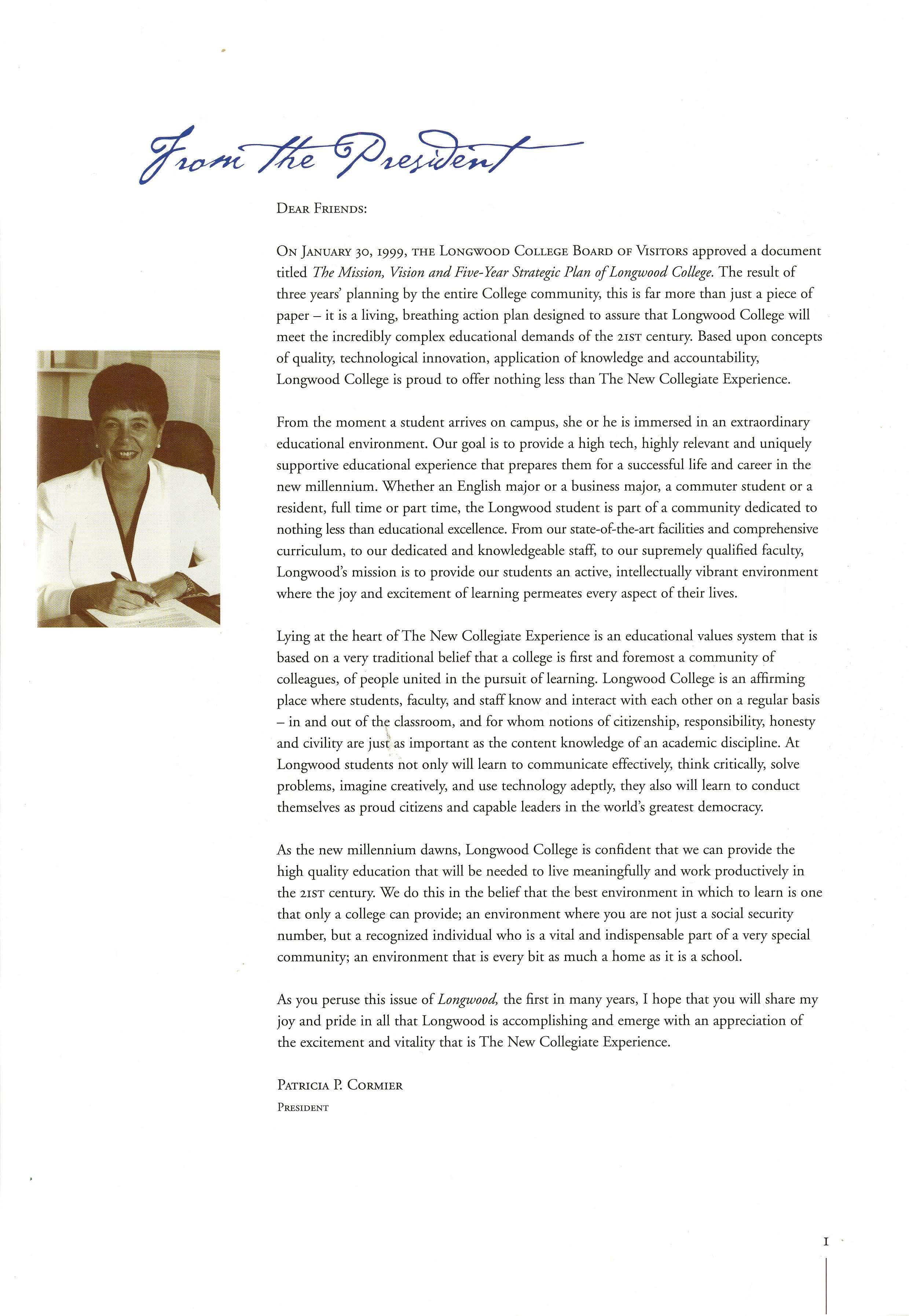 many Longwood faculry as friends. With such a dedicated faculry, I could see why ' The Longwood Experience' was revered and continues to be revered. Thanks to the dynamic leadership of President Cormier and a splendid Board, I am confident the scholarship will enhance The New Collegiate Experience, assuring Longwood's continued v1s10n for excellence into che new millennium."