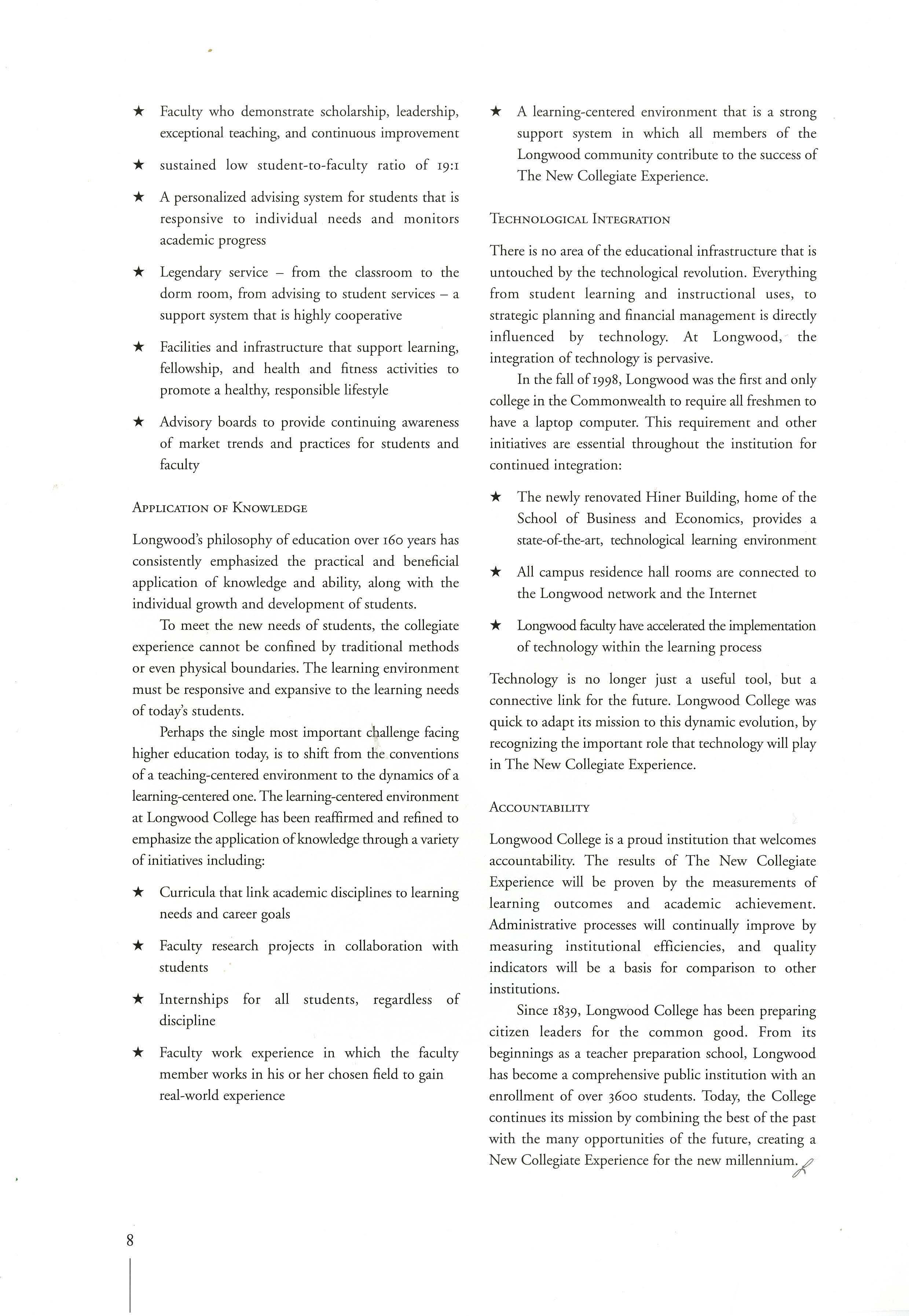 ON JANUARY 30, 1999, THE LONGWOOD COLLEGE Board OF VISITORS approved a document titled The Mission, Vision and Five - Year Strategic Plan of Longwood College. The result of three years' planning by the entire College community, this is far more than just a piece of paper - it is a living, breathing action plan designed to assure that Longwood College will meet the incredibly complex educational demands of the 21ST century. Based upon concepts of quality, technological innovation, application of knowledge and accountability, Longwood College is proud to offer nothing less than The New Collegiate Experience.