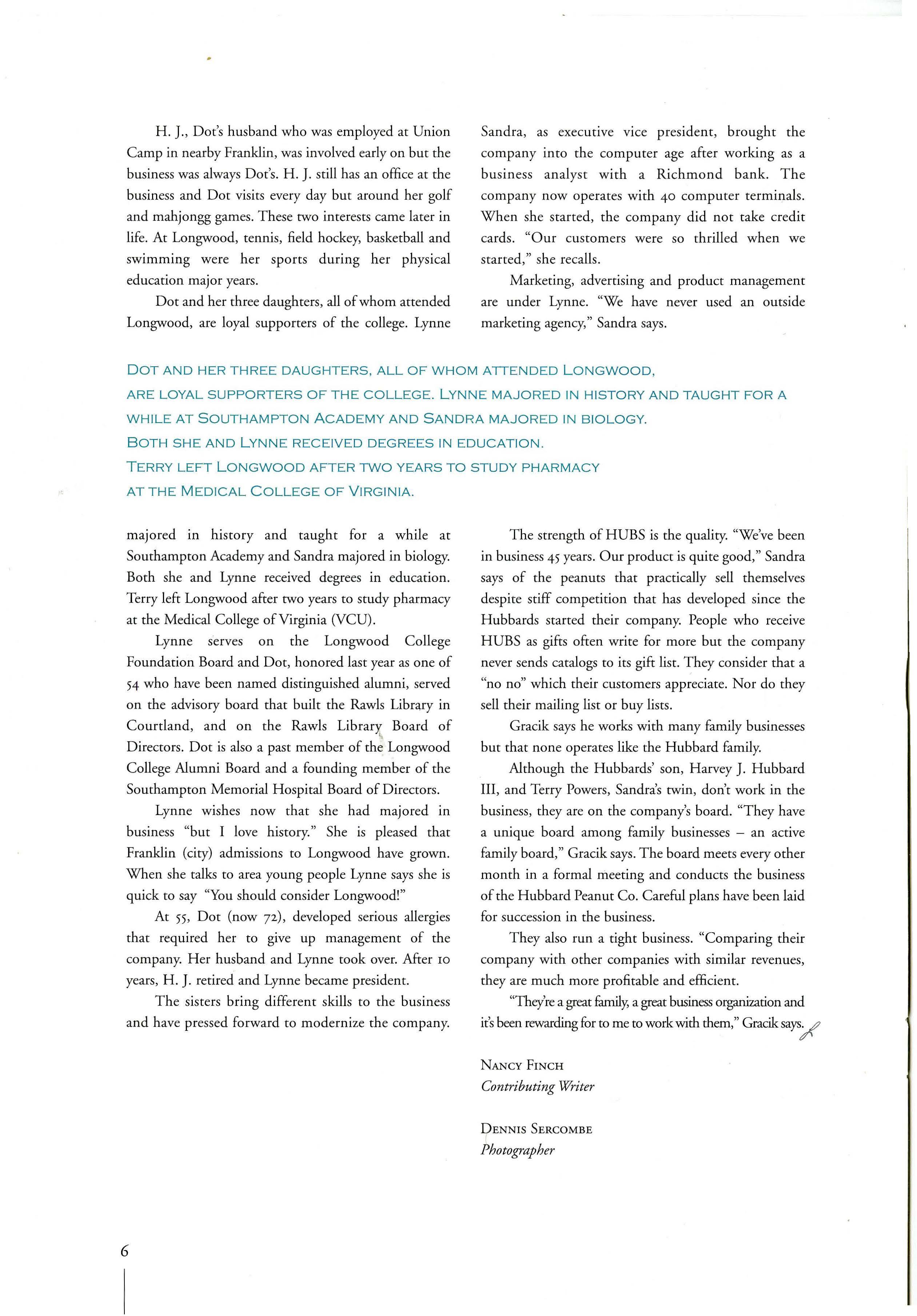 From a start of cooking 25 pounds of peanuts a week in 1954 in her Southampton County kitchen, Longwood alumna Dot Hubbard's 45-year old company now processes one million pounds of HUBS peanuts a year.