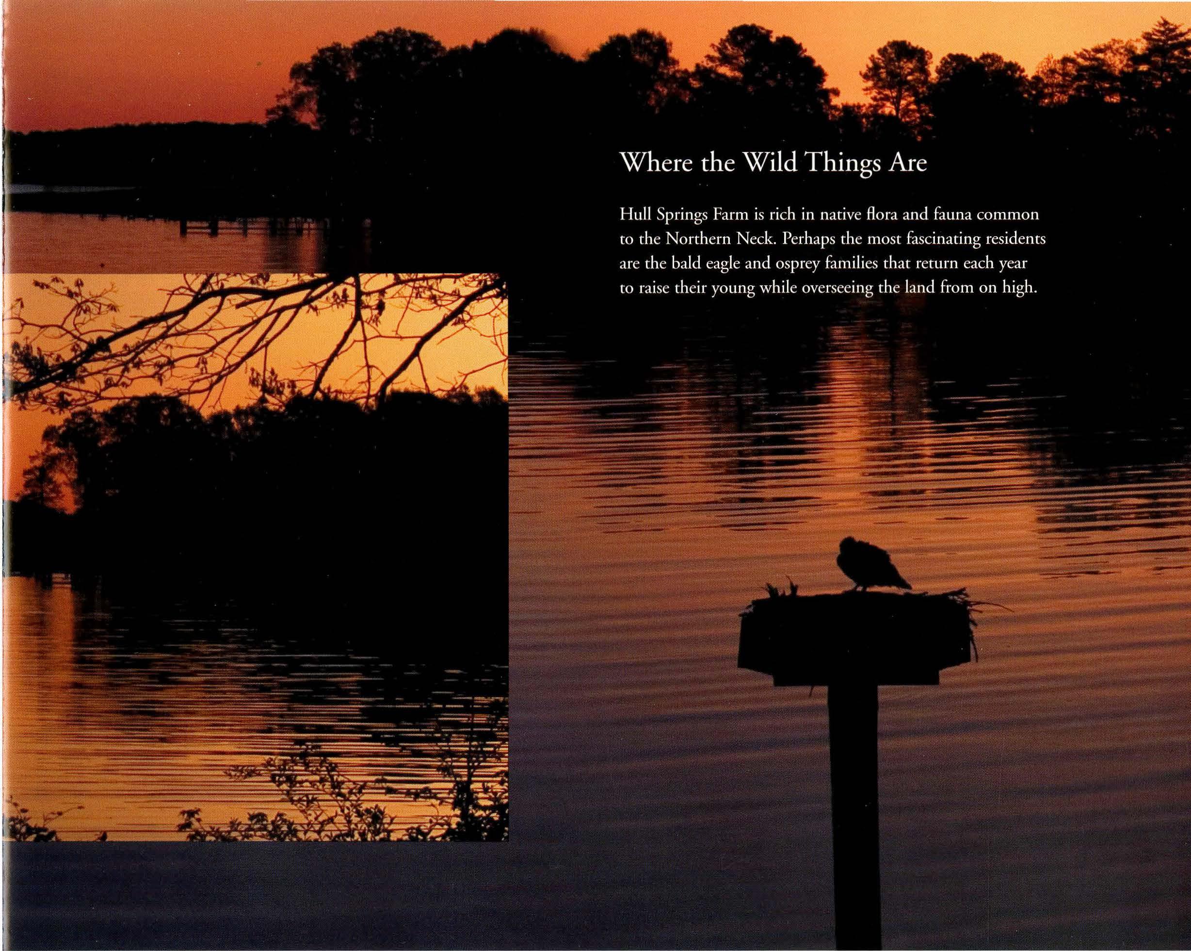 Hull Springs Farm consists ofapproximately 637 acres in Westmoreland County on Virginia's Northern Neck. Nestled between two tidal creeks,Aimes Creek and Glebe Creek, the farm is bordered by approximately 8,000 feet of relatively undisturbed shoreline. Those creeks feed into the Lower Machodoc Creek which empties into the Potomac River, a primary tributary to the Chesapeake Bay.