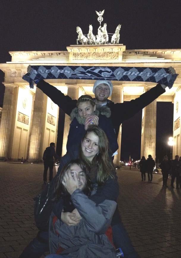 Got any photos of yourself wearing or holding Longwood gear—a shirt, hat or scarf—from anywhere around the country or the world? We’d love to publish it in the magazine, alumni newsletter or other publications. Please email such photos to alumni@longwood.edu. Displaying their Lancer scarf at the Brandenburg Gate in Berlin, Germany, are Longwood students (from bottom) Chris Caudill ’13, Olga Knop ’11, Kaye Goulding ’13 and Ben Miethke ’13.