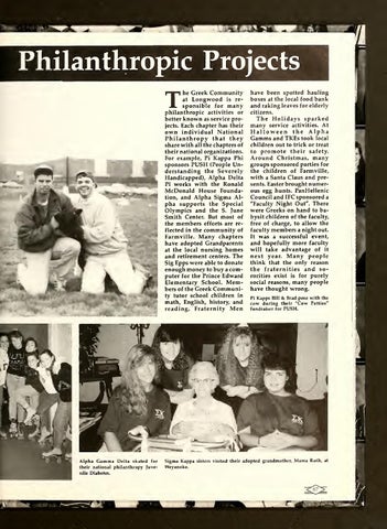 with a Santa Claus and presents. Easter brought numerous egg hunts. PanHellenic Council and IFC sponsored a "Faculty Night Out". There were Greeks on hand to babysit children of the faculty, free of charge, to allow the faculty members a night out. It was a successful event, and hopefully more faculty will take advantage of it next year. Many people think that the only reason