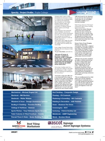 really hard to get the new classrooms set up and to see them buzzing and excited about the new technologies and facilities available to us is extremely rewarding.” Robin Young, chairman of the board of governors, said it was an exciting time for the school. “They’re all very excited. Obviously moving house, you’re excited the first time you move in. To have the school on one site is a first for many years for Foyle and certainly the staff will appreciate not having to move between the old junior school and the senior school two or three times a day as was the case before.” Damian Heron, Group Managing Director of Heron Bros commented, “Heron Bros is delighted to handover this marvellous campus to Foyle College and Ebrington Primary School and Nursery. We have enjoyed a very positive relationship with the schools and the entire project team which enabled us to deliver a highquality project ahead of schedule.” “Although it has just been completed, the project is already award-winning. The £27m campus picked up the prestigious accolade of the ‘UK’s Most Considerate Site 2017 for £10m – £50m Projects’ at the Considerate Constructors Scheme National Site Awards. Heron Bros was acknowledged for demonstrating the very highest level of consideration in respect of the community, environment and workforce.” “We are incredibly proud of our whole project team and their dedication to operating our construction site to such a high standard. We look forward to see what the future holds for the schools and wish the staff and pupils success and happiness in their new home.”