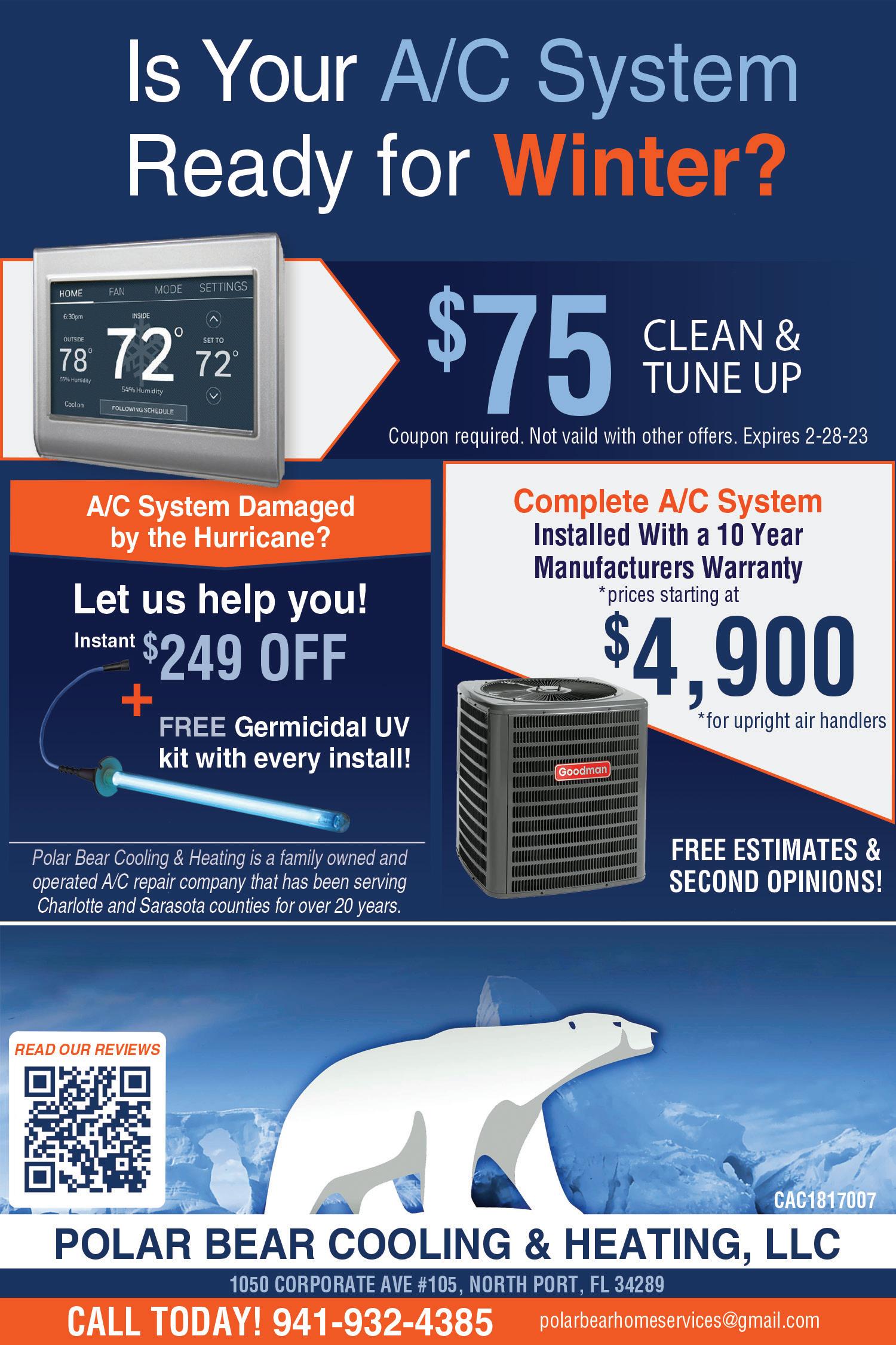 37 80,000 MAGAZINES MAILED EVERY 3 WEEKS TO PREFERRED HOMEOWNERS Find us on google and facebook SCAN FOR OUR WEBSITE! Service • Replacement • Maintenance Indoor air quality • Storm damage to AC equipment STORM DAMAGE? WE CAN HELP! STORM DAMAGE? WE CAN HELP! 941.548.9258 LIC# CAC1819473 Mention this ad for FREE WIFI THERMOSTAT UPGRADE with new AC system purchase until Jan 31,2023 Now accepting new maintenance customers