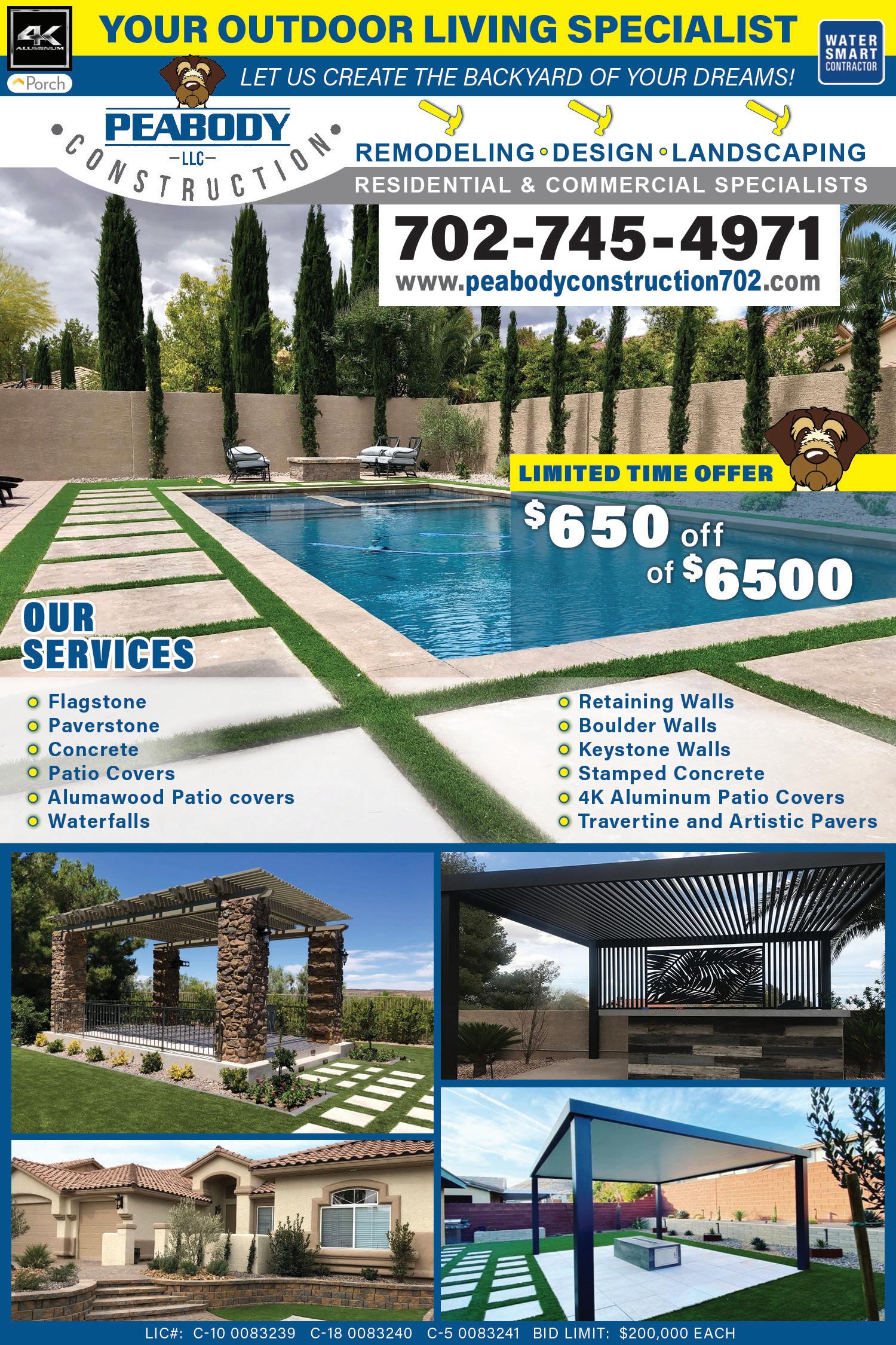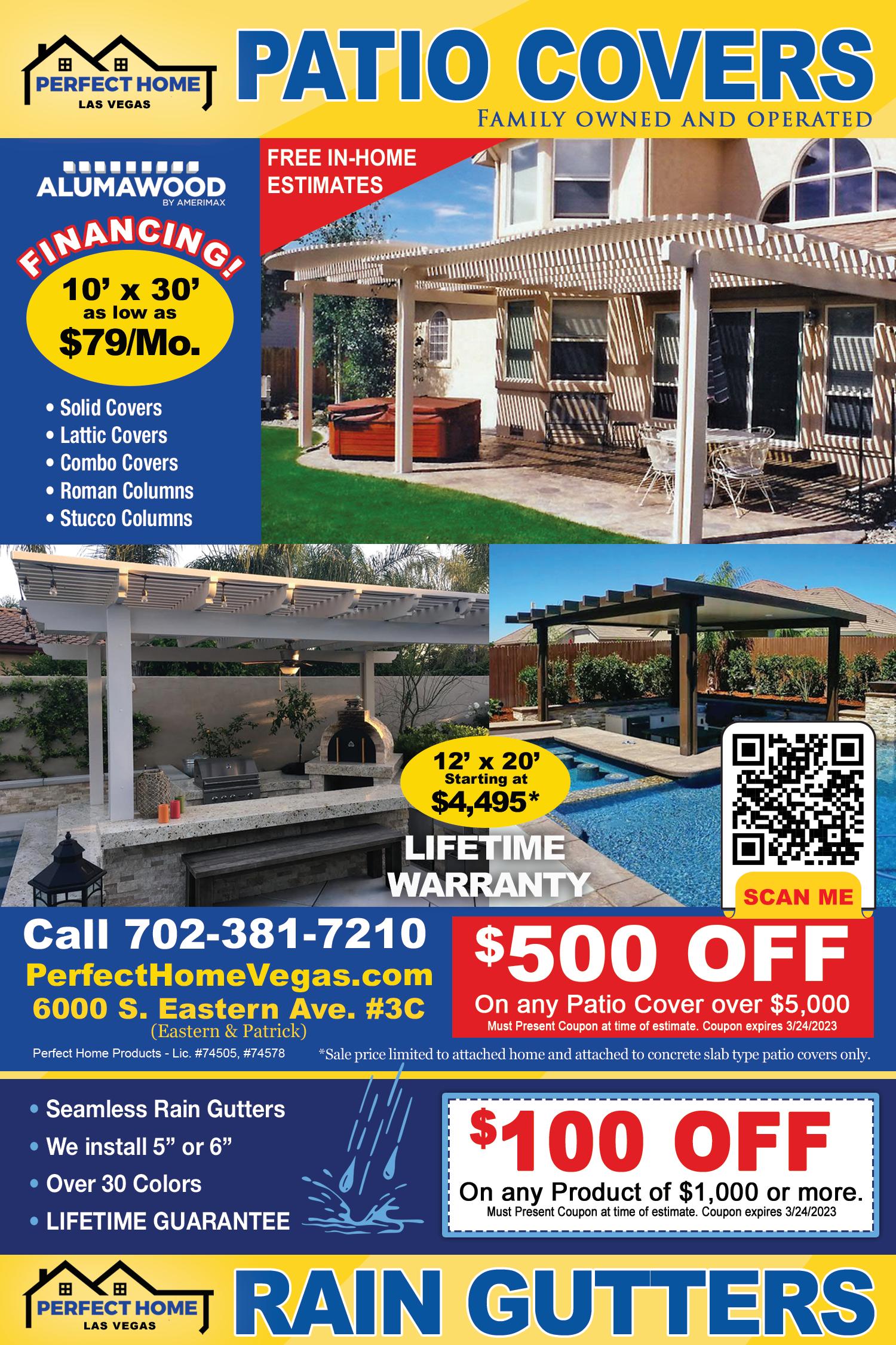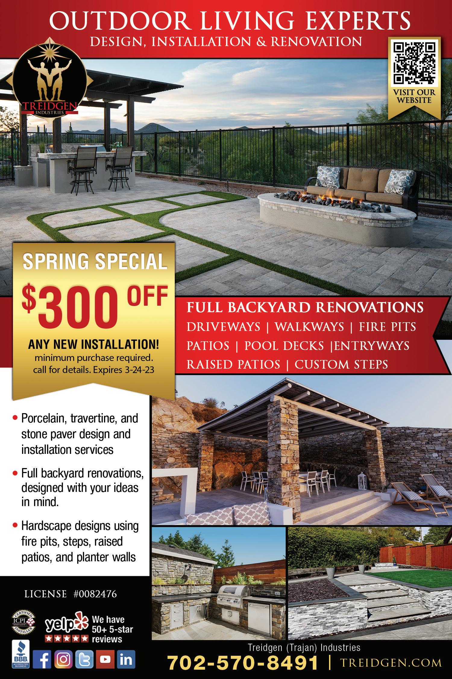 46 FEBRUARY 20 2023 | Local Professionals Only A Call Away | ImproveYourHouse.com 702.509.7260 702.509.7260 SE HABLA ESPAÑOL SE HABLA ESPAÑOL LICENSES #65168 | #75850 | #75851 | #76122 | #76157 | #80021 BONDED AND INSURED Call Now for your FREE In-Home Estimate! The REAL One Stop Shop for ALL Your Backyard Needs! The REAL ALL Your Backyard Needs! VISIT OUR WEBSITE FINANCING AVAILABLE! FINANCING AVAILABLE! PROFICIENTPATIOS.COM NO INTEREST FOR 12 MONTHS OR LOW APR O.A.C. • Custom patio covers • Landscape Installs • Pavers & Retaining walls • Retractable Shades • Garage Floors • Outdoor Kitchens • Hot Tubs • Custom Concrete • Patio Furniture • Custom Water & Fire Features Come check out our 25000 Sq˙ ˙ Sho oom Come check out our 25000 Sq˙ ˙ Sho oom Located at 3310 S. Valley View Blvd. (Desert Inn & Valley View)
