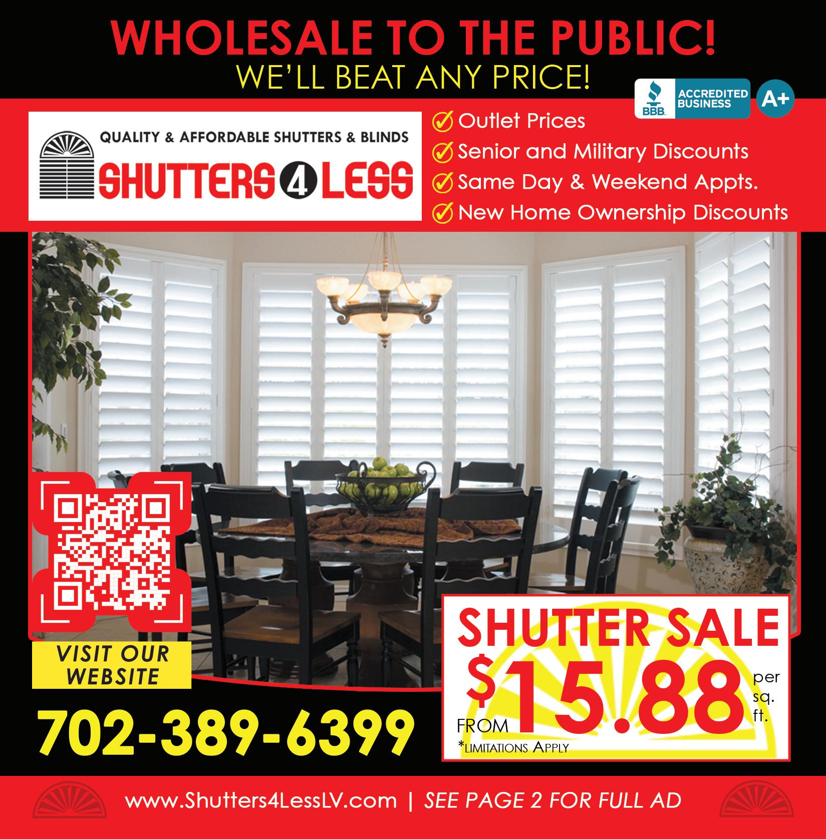 71 200,000 MAGAZINES MAILED EVERY 3 WEEKS TO PREFERRED HOMEOWNERS ShuGalaxyers JUST GREAT SHUTTERS & BLINDS! Our sliding glass doors can be bi-pass or bi-folding! • Qual ity Wood or Poly Shutters • Not Over-Priced Poly • Not Plastic • Not Composite • Smooth And Stained Finishes • 2 1/2”, 3 1/2”, and 4 1/2” Louvers french door mountings and cutouts! 702-221-8002 Call today for a FREE In-Home Estimate! VISIT US! GALAXYSHUTTERS.COM Ask About Additional Discounts for Full House Installs ELEGANT DRAMATIC COST EFFECTIVE (more than 10 windows) NEW HOME BUYER SPECIAL 2” & 2 1/2 ” POLY BLINDS Fast Delivery Great Prices with Installation GORGEOUS BELL TOP SHUTTERS! $500 OFF ANY PURCHASE Ask for details. UP TO