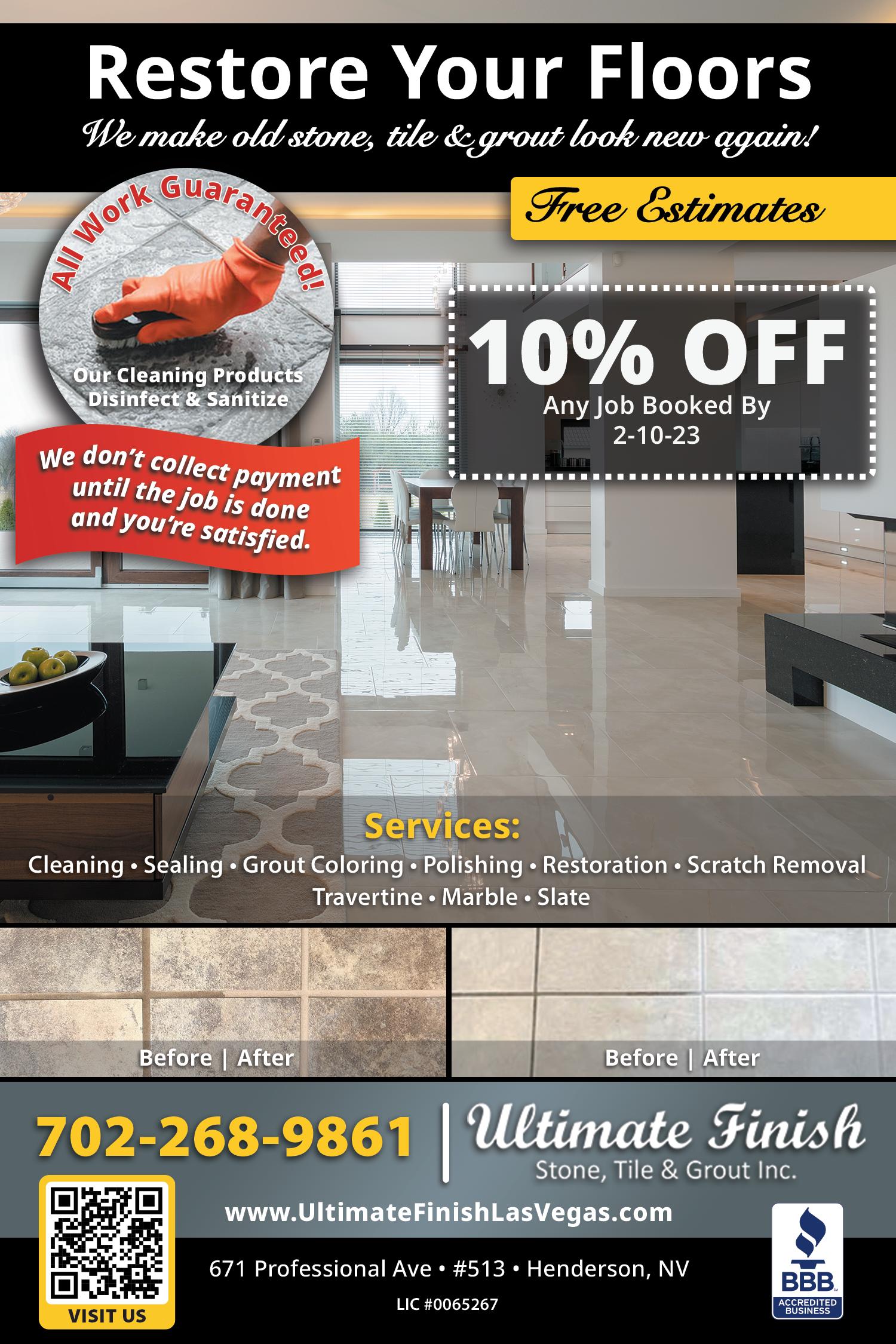 73 200,000 MAGAZINES MAILED EVERY 3 WEEKS TO PREFERRED HOMEOWNERS 702-706-1198 CALL TODAY FOR A FREE ESTIMATE! 702-706-1198 WWW.CTVEGAS.COM MAKING CONCRETE BEAUTIFUL SINCE 1998 DRIVEWAYS | GARAGES | INTERIORS | PATIOS | WALKWAYS | COURTYARDS | POOL DECKS | ROCK FEATURES RESEALING OPTIONS FOR ANY SURFACE MULTIPLE TEXTURE & COLORING OPTIONS MAINTENANCE PROGRAM AVAILABLE SLIP RESISTANT SURFACE TEXTURE & COATINGS WITH OPTIONS TOUCH-UP & RECOLORING OPTIONS $200DISCOUNT Minimum purchase required. Not valid with other offers. EXP 2/10/23. Bonded | Insured | Lic#: 59531 “They were very good to work with and did a great job. I have referred them to several people so I was pretty happy with them. Their pricing was good. I was extremely happy with the quality of the garage. I would use them again in the future.” — Gayle