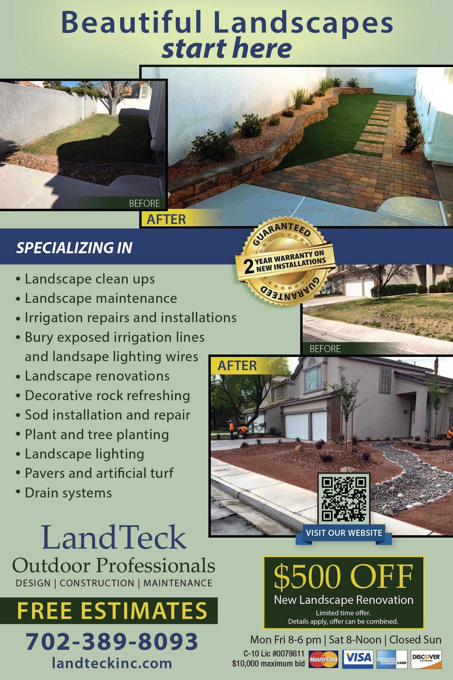 • Landscape Design • Landscape Renovation • Landscape Retaining Walls • Tree and Plant Installation • Synthetic Turf Installation • Pavers Installation • Irrigation System Installation • Lighting Inst allation and Repairs 702-487-3468 702-487-3468 CALL FOR A FREE ESTIMATE! License #0089655 | Bid Limit: $80,000 VISIT OUR WEBSITE! When you spend $5000. We take FOR VETERANS. $500OFF $500OFF $500OFF $500OFF $3.00 REBATE PER SQUARE FOOT $3.00 REBATE PER SQUARE FOOT Any Landscape Design, Synthetic Turf Installation, and Renovation At MBA Landscape Service we are extremely friendly and honest with our customers, for the past 10 plus years we’ve been in business. At the end of the day we are here for our customers. Our customers will benefit from synthetic turf installation, The Southern Nevada Water Authority will offer a due to the water smart initiative. 23 200,000 MAGAZINES MAILED EVERY 3 WEEKS TO PREFERRED HOMEOWNERS