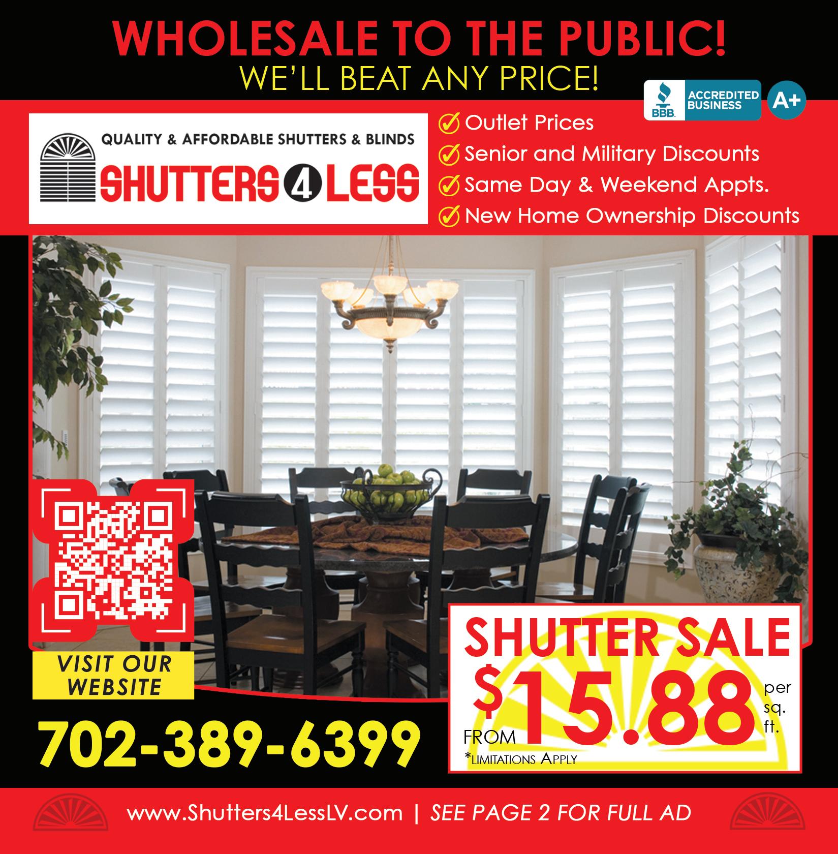 80 NOVEMBER 14 2022 | Local Professionals Only A Call Away | ImproveYourHouse.com ShuGalaxyers JUST GREAT SHUTTERS & BLINDS! Our sliding glass doors can be bi-pass or bi-folding! • Qual ity Wood or Poly Shutters • Not Over-Priced Poly • Not Plastic • Not Composite • Smooth And Stained Finishes • 2 1/2”, 3 1/2”, and 4 1/2” Louvers french door mountings and cutouts! 702-221-8002 Call today for a FREE In-Home Estimate! VISIT US! GALAXYSHUTTERS.COM Ask About Additional Discounts for Full House Installs ELEGANT DRAMATIC COST EFFECTIVE (more than 10 windows) NEW HOME BUYER SPECIAL 2” & 2 1/2 ” POLY BLINDS Fast Delivery Great Prices with Installation GORGEOUS BELL TOP SHUTTERS! $500 OFF ANY PURCHASE Ask for details. UP TO