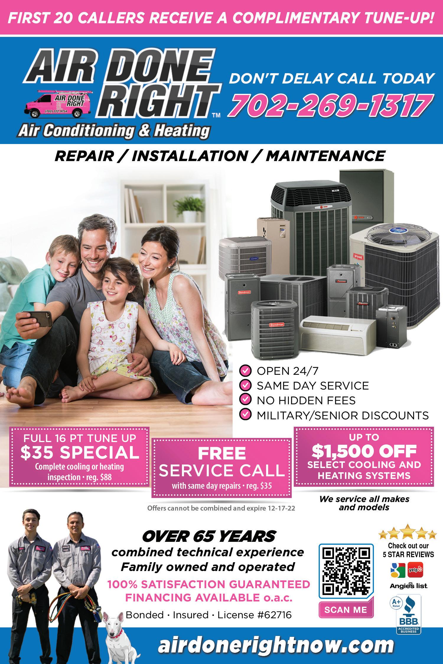 50 NOVEMBER 14 2022 | Local Professionals Only A Call Away | ImproveYourHouse.com 702.846.9557 call or text for a FREE estimate breathecleanlasvegas.com COMMERCIAL & RESIDENTIAL FREE 10% OFF FURNACE & HVAC CLEANING For All Active and Retired MILITARY, FIRE and POLICE DRYER VENT CLEANING with every air duct cleaning with every air duct cleaning Can be combined with other offers. NOT VALID WITH ANY OTHER OFFERS EXPIRES 12.17.22 IYH NOT VALID WITH ANY OTHER OFFERS EXPIRES 12.17.22 IYH FREE