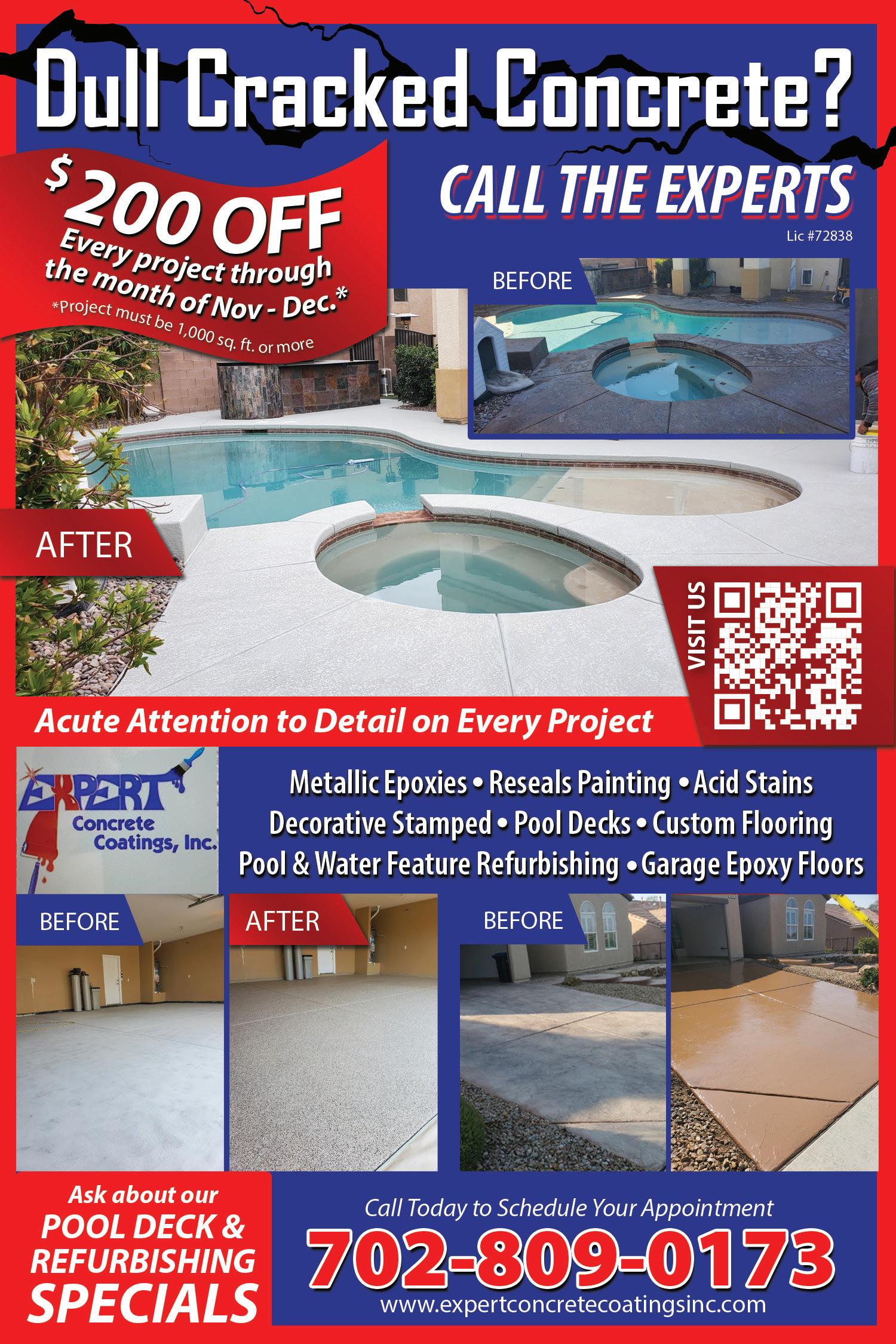 702-706-1198 CALL TODAY FOR A FREE ESTIMATE! 702-706-1198 WWW.CTVEGAS.COM MAKING CONCRETE BEAUTIFUL SINCE 1998 DRIVEWAYS | GARAGES | INTERIORS | PATIOS | WALKWAYS | COURTYARDS | POOL DECKS | ROCK FEATURES RESEALING OPTIONS FOR ANY SURFACE MULTIPLE TEXTURE & COLORING OPTIONS MAINTENANCE PROGRAM AVAILABLE SLIP RESISTANT SURFACE TEXTURE & COATINGS WITH OPTIONS TOUCH-UP & RECOLORING OPTIONS $200DISCOUNT Minimum purchase required. Not valid with other offers. EXP 12/17/22. Bonded | Insured | Lic#: 59531 “They were very good to work with and did a great job. I have referred them to several people so I was pretty happy with them. Their pricing was good. I was extremely happy with the quality of the garage. I would use them again in the future.” — Gayle 41 200,000 MAGAZINES MAILED EVERY 3 WEEKS TO PREFERRED HOMEOWNERS
