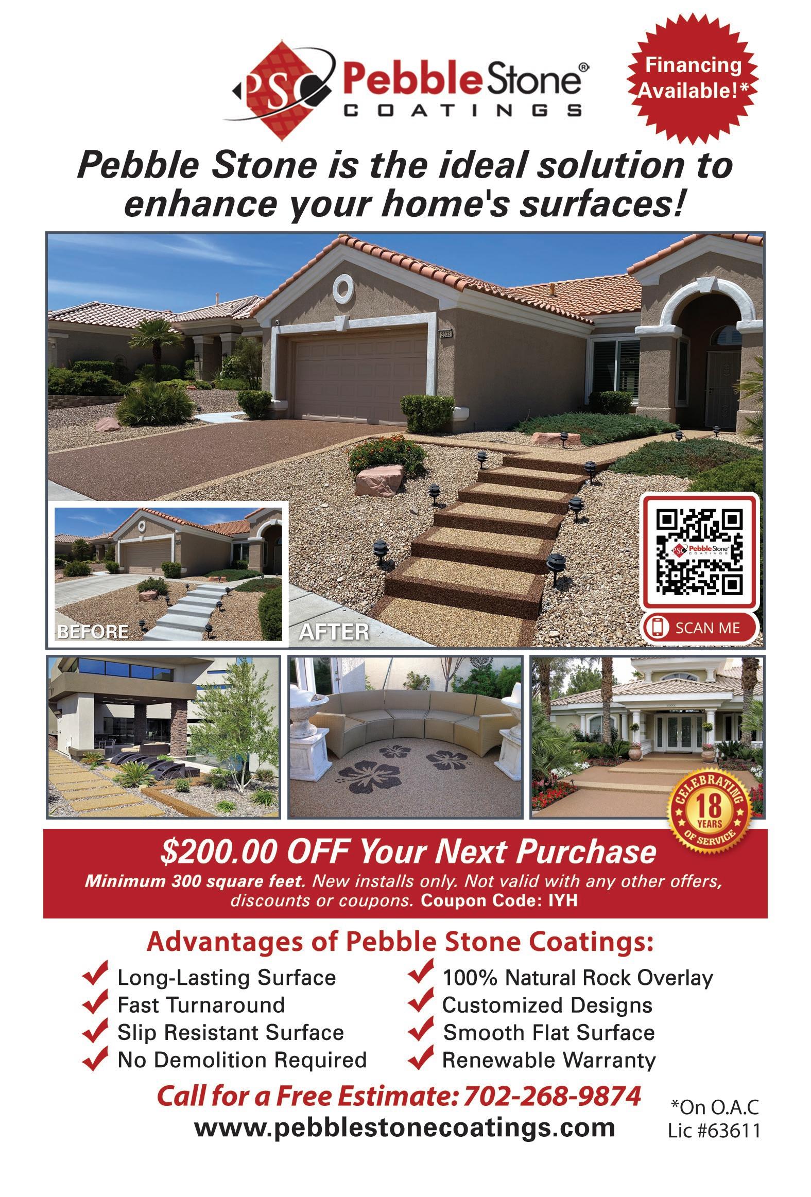 702-706-1198 CALL TODAY FOR A FREE ESTIMATE! 702-706-1198 WWW.CTVEGAS.COM MAKING CONCRETE BEAUTIFUL SINCE 1998 DRIVEWAYS | GARAGES | INTERIORS | PATIOS | WALKWAYS | COURTYARDS | POOL DECKS | ROCK FEATURES RESEALING OPTIONS FOR ANY SURFACE MULTIPLE TEXTURE & COLORING OPTIONS MAINTENANCE PROGRAM AVAILABLE SLIP RESISTANT SURFACE TEXTURE & COATINGS WITH OPTIONS TOUCH-UP & RECOLORING OPTIONS $200DISCOUNT Minimum purchase required. Not valid with other offers. EXP 11/26/22. Bonded | Insured | Lic#: 59531 “They were very good to work with and did a great job. I have referred them to several people so I was pretty happy with them. Their pricing was good. I was extremely happy with the quality of the garage. I would use them again in the future.” — Gayle 79200,000 MAGAZINES MAILED EVERY 3 WEEKS TO PREFERRED HOMEOWNERS