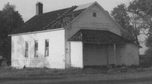 Historical Society records report that Woodyard School shown at right in this 1976 photograph was built in 1895. Building characteristics include a front gabled roof and clapboard wall material. Its shed roof side addition and a brick interior chimney were constructed in 1903. (Wisconsin Historical Society 1976)