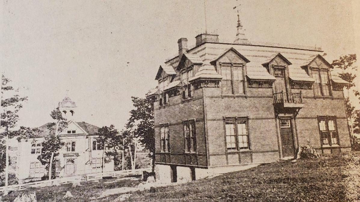 High School and Graded School 1885 - 1890 | The photographbelow combined with the photos on pages 6 and 7 show the progression of Shell Lake school construction in the late 1800s.The initial central part of the two story school in the background was constructed in 1885.The graded school in the foreground of the photo on the right was constructed in 1890.These two schools could accommodate up to 350 students.Tree stumps were still present on the lawn at the time of this photo indicating it being taken near the grade school’s 1890 construction date. (Stouffer 1961, P. 116) (Hoar 1968, P. 98)