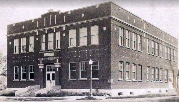 1917 Brick High School | The photo at right shows the brick high school constructed in 1917 to replace the high school destroyed by fire. Enrollment in the 1917-1918 school year totaled 136 high school students and 228 grade school students.The school had an estimated cost of $29,563. Four additions occurred during its 76 plus years of use that ended in 1993 when a new school was constructed on the south side of town.This school building was razed in 1994. (Stouffer 1961, P.11; Cardcow Postcard, Date Unknown)
