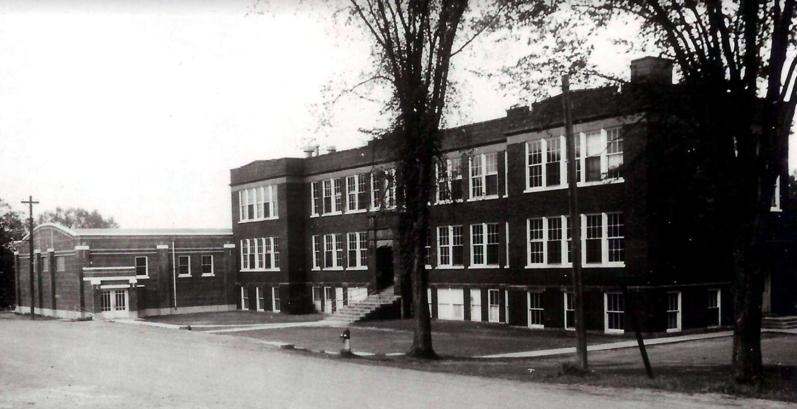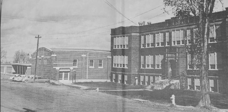 1940s GymnasiumAddition to 1917 High School | The photo at right, shows the gymnasium expansion that was completed in the early 1940s.The School Board in 1940 authorizeda loan of $2,400 for the gymnasium, later they approved a loan of $29,983.After thatfederal Works ProjectsAdministration - W.P.A. funding was awarded for its construction with an estimated cost of$50,000. In 1946 the School was presented with an electric clock and scoreboard as a gift from Mrs. MableAllen. (Stouffer1961,